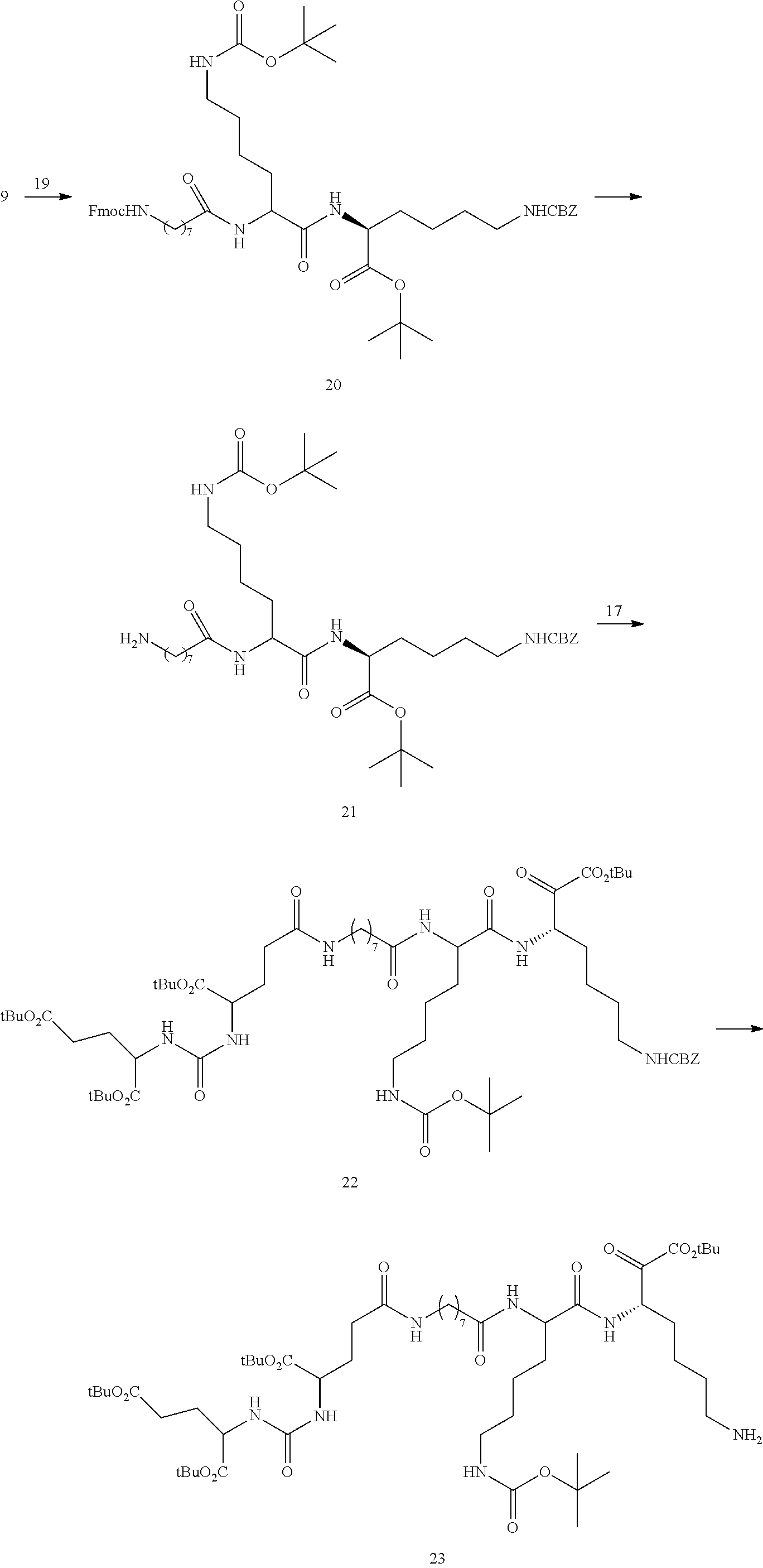 Cell Culture. The PSMA expressing human prostate cancer cell line, LNCaP, was obtained from the American Type Culture Collection. Cell culture supplies were obtained from Invitrogen unless otherwise noted. LNCaP cells were maintained in RPMI-1640 medium supplemented with 10% fetal bovine serum (Hyclone), 4 mM L-glutamine, 1 mM sodium pyruvate, 10 mM N-2-hydroxyethylpiperazine-N-2-ethanesulfonic acid (HEPES), 2.5 mg/mL D-glucose, and 50 μg/mL gentamicin in a humidified incubator at 37° C./5% CO2. Cells were removed from flasks for passage or for transfer to 12-well assay plates by incubating them with 0.25% trypsin/ethylenediaminetetraacetic acid (EDTA).
