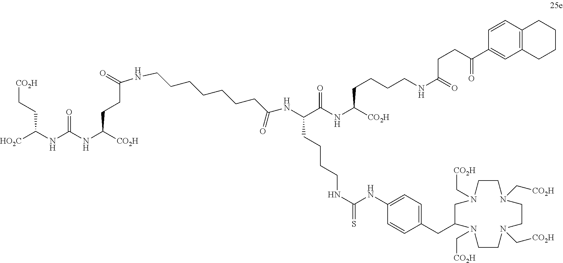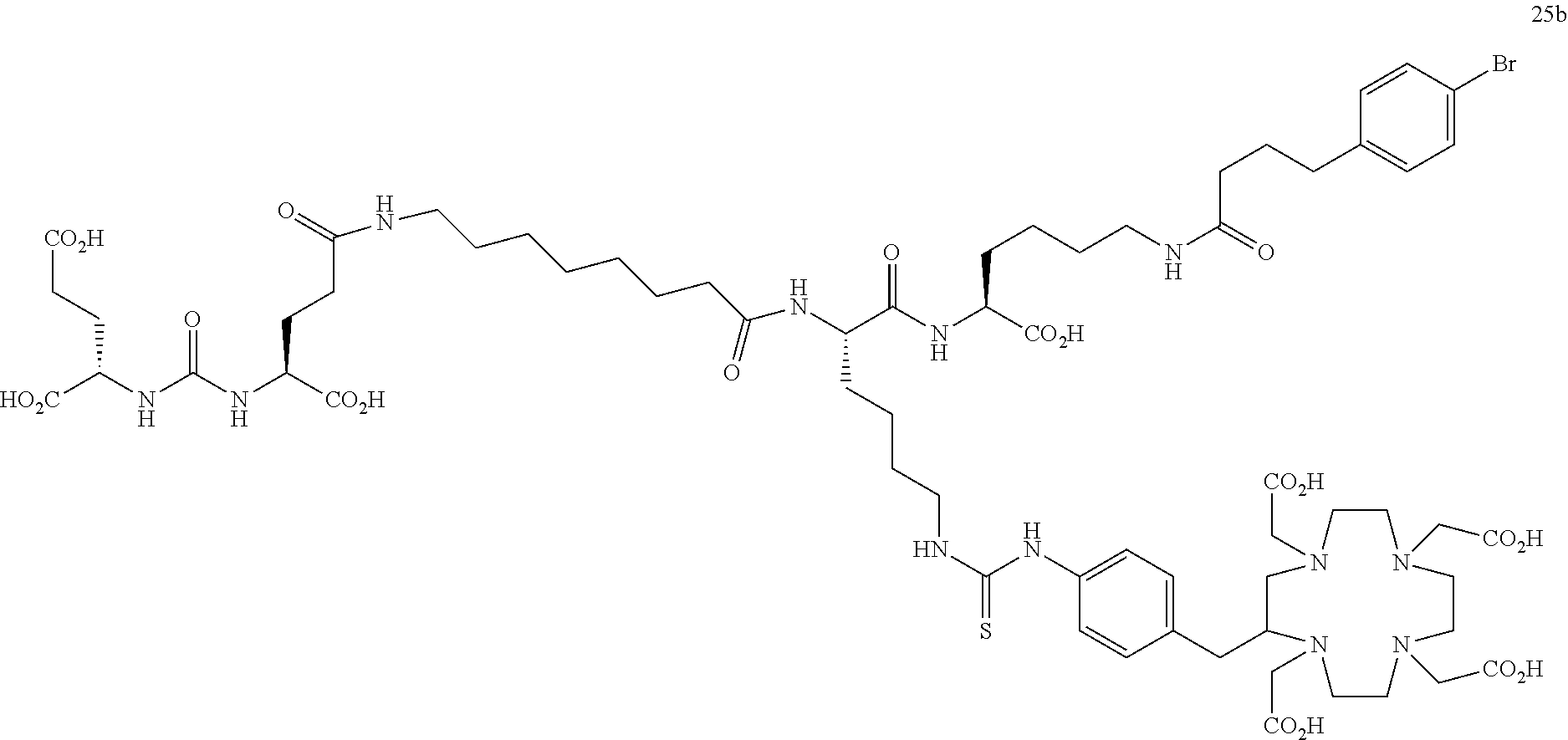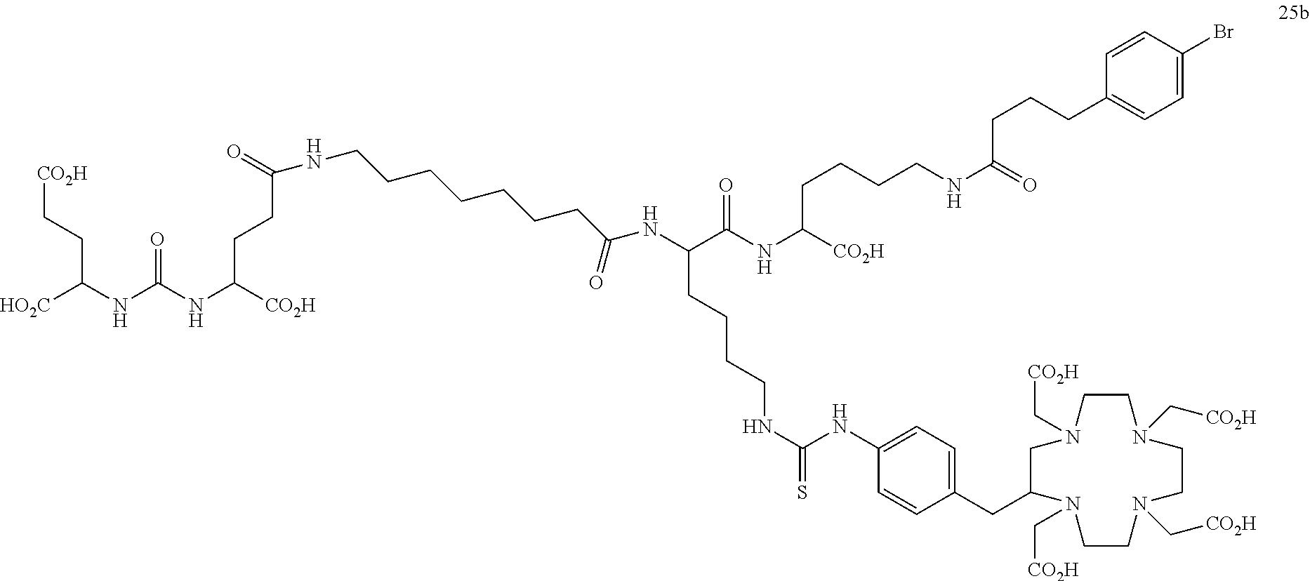 FIG. 7 provides PET images of LNCaP xenograft mice with66Ga-labeled tracers at 1 h, 3 h, 6 h and 24 h post injection. Mice were injected intravenously with a bolus injection of 0.56-5.4 MBq (15-145 μCi) of the tracer. The total mass of ligand injected was 4 μg. Prior to imaging, the mice were anesthetized with isoflurane and then imaged for 30 min. The images were corrected for decay and for activity injected.