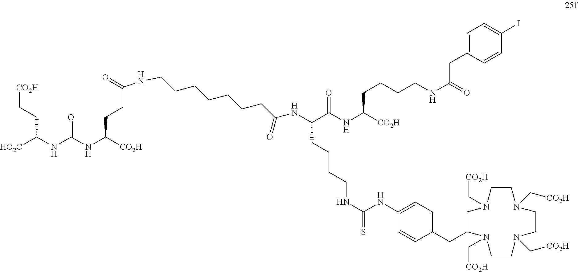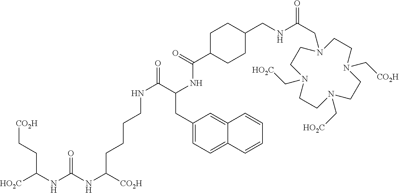 In vitro determination of IC50. IC50values of the non-labeled, metal-free ligands were determined by screening in a multi-concentration competitive binding assay against99mTc-((7S,12S,16S)-1-(1-(carboxymethyl)-1H-imidazol-2-yl)-2-((1-(carboxymethyl)-1H-imidazol-2-yl)methyl)-9,14-dioxo-2,8,13,15-tetraazaoctadecane-7,12,16,18-tetracarboxylic acid technetium tricarbonyl complex) (99mTc-MIP-1427), with Kd=0.64±0.46 nM [1] for binding to PSMA on LNCaP cells, according to previously described methods [2] with small modifications. Briefly, LNCaP cells were plated 72 h prior to the experiment to achieve a density of approximately 5×105cells/well (in triplicate) in RPMI-1640 medium supplemented with 0.25% bovine serum albumin. The cells were incubated for 2 h with 1 nM99mTc-MIP-1427 in RPMI-1640 medium containing 0.00125% w/v bovine serum albumin [3] in the presence of 0.001-10,000 nM test compounds. Radioactive incubation media was then removed by pipette and the cells were washed twice using 1 mL ice-cold PBS 1× solution. Cells were harvested from the plates following treatment with 1 mL 1M NaOH and transferred to tubes for radioactive counting using a 2470 Wizard2Automatic Gamma Counter (Perkin Elmer). Standard solutions (10% of activity added to each well) were prepared to enable decay correction. Cell-specific activity was corrected for non-specific binding of99mTc-MIP-1427. IC50values were determined by fitting the data points to a sigmoidal Hills1 curve in Origin software.