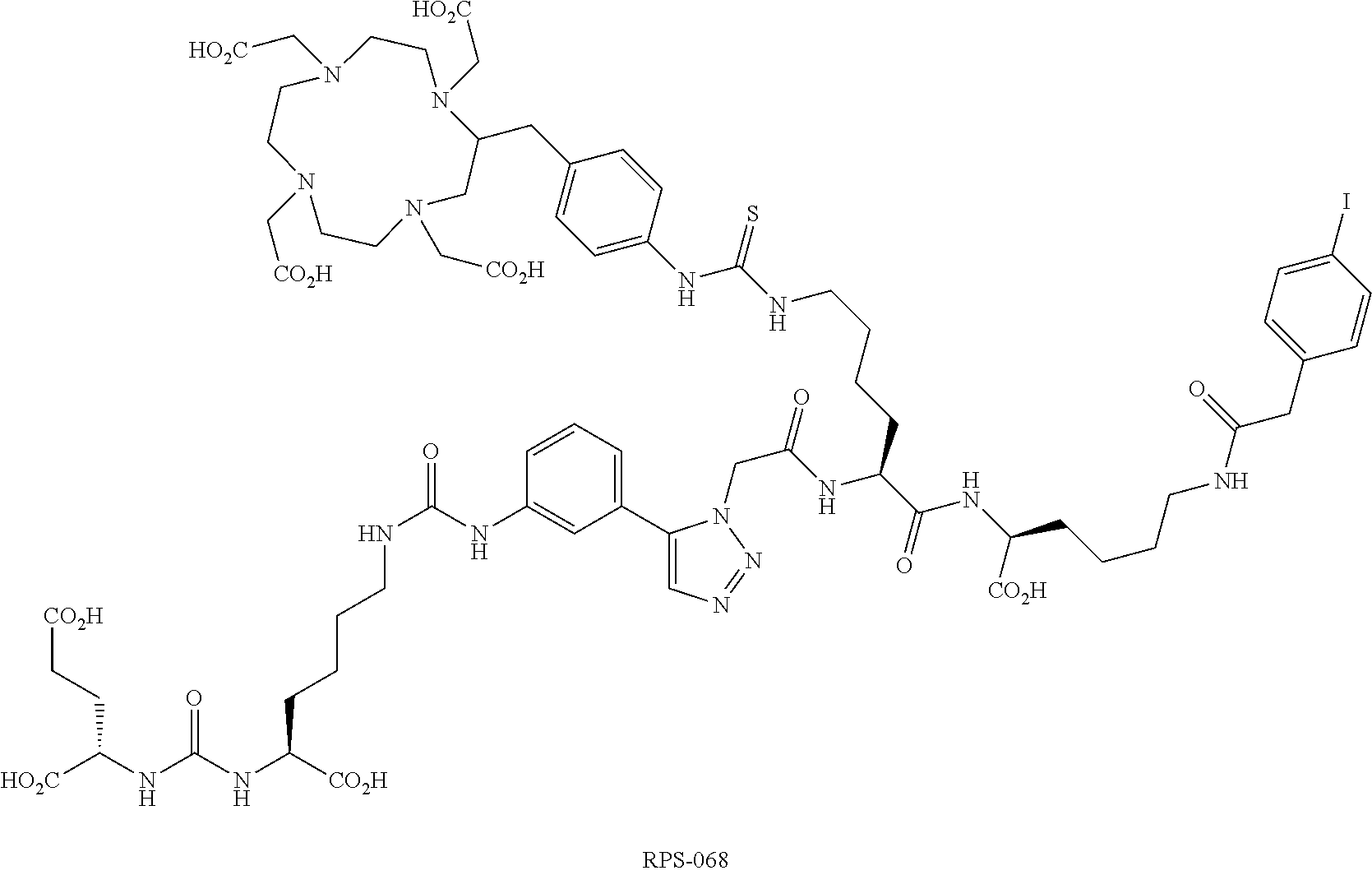 FIG. 1 provides PET images of mice injected with68Ga-RPS-055 (top) or68Ga-DKFZ-617 (bottom) both 1 h and 3 h post injection. All images are of the same mouse bearing a small LNCaP tumor in the right shoulder (arrow). Images were taken on sequential days using a Siemens Inveon μPET/μCT system (Siemens Corp., Munich, Germany). All images were windowed to a maximum of 4% injected dose per cc tissue and are decay corrected and dose corrected.