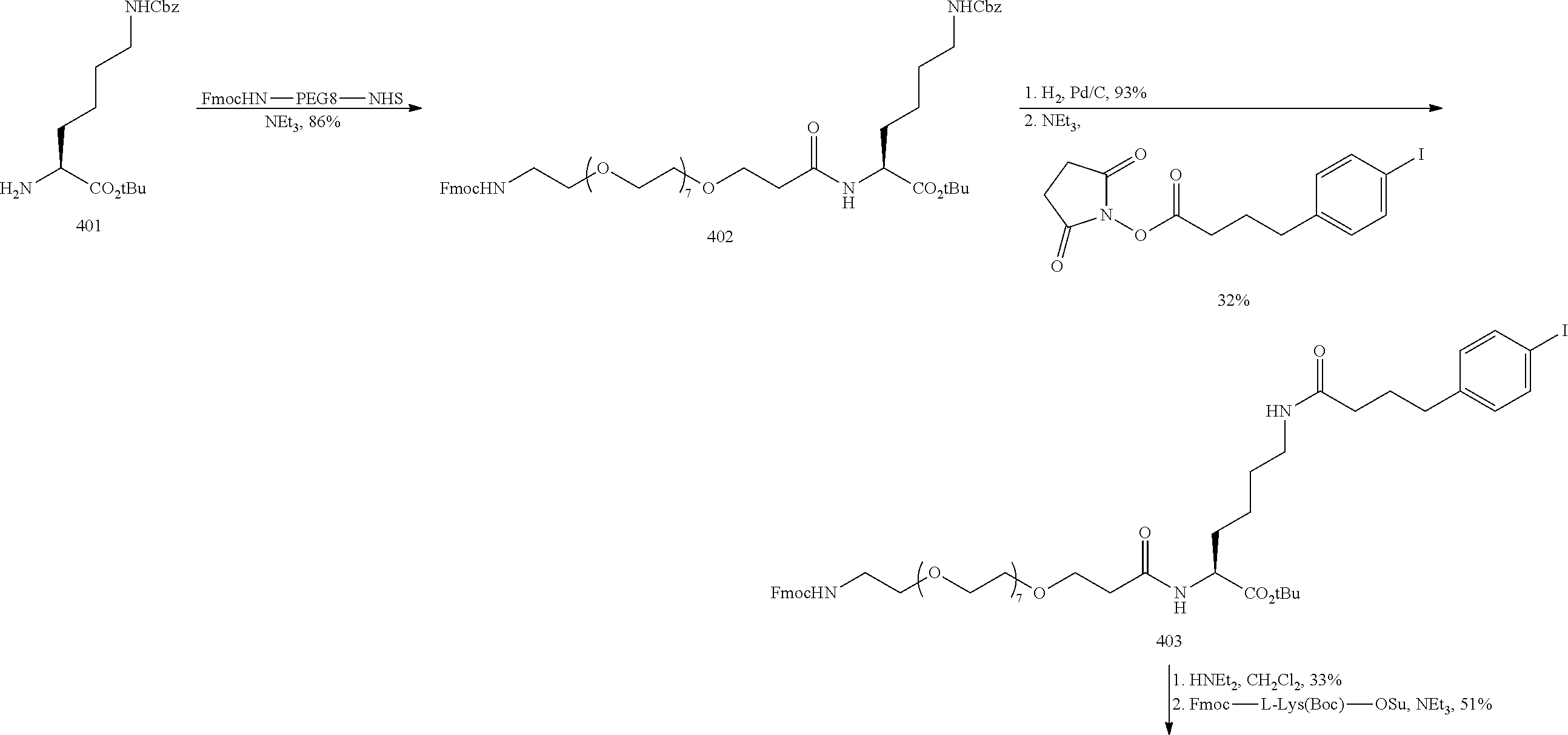 Preparation of tert-Butyl N2-((S)-10-((((9H-fluoren-9-yl)methoxy)carbonyl)amino)-2,2-dimethyl-4,11-dioxo-3,15,18,21,24,27,30,33,36-nonaoxa-5,12-diazanonatriacontan-39-oyl)-N6-(4-(4-iodophenyl)butanoyl)-L-lysinate (404). A solution of 403 (360 mg, 0.32 mmol) and diethylamine (0.67 mL, 6.48 mmol) in CH2Cl2(2 mL) was stirred at room temperature for 7 h. The solution was concentrated under reduced pressure and the crude residue was purified by flash chromatography (0-30% MeOH in CH2Cl2). The fractions containing the product were combined and concentrated to give the amine as a yellow oil (96 mg, 33%). Mass (ESI+): 899.2 [M+H]+. Calc. Mass: 897.4. To a solution of the amine (96 mg, 107 μmol) and Fmoc-L-Lys(Boc)-OSu (62 mg, 110 μmol) in CH2Cl2(5 mL) was added TEA (28 μL, 200 μmol). The mixture was stirred overnight at room temperature under Ar. The solvent was removed under reduced pressure and the crude product was purified by flash chromatography (0-30% MeOH in CH2Cl2). The desired product co-eluted with a minor impurity, therefore the mixture was purified a second time by prep TLC (10% v/v MeOH/CH2Cl2). Compound 404 was isolated as a colorless oil (78 mg, 51%). Mass (ESI+): 1349.0 [M+H]+. Calc. Mass: 1347.6.