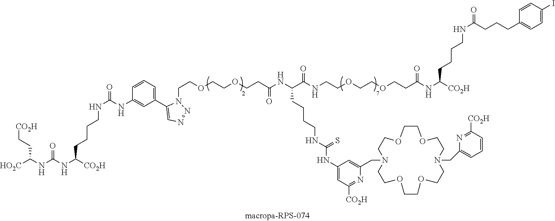 Compound 408 (33 mg, 16 μmol) was dissolved in CH2Cl2(2 mL). Then TFA (0.5 mL) was added and the reaction was stirred overnight at room temperature. The solvent was removed under N2flow and the crude product was lyophilized to give a white residue (22 mg, 83%). Mass (ESI+): 832.0 [(M+2H)/2]+. Calc. Mass: 1661.8. To a solution of the free amine (13 mg, 7.8 μmol) and TEA (0.22 mL, 1.56 mmol) in DMF (1 mL) was added a solution of macropa-NCS (6 mg, 10 μmol) in DMF (1 mL). The resulting mixture was stirred for 90 min at room temperature. The reaction was concentrated under reduced pressure and the crude product was purified by prep HPLC. The peak corresponding to the desired product was collected and lyophilized to give macropa-RPS-074 as a white powder (4.5 mg, 26%). Mass (ESI+): 1126.6 [(M+2H)/2]+. Calc. Mass: 2251.3.