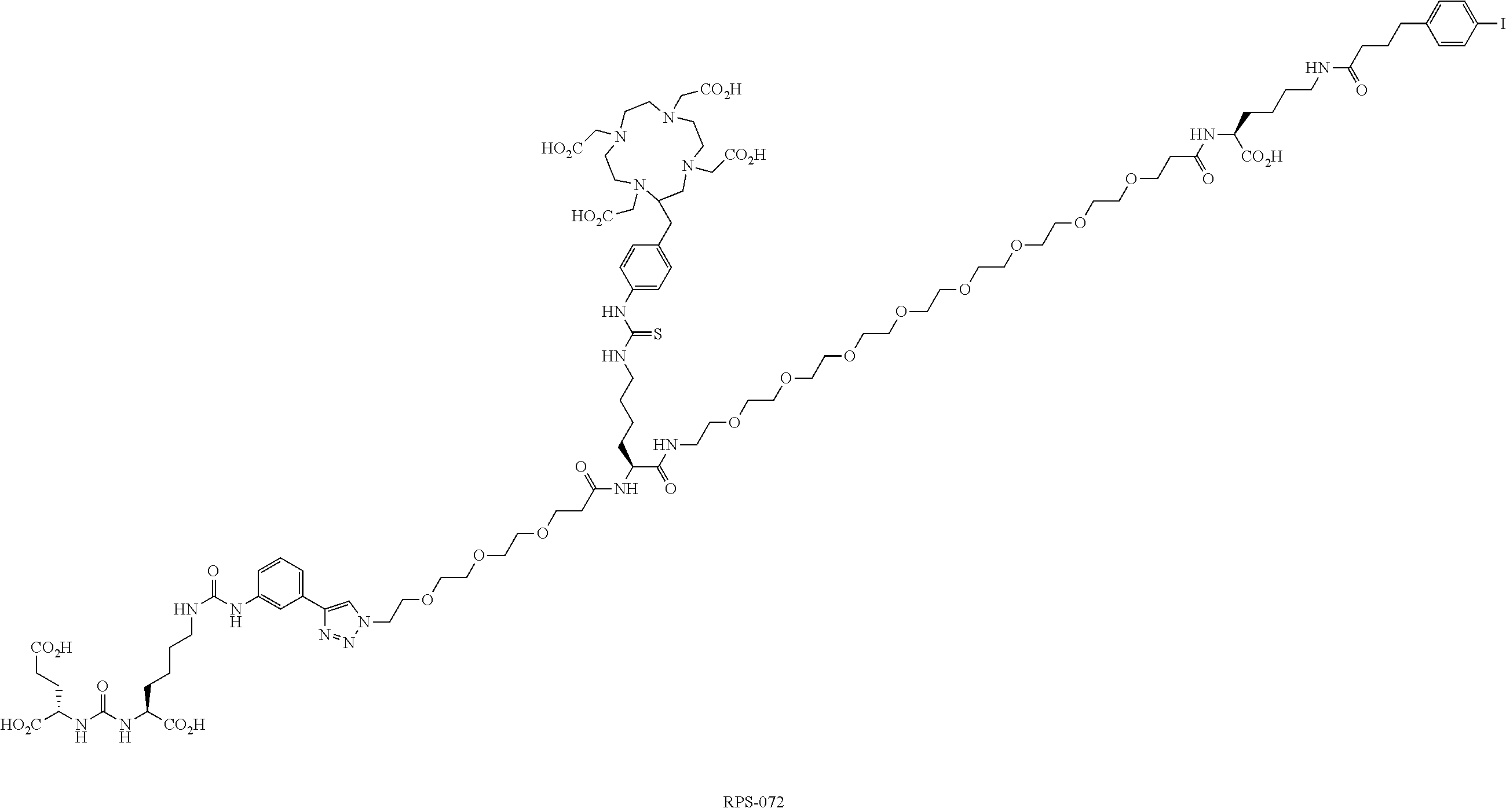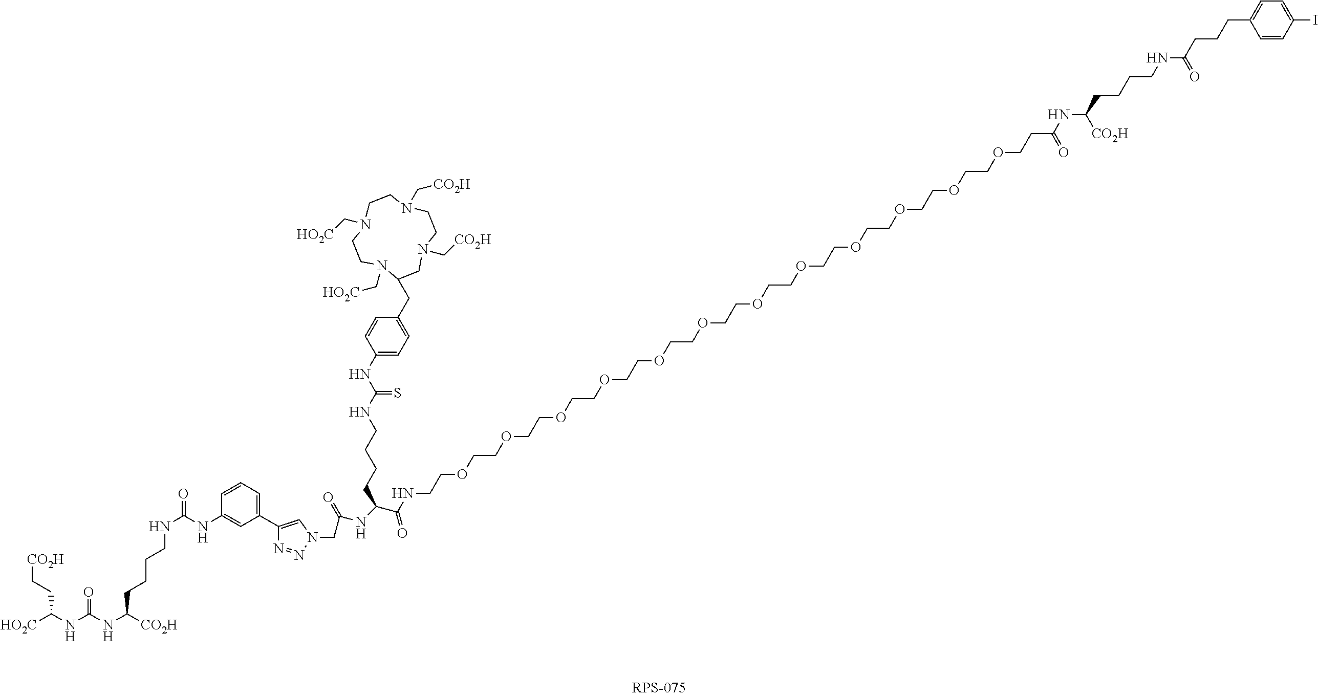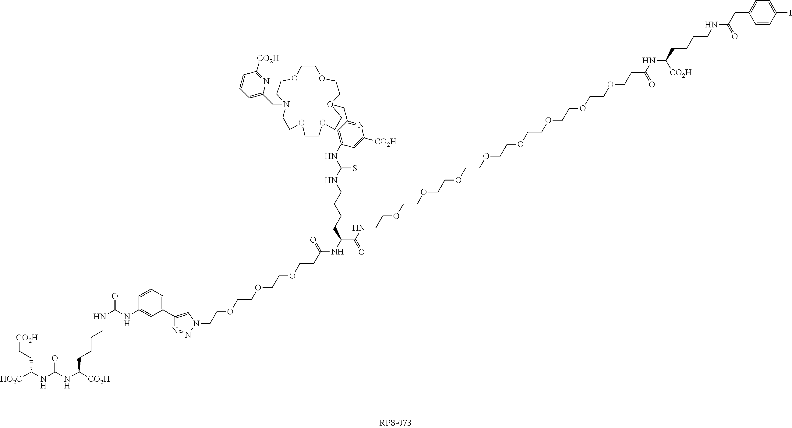 LNCaP xenograft were randomly assigned to 5 groups and treated with a bolus injection of 148 kBq and 93 ng (41 pmol)225Ac-RPS-074, 74 kBq and 47 ng (21 pmol)225Ac-RPS-074, 37 kBq and 23 ng (10 pmol)225Ac-RPS-074, 133 kBq225Ac-DOTA-Lys-IPBA, or vehicle control. A significant antitumor effect was observed in the mice treated with 138 kBq and 74 kBq of225Ac-RPS-074. In the 138 kBq treatment group, 6/7 (86%) of tumors were not detectable (<0.5 mm3) at 75 d post injection, while 1/7 (14%) of tumors were not detectable in the 74 kBq group. The distribution of initial tumor volumes was 100-624 mm3and 64-455 mm3for the two groups, respectively (FIG. 13). Tumor volume decreased in the 74 kBq group for as much as 42 d post injection before 6/7 (86%) of tumor volumes began to increase again. The absence of tumors was confirmed by μPET/CT imaging with68Ga-PSMA-11 (FIG. 14) prior to the collection of samples for pathology. Those tumors that re-emerged in the 74 kBq treatment group were shown by imaging to express PSMA. Physiologic uptake was also evident in the kidneys and salivary glands.