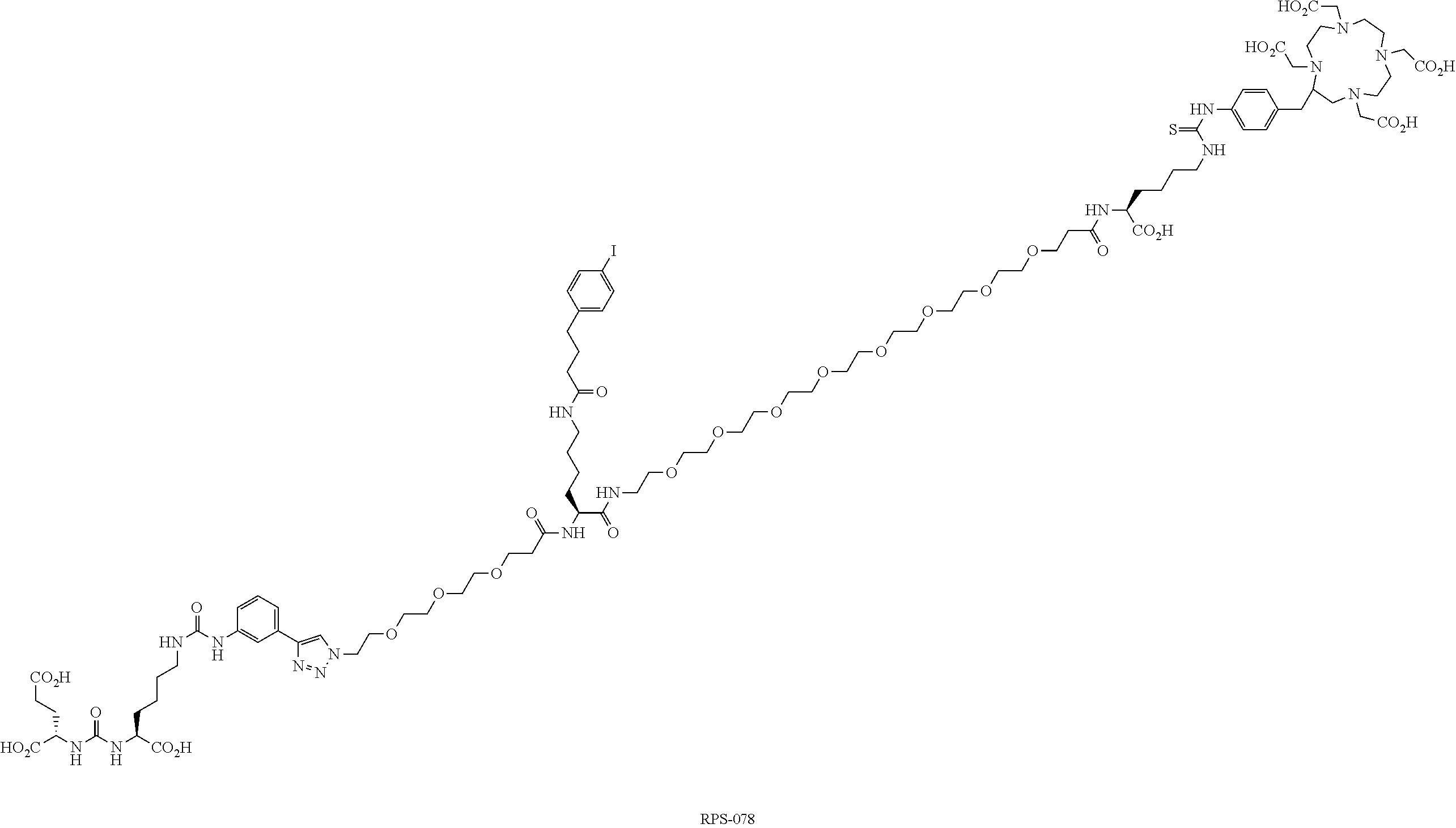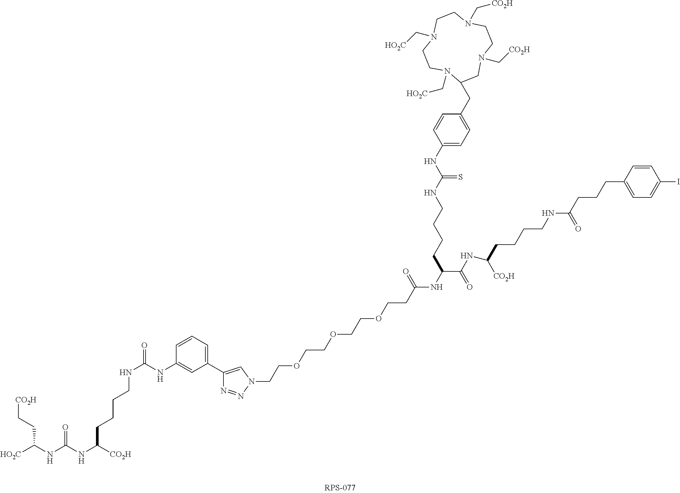 FIG. 10 provides time-activity curves (TAC) of tumor and kidney uptake of177Lu-PSMA-617,177Lu-RPS-061,177Lu-RPS-063,177Lu-RPS-066,177Lu-RPS-067,177Lu-RPS-068 and177Lu-RPS-069 in male athymic nude mice bearing LNCaP xenograft tumors. Uptake is expressed as % ID/g.