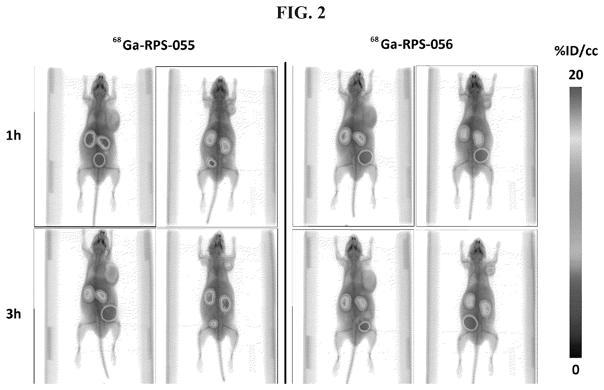 FIG. 2 provides PET images of mice injected with68Ga-RPS-055 (left panels) or 68G-RPS-056 (right panels) both 1 h (top) and 3 h (bottom) post injection. All images are of the same mice bearing small LNCaP tumors in their right shoulders. Images were taken on sequential days usings a Siemens Inveon μPET/μCT system (Siemens Corp., Munich, Germany). All images were windowed to a maximum of 20% injected dose per cc tissue and are decay corrected and dose corrected.