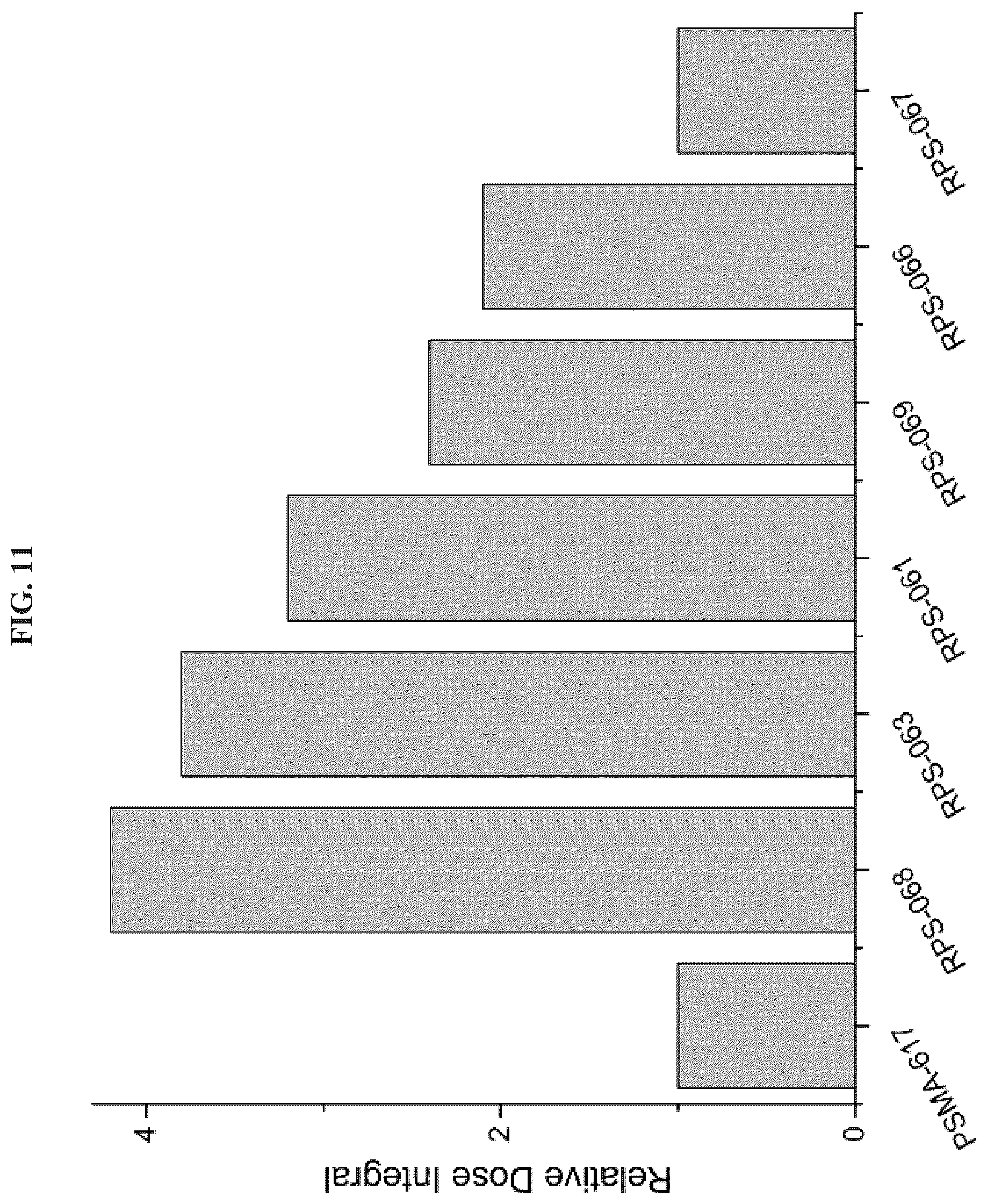 FIG. 11 provides a comparison of relative dose integral in the tumor of male LNCaP xenograft tumor-bearing mice injected with the corresponding177Lu-labeled compounds and studied over 96 h. Values are normalized to177Lu-PSMA-617.