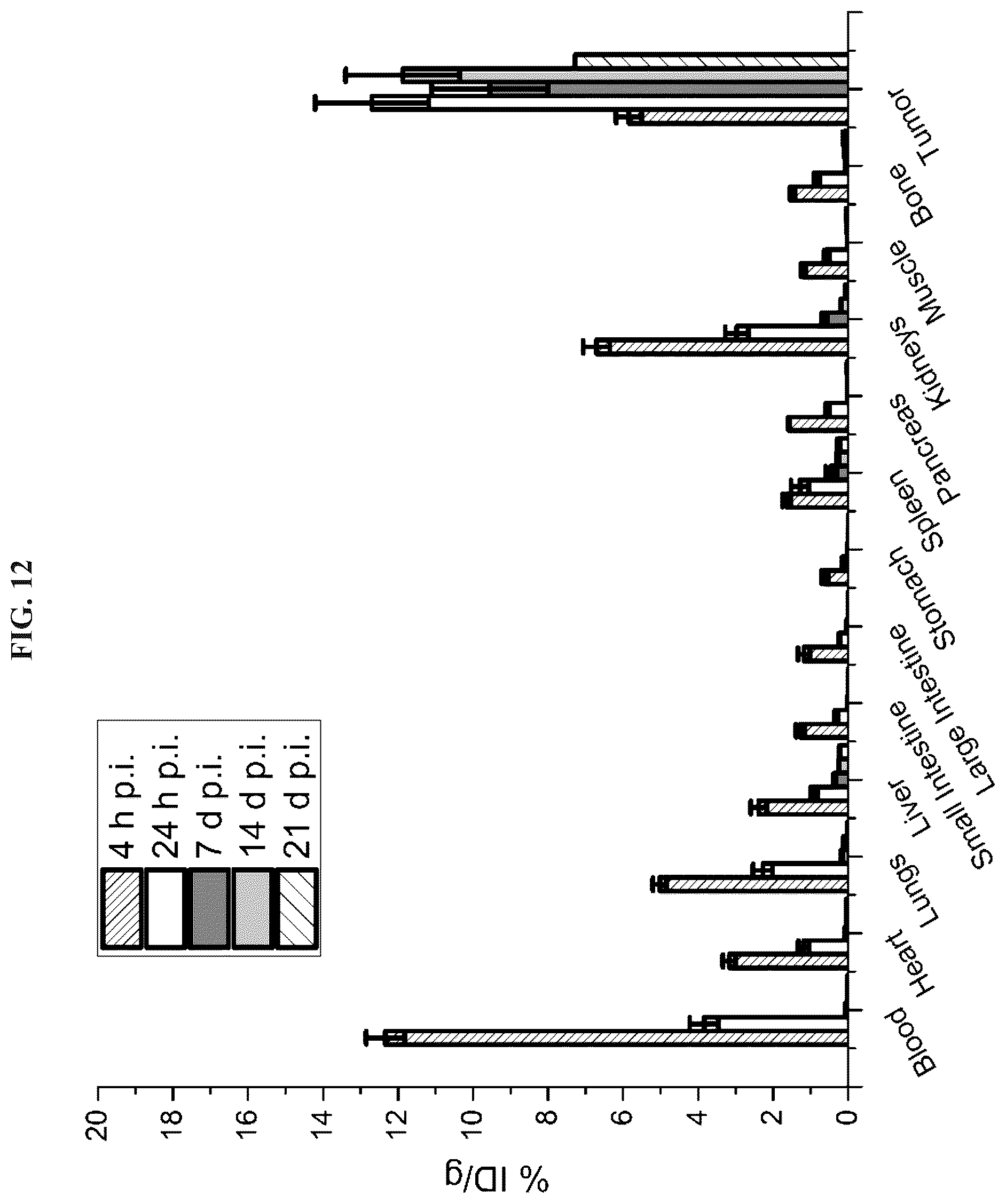 FIG. 12 shows the uptake of activity in blood, normal tissue and tumor in male BALB/C nu/nu mice bearing LNCaP xenograft tumors. Mice (n=4/time point) were injected intravenously with 105 kBq225Ac-RPS-074 and sacrificed at 4 h, 24 h, 7 d, 14 d and 21 d p.i.