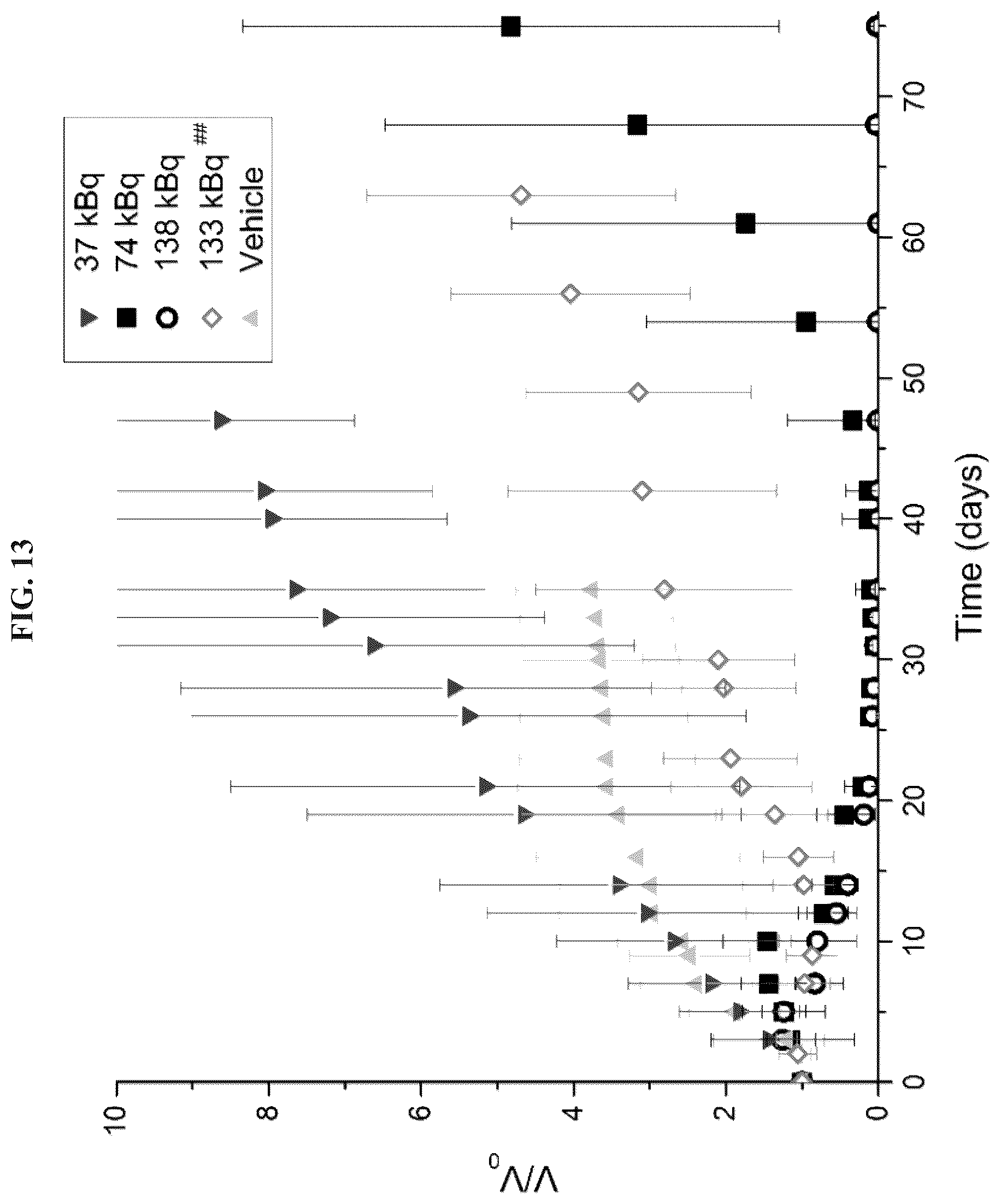 FIG. 13 demonstrates that both the 37 kBq treatment group and the positive control group, which received 133 kBq225Ac-DOTA-Lys-IPBA, showed an initial effect relative to the vehicle group, but tumor volumes increased from a starting volume of 99-331 mm3and 233-859 mm3, respectively, to a final volume of greater than 2000 mm3. A clear dose-repsponse was evident in this study. Up to 42 days p.i., the 74 kBq and 138 kBq treatment groups behaved similarly, but while the tumor volume of 5/7 (71%) of mice in the former group was measured to be less than 1 mm3, the tumors progressively returned. In contrast, the tumors of the mice in the 37 kBq treatment group appeared to grow at a similar rate to the untreated tumors.