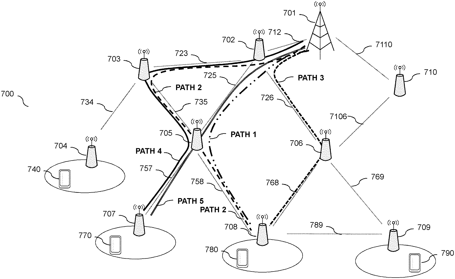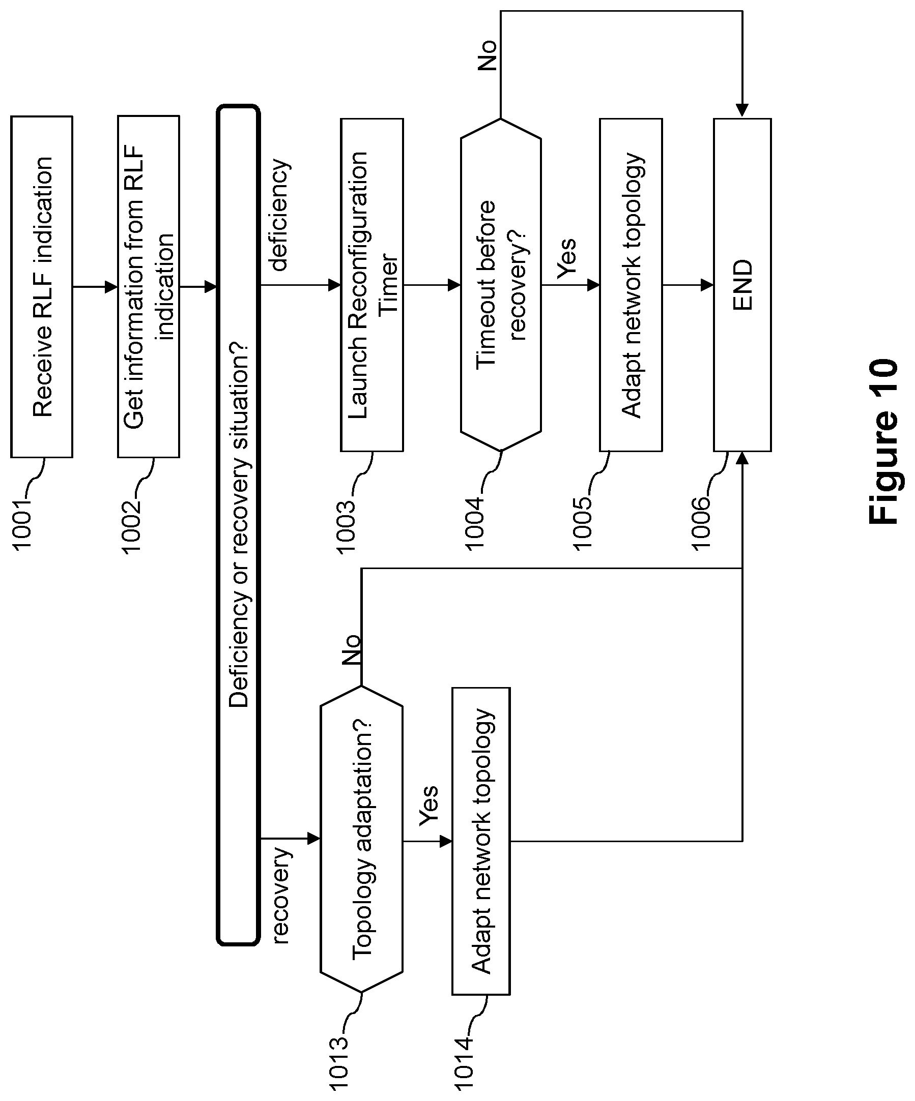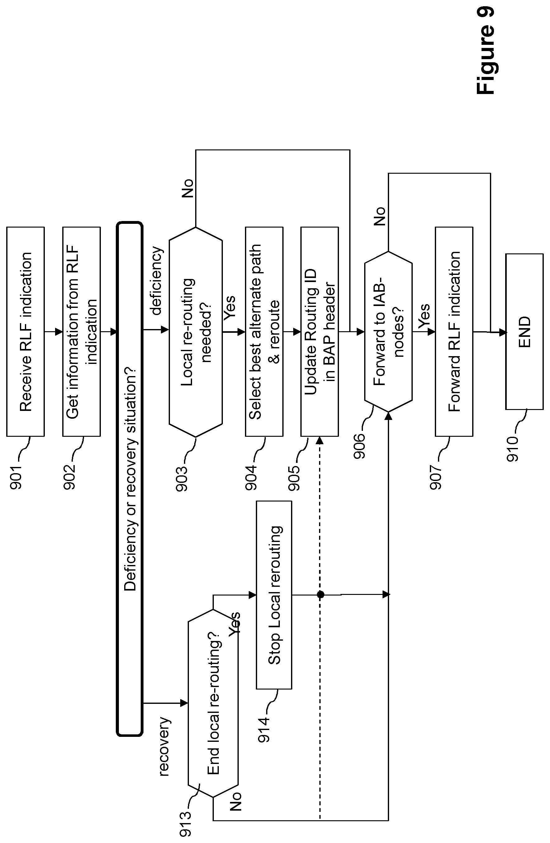 In a variant, the routing IAB-node selects a BAP path previously used by the IAB-node for routing packets over the IAB network. Any combination of the aforementioned selection schemes may be considered. During step 904, incoming BAP packets are actually rerouted to the selected alternate BAP path or paths, given the original Routing ID specified in the incoming BAP packets. Optionally, to facilitate forwarding by other routing IAB-nodes, the routing IAB-node may update a BAP routing identifier of the rerouted BAP packets to specify the alternate BAP path used. Note that for an initiator IAB-node, step 904 consists in determining an alternate BAP paths to the one it should select normally. Optional step 905 may consist for the routing IAB-node to update the RLF Indication Entries 610 with local estimations of its BH radio links. For instance, if the routing IAB-node estimates that one of its egress BH radio links used by a BAP path has radio conditions worse than the received Quality information 622 of that BAP path, it may accordingly update this Quality information. This will help other routing IAB-nodes to efficiently determine the opportunity to perform rerouting or not, and to choose the best alternate BAP path. Preferably, the update is only made based on an estimated quality/congestion level of the BH radio link over which the BH RLF Indication message 600 Step 905 may thus consist in updating link condition information 622 specified within the message 600 Next to step 905, the routing IAB-node checks, at step 906, whether it should forward the received BH RLF Indication message 600 The routing IAB-node forwards the received BH RLF Indication message 600 For instance, if the BH RLF Indication message 600 If the BH RLF Indication message 600 In some embodiments, the routing IAB-node checks whether it should forward the BH RLF Indication message 600 Also, if field 714 indicates that the received message 600 Of course, if the routing IAB-node is also the sharing IAB-node (i.e. if field 624 identifies the routing IAB-node), there is no need to try to forward the message 600 The process then ends at step 910. Turning now to the recovery situation (i.e. the received message 600 The routing IAB-node first checks, at step 913, whether it should stop performing any local re-routing initiated in a former step 904. The decision is based on the information retrieved from received message 600 The routing IAB-node may for example estimate whether the situation is back to normal, meaning there is no more RLF or the link quality/congestion level has reached an acceptable level. In the negative, the process continues at step 906 to forward the received message 600 In the affirmative, the routing IAB-node decides at step 914 to stop locally re-routing incoming BAP packets that use an impacted (now improved or recovered) BAP path. If no impacted BAP path is signalled in the message 600 As the former BAP path is used again, no update of the BAP header of the new incoming BAP packets is required because they include the default one. Next to step 914, the process goes to step 906 to forward the received message 600 The description turns now to an exemplary process at the IAB-Donor receiving the BH RLF Indication message 600 The process thus starts upon receiving a BH RLF Indication message 600 The IAB-Donor retrieves, at step 1002, information embedded in fields 611 to 624 (more generally in the entry or entries 610). This information makes it possible for the IAB-Donor to known whether a new deficient or recovery situation is signalled. For instance, field 602 may be used. In variants, values from Quality information field 622 may be used (for instance to be compared to known values for BAP paths). Depending on this information, the IAB-donor may decide to reconfigure IAB-nodes to adapt to the topology of the IAB-network. It means the IAB-donor may adapt the routing configuration of the IAB-nodes In case the message 600 The Reconfiguration Timer is however optional, meaning the routing configuration adaptation may be immediately initiated at step 1005, by skipping steps 1003 and 1004. Expiry of the timer is detected through step 1004. If it is stopped, no routing configuration adaptation is made and the process ends at step 1006. Otherwise, a routing configuration adaptation to the network topology is made given the notified deficiency. This adaption may merely consist in configuring the BAP routing configuration tables of one or more IAB-nodes in the IAB network. For example, the impacted BAP paths listed in message 600 In addition, these BAP paths may allow the IAB-Donor to identify the deficient BH radio link (as the common radio link between all the impacted BAP paths). Consequently, the routing configuration of the IAB-nodes may be modified to avoid using this deficient BH radio link. More generally, the routing configuration of the IAB-nodes may be adapted by withdrawing, from it, one or more BAP paths involving the BH radio link when the received message 600 For example, upon receiving a BH RLF Indication message 600 The process ends at step 1006 after step 1005. Turning now to the recovery situation (i.e. the received message 600 In case, the IAB-Donor estimates that the situation is back to normal or at least has improved in a sufficient way, it adapts, at step 1014, the routing configuration of IAB-nodes to the improved network topology. This may be done with a view of restoring all or part of the former routing configurations it had set up before detecting a deficiency situation and performing a former routing configuration adaptation at step 1005. More generally, the routing configuration of the IAB-nodes may be adapted by reintroducing, in the routing configuration, one or more impacted BAP paths involving the deficient BH radio link when the received message 600 This adaption may merely consist in configuring the BAP routing configuration tables of one or more IAB-nodes in the IAB network