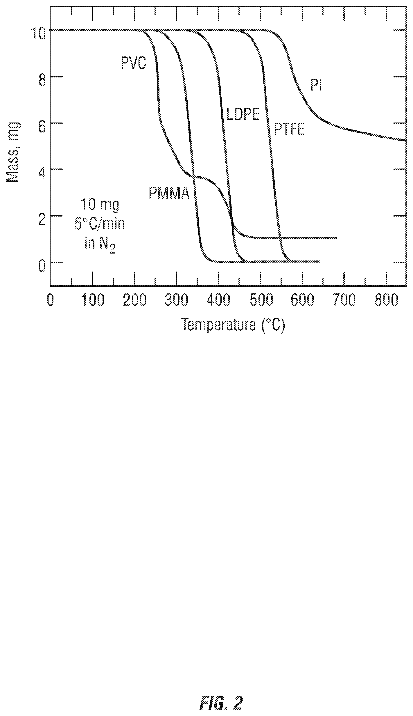 FIG. 2 shows a thermogravimetric analysis (TGA) comparison of processing chlorinated compounds (PVC) to fluorinated compounds (PTFE, Teflon, a common PFAS polymer).