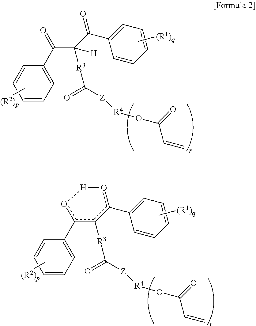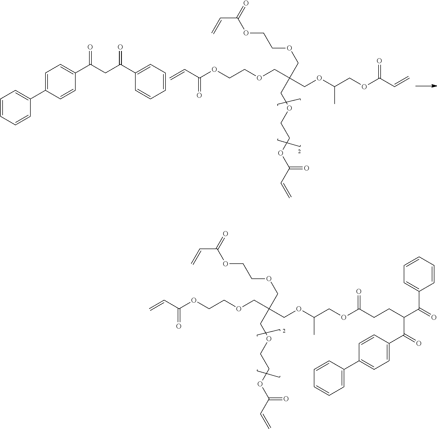 i. Norrish Type I photoinitiators decompose upon irradiation via homolytic bond cleavage to afford radicals that directly initiate the radical chain reaction of vinyl-containing monomers, such as acrylates and methacrylates. Typical representatives of Type I photoinitiators include acetophenone derivatives, such as α-hydroxylacetophenones and α-aminoacetophenones. The chemical structure of these compounds comprises a tetrasubstituted carbon atom (i.e. one that does not comprise hydrogen substituents) adjacent to an Ar—C═O group. Efficient photochemical cleavage between the C═O-group and the α-carbon atom leads to the formation of radicals, which add to the double bond of the polymerizable component (monomer or polymer), initiating polymerization. Examples of Type I initiators are disclosed in U.S. Pat. Nos. 7,407,707B2, 7,232,540 and 7,291,658B2. The compounds described form by the Michael addition of acrylate monomers and oligomers with aliphatic beta-keto esters, beta-diketones (e.g. 2,4-pentanedione) and other beta-di-carbonyl compounds that can participate in Michael addition reactions. The disclosed products, which lack a benzoyl moiety on the Michael addition donor component and comprise two substituents on the moiety derived from the methylene carbon atom of Michael donor, undergo a photo-cleavage (i.e. splitting) type of mechanism via acetyl-radicals.