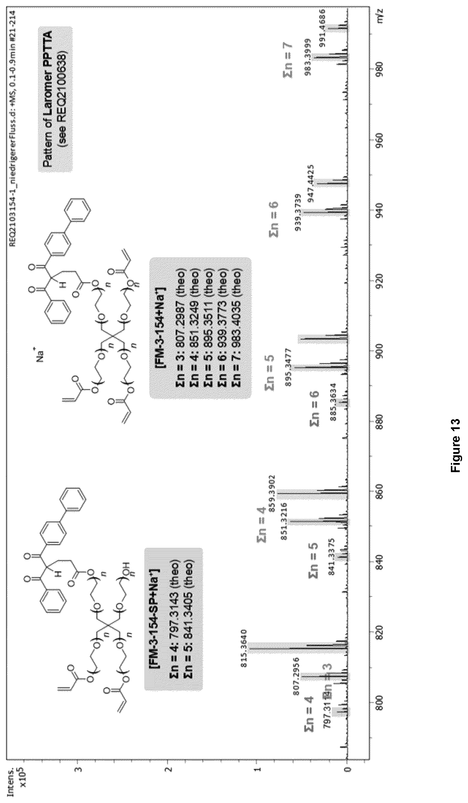 GPC: Mn980 g/mol, Mw1220 g/mol, PDI 1.24; The amount of unreacted 4Ph-DBM was <3% (*amount of unreacted material determined based on GPC peak area). UV/Vis in acetonitril at 20 ppm: lmax=288 nm, 249 nm. FIRMS (ESI): The exact masses of the sodium-adducts of the onefold addition of 4Ph-DBM to Laromer PPTTA are detected: