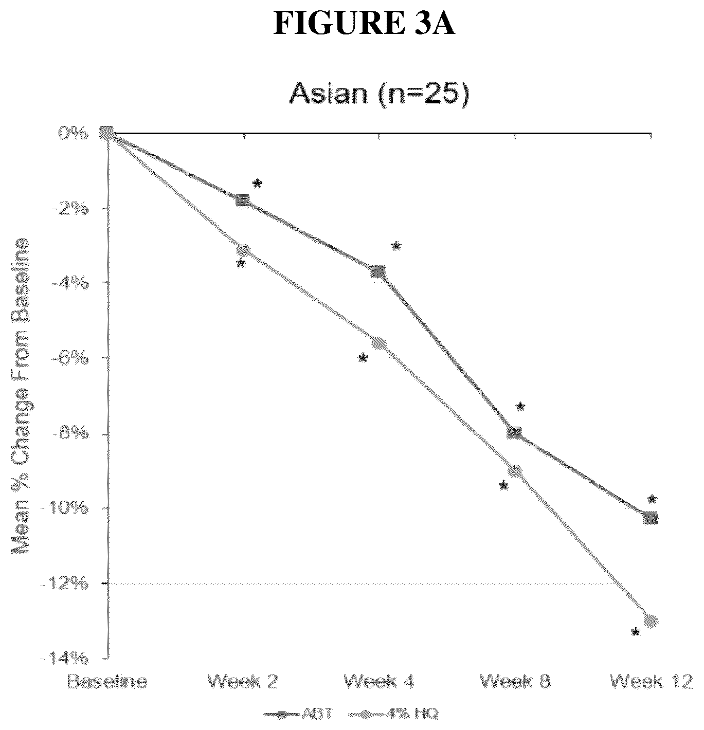 Age, years Mean (SD) 52.6 (8.0) 49.8 (7.7) Median (minimum, 53.0 (31.0, 65.0) 51.0 (31.0, 63.0) maximum) Sex, female, n (%) 113 (100) 44 (100) Race and ethnic subgroup, n (%) Asian 25 (22.1) 11 (25.0) Black or African American 31 (27.4) 9 (20.5) Hispanic 25 (22.1) 12 (27.3) White or Caucasian 32 (28.3) 12 (27.3) Fitzpatrick skin type, n (%) I 1 (0.9) 0 II 11 (9.7) 0 III 48 (42.5) 26 (59.1) IV 25 (22.1) 11 (25.0) V 24 (21.2) 6 (13.6) VI 4 (3.5) 1 (2.3) Hyperpigmentation score at Ex. 2 side, 4.95 Ex. 2 side, 5.16, baseline, mean 4% HQ side, 4.95 4% HQ side, 5.17 mMASI grading at baseline, NA EX. 2 side, 4.50, mean 4% HQ, 4.42 Improved the overall appearance of my skin 84% 86% Improved the overall condition of my skin 81% 81% Makes my skin feel smooth and soft 84% 84% Made my complexion more radiant 79% 81% Improved the evenness of my skin tone 84% 85% Faded the age spots on my skin 80% 77% Helped prevent new dark spots 75% 76% Makes my skin look less dull 84% 78% Improved the look of sun damage 80% 81% Makes me feel happier about how I look 77% 78% Improved the overall tone and clarity of my skin 83% 84% Improved current and helps prevent uneven pigment 75% 76% in my skin Example 7