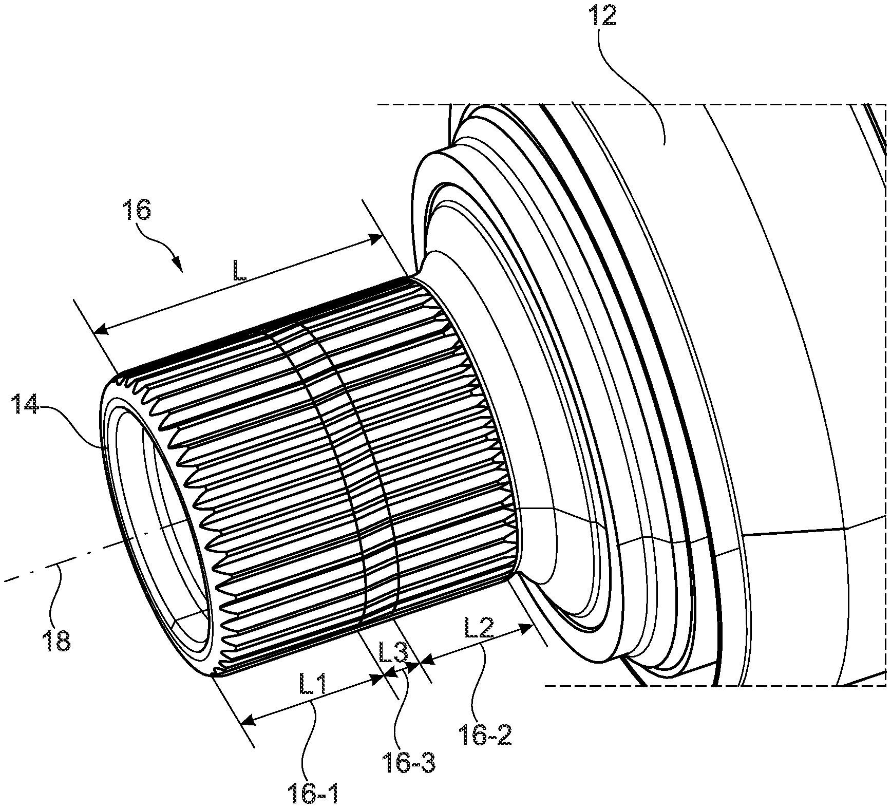 Since the axial length L1 of the first toothing region 16-1 is already greater than the axial length L2 of the second toothing region 16-1, the toothing regions to be joined first during assembly, namely the first toothing region 16-1 and the adjoining third toothing region 16-3, together are correspondingly greater than the axial length L2 of the second toothing region 16-2. This thus advantageously allows simplified “threading” by hand during assembly over the relatively large region L1+L3, so that joining by mechanical aids, for example by tightening a central screw, only has to be carried out in the area of the subsequent smaller region L2.