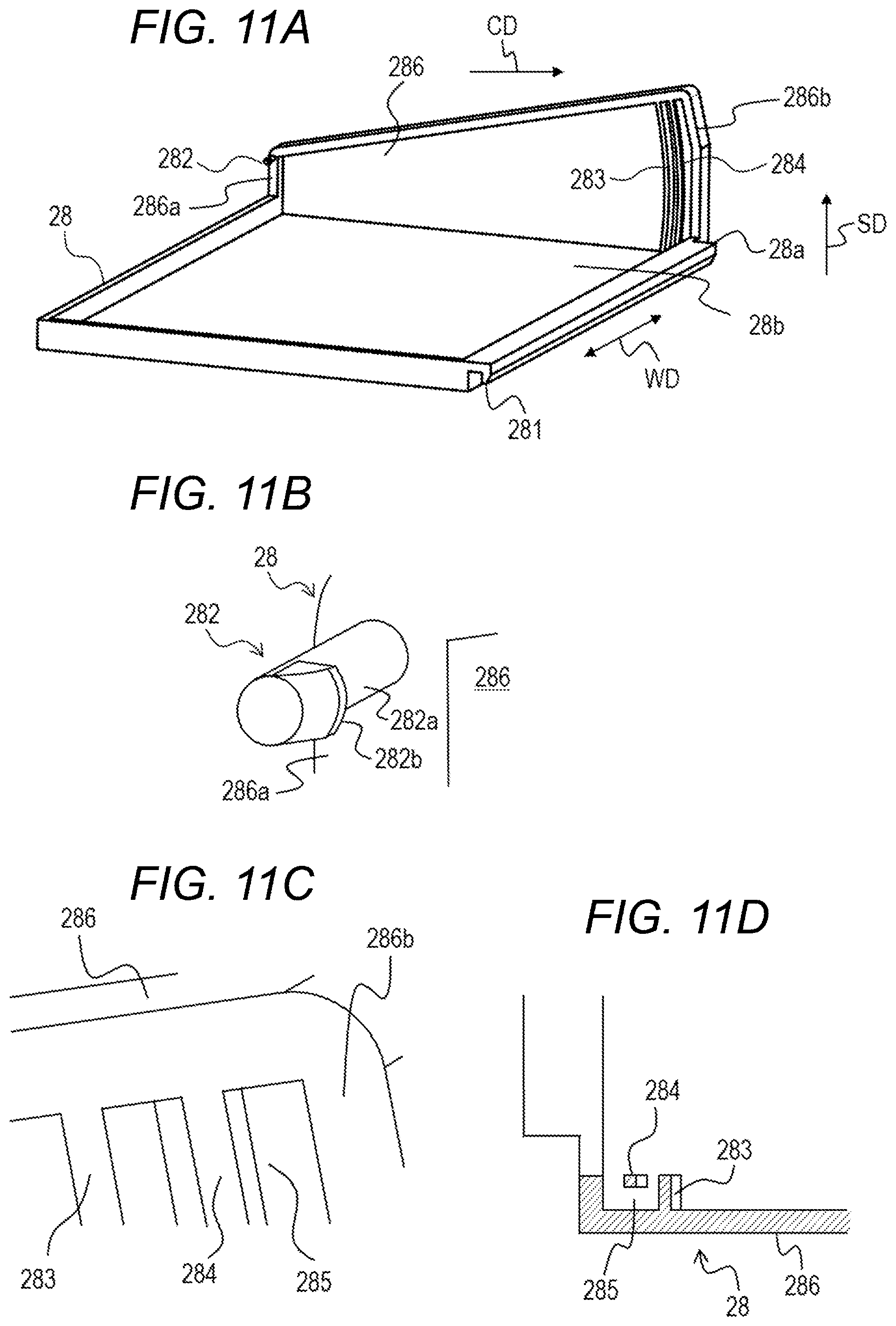 FIG. 11A, FIG. 11B, FIG. 11C, and FIG. 11D are views of the telescopic tray cover 28 in the first embodiment. FIG. 11A is a perspective view of the telescopic tray cover 28. FIG. 11B is a partial view of the vicinity of a mounting claw 282. FIG. 11C is a partial enlarged view of a first guide rib 283 and a second guide rib 284. FIG. 11D is a partial cross-sectional view of the telescopic tray cover 28 as seen from above in the stacking direction SD of the documents. The telescopic tray cover 28 has a wall portion 286 extending from a bottom portion 28b of the telescopic tray cover 28 in the stacking direction SD at an end portion 28a of the telescopic tray cover 28 on the front side of the image forming apparatus 101 in the width direction WD. The wall portion 286 has the mounting claw 282 at an end portion 286a on the upstream side in the feeding direction CD of the document. The wall portion 286 has the first guide rib 283 and the second guide rib 284 at an end portion 286b on the downstream side in the feeding direction CD of the document. The mounting claw 282 has a shaft portion 282a and a hooking portion 282b provided at a tip portion of the shaft portion 282a. The first guide rib 283 and the second guide rib 284 are disposed on their respective arcs around the mounting claw 282. A slit (groove portion) 285 is provided between the second guide rib 284 and the wall portion 286.