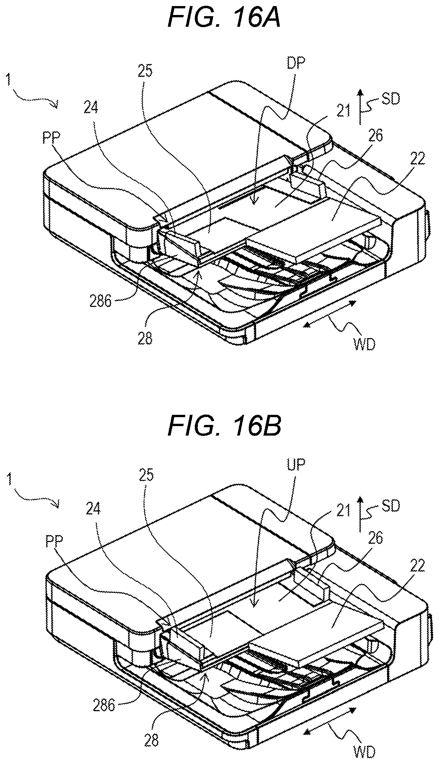 FIG. 12A, FIG. 12B, FIG. 12C, and FIG. 12D are views of the telescopic tray 25 and the telescopic tray cover 28 in the first embodiment. FIG. 12A is a perspective view of the telescopic tray 25 and the telescopic tray cover 28 before assembly. FIG. 12B is a perspective view of the telescopic tray 25 and the telescopic tray cover 28 after assembly. FIG. 12C is an enlarged cross-sectional view of the mounting claw 282 locked to the mounting hole 252. FIG. 12D is an enlarged cross-sectional view of the mounting claw 251 locked to the second guide rib 284. The mounting claw (protrusion) 251 of the telescopic tray 25 is inserted between the first guide rib 283 and the second guide rib 284 of the telescopic tray cover 28, and the hooking portion 251b of the mounting claw 251 is caught by the second guide rib 284 in the slit 285. The mounting claw 282 of the telescopic tray cover 28 is inserted into the mounting hole 252 of the telescopic tray 25, and the hooking portion 282b of the mounting claw 282 is caught by an inside surface 254 of the telescopic tray 25. Thus, the telescopic tray 25 is connected to the telescopic tray cover 28. Since the hooking portion 251b of the mounting claw 251 is caught by the second guide rib 284 in the slit 285 and the hooking portion 282b of the mounting claw 282 is caught by the inside surface 254 of the telescopic tray 25, the movement of the telescopic tray 25 with respect to the telescopic tray cover 28 in the width direction WD is regulated. The shaft portion 282a of the mounting claw 282 is held rotatably with respect to the mounting hole 252. The hooking portion 251b of the mounting claw 251 is movable in the slit (groove portion) 285 between the second guide rib 284 and the wall portion 286. With this, the telescopic tray 25 is configured to be rotatable with respect to the telescopic tray cover 28 around the mounting hole (first rotation supporting point) 252.