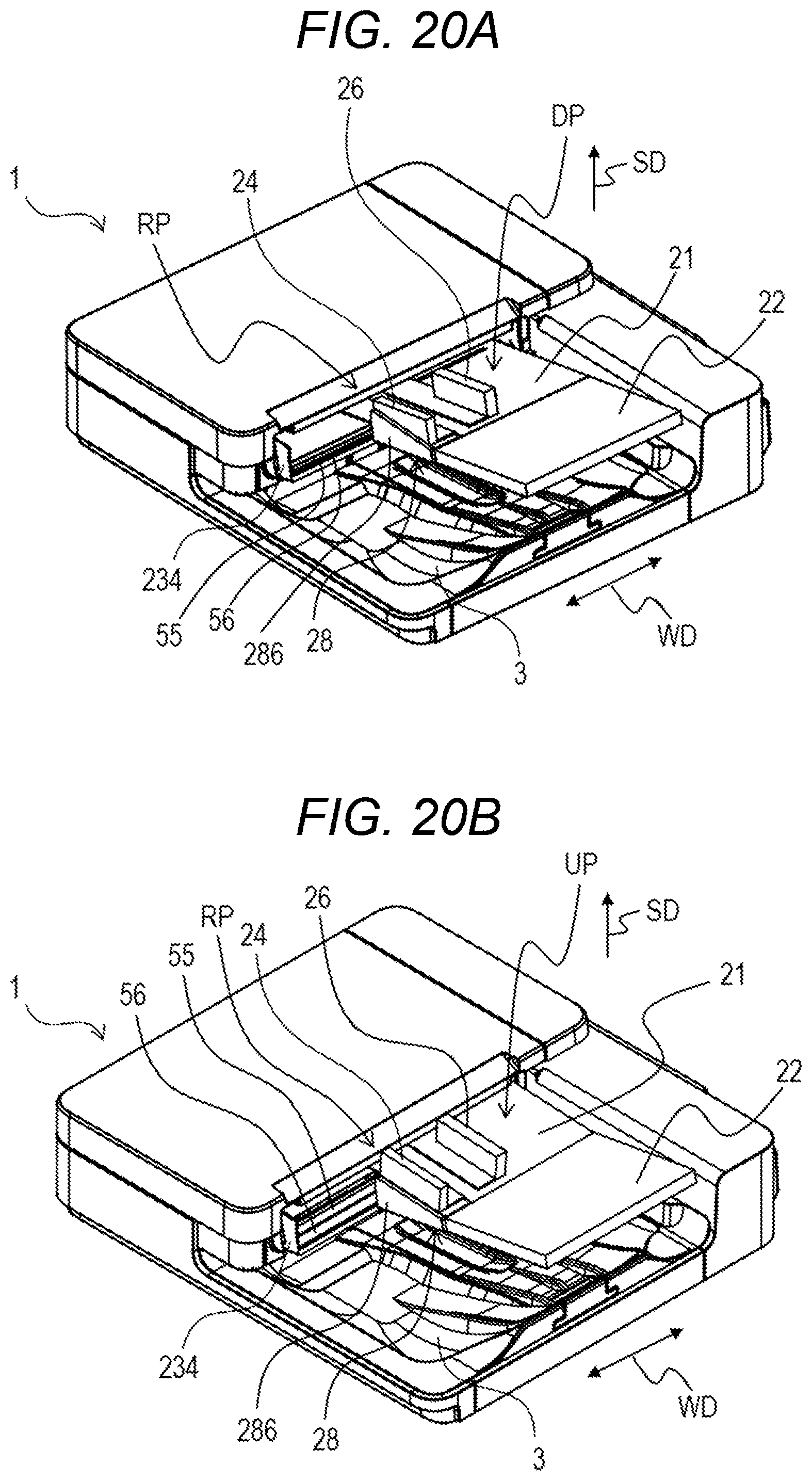 FIG. 20A and FIG. 20B are perspective views of the automatic document feeder in the second embodiment when small-size documents are fed.