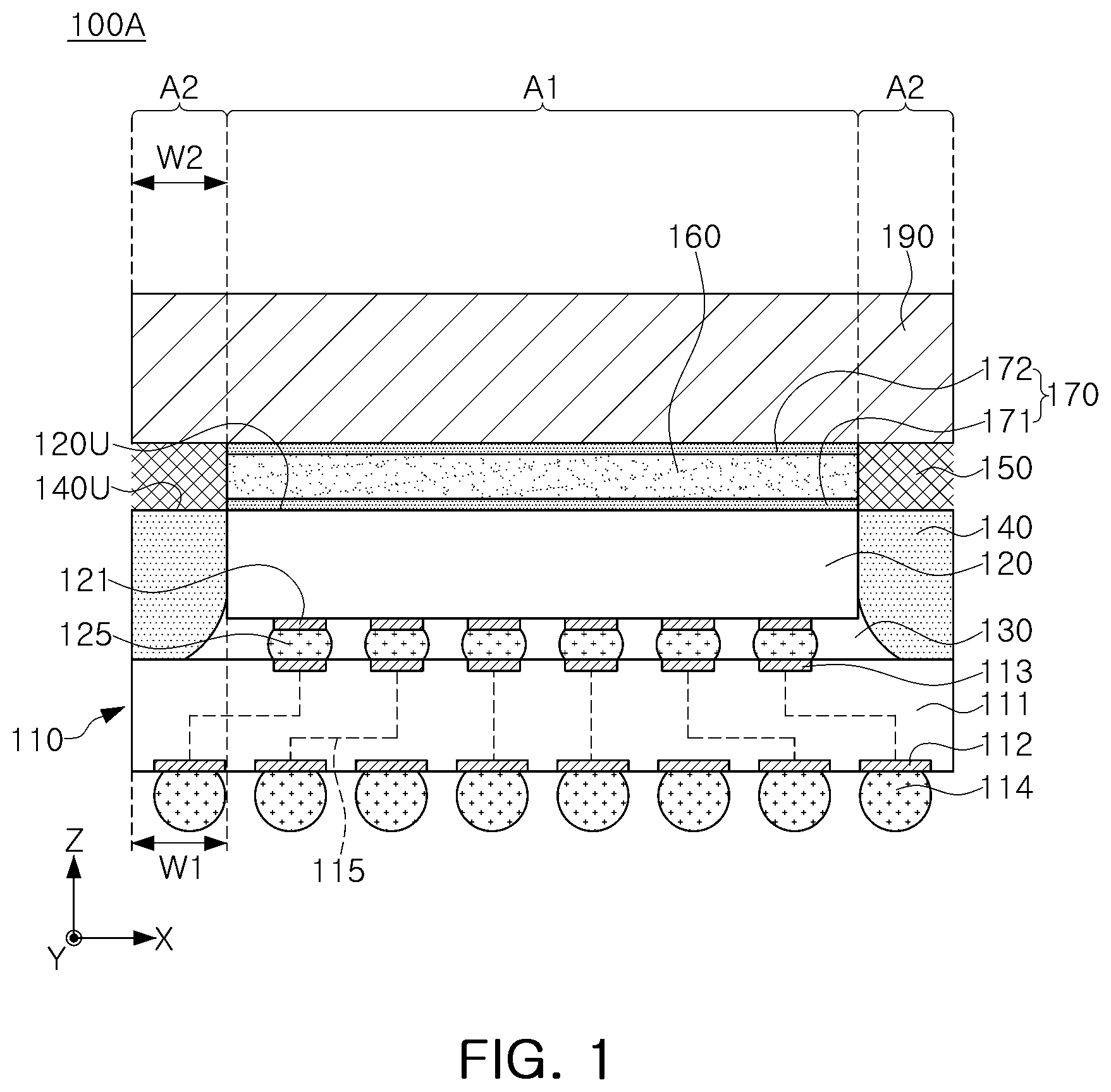 Referring to FIGS. 1 and 2, the bonding enhancing layer 170 may be applied to the upper surface 120U of the semiconductor chip 120 to define a region (hereinafter, referred to as a ‘first region A1’) in which the thermal interface material layer 160 is positioned. That is, in order to stably apply the thermal interface material layer 160 having low wettability to the upper surface 120U of the semiconductor chip 120, the bonding enhancing layer may be formed in the first region A1 in which the thermal interface material layer 160 is to be formed, and then, the thermal interface material layer 160 may be applied. The bonding enhancing layer 170 may be on or entirely cover the upper surface 120U of the semiconductor chip 120, but is not limited thereto, and the bonding enhancing layer 170 may partially cover the upper surface 120U of the semiconductor chip 120. According to an embodiment, the bonding enhancing layer 170 may be on only a partial region of the upper surface 120U of the semiconductor chip 120 and may extend to a partial region of the upper surface 140U of the encapsulant 140. The bonding enhancing layer 170 may include a material having high wettability so that the thermal interface material layer 160 having low wettability may be attached to the upper surface 120U of the semiconductor chip 120. In addition, the bonding enhancing layer 170 has an effect of reducing thermal resistance by forming a eutectic metal layer at an interface with a liquid metal constituting the thermal interface material layer 160. For example, when the liquid metal is an alloy of gallium, indium, and tin, the bonding enhancing layer 170 may be formed of a material including at least one of gallium (Ga), tin (Sn), and copper (Cu).