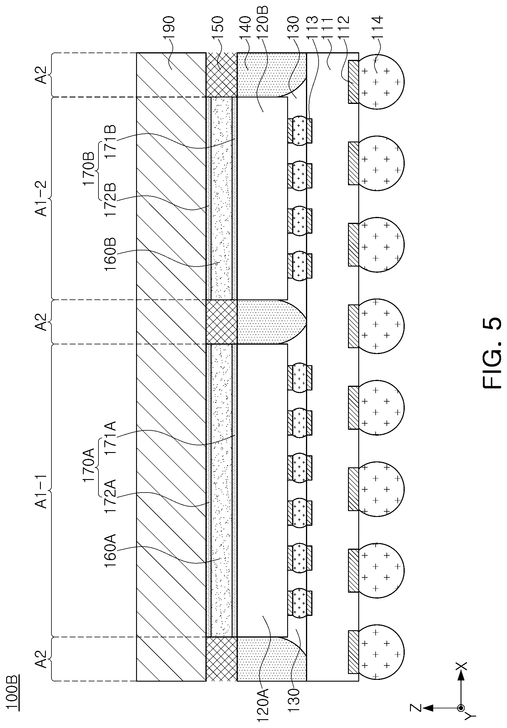 Referring to FIGS. 5 and 6, the semiconductor package 100B according to an embodiment may include a package substrate 110, a plurality of semiconductor chips 120A and 120B, an encapsulant 140, a porous barrier structure 150, thermal interface material layers 160A and 106B, bonding enhancing layers 170A and 170B, and a heat dissipation member 190.