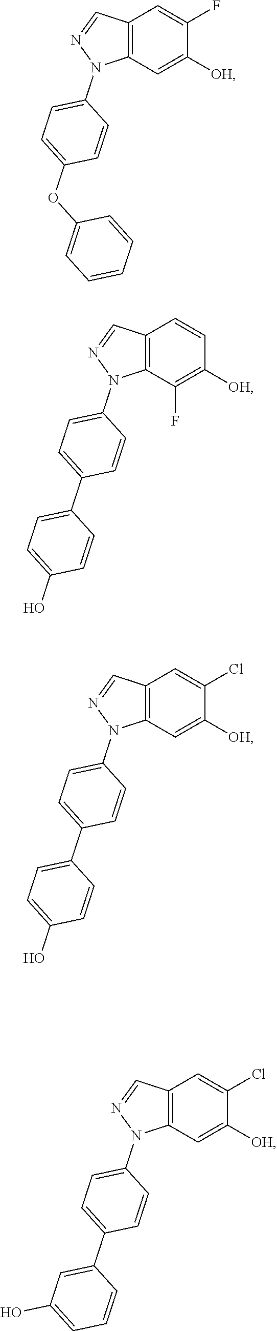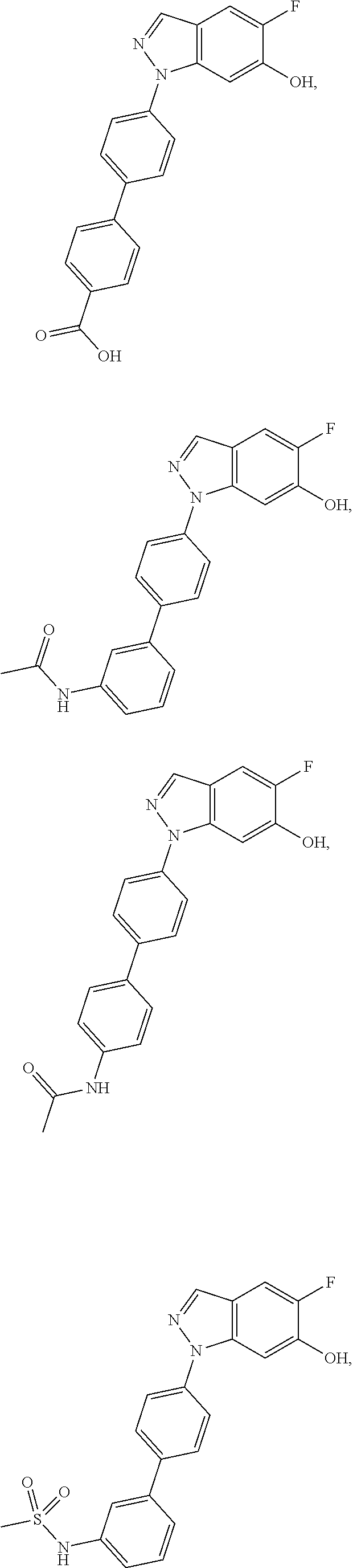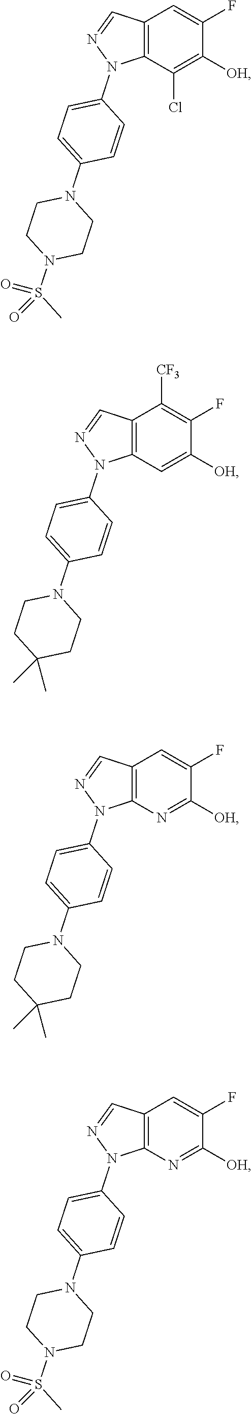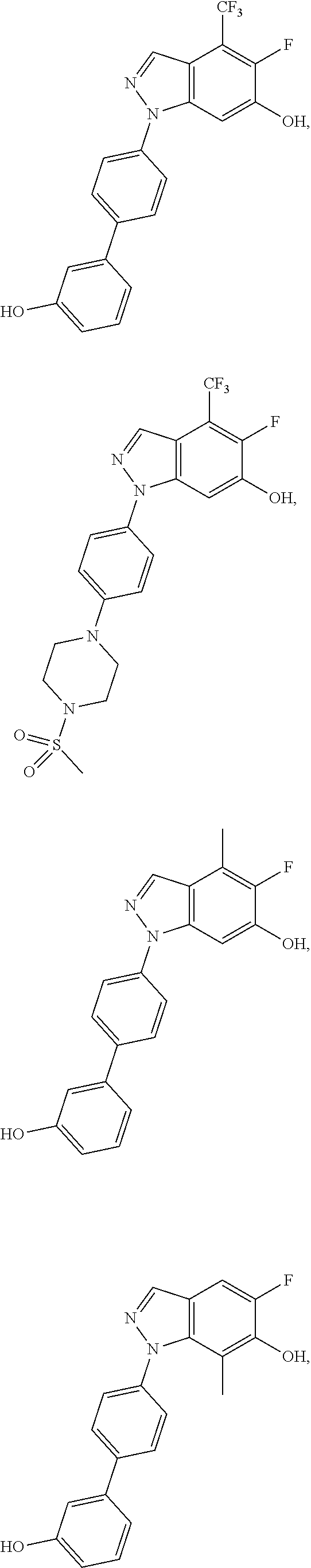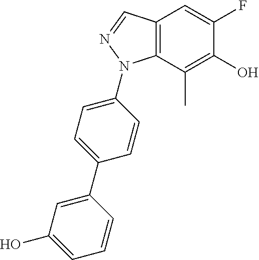 1 1-(4′-Hydroxy-[1,1′-biphenyl]-4-yl)-1H- indazol-6-ol 2 5-Fluoro-1-(3′-hydroxy-[1,1′-biphenyl]-4- yl)-1H-indazol-6-ol 2.1 5-Fluoro-1-(4′-hydroxy-[1,1′-biphenyl]-4- yl)-1H-indazol-6-ol 2.2 1-([1,1′-Biphenyl]-4-yl)-5-fluoro-1H- indazol-6-ol 2.3 5-Fluoro-1-(4-phenoxyphenyl)-1H-indazol- 6-o1 2.4 7-Fluoro-1-(4′-hydroxy-[1,1′-biphenyl]-4- yl)-1H-indazol-6-ol 2.5 5-Chloro-1-(4′-hydroxy-[1,1′-biphenyl]-4- yl)-1H-indazol-6-ol 2.6 5-Chloro-1-(3′-hydroxy-[1,1′-biphenyl]-4- yl)-1H-indazol-6-ol 2.7 4-Fluoro-1-(4′-hydroxy-[1,1′-biphenyl]-4- yl)-1H-indazol-6-ol 2.8 4-Fluoro-1-(3′-hydroxy-[1,1′-biphenyl]-4- yl)-1H-indazol-6-ol 2.9 1-(2′-Bromo-3′-hydroxy-[1,1′-biphenyl]-4- yl)-4-fluoro-1H-indazol-6-ol 3 5-Fluoro-1-(4-(phenylamino)phenyl)-1H- indazol-6-ol 4 5-Fluoro-1-(3′-hydroxy-[1,1′-biphenyl]-4- yl)-4-(trifluoromethyl)-1H-indazol-6-ol 4.1 5-Fluoro-1-(4-(4-(methylsulfonyl)piperazin- 1-yl)phenyl)-4-(trifluoromethyl)-1H-indazol- 6-ol 4.2 5-Fluoro-1-(3′-hydroxy-[1,1′-biphenyl]-4- yl)-4-methyl-1H-indazol-6-ol 4.3 5-Fluoro-1-(3′-hydroxy-[1,1′-biphenyl]-4- yl)-7-methyl-1H-indazol-6-ol 5 4-Chloro-5-fluoro-1-(3′-hydroxy-[1,1′- biphenyl]-4-yl)-1H-indazol-6-ol 5.1 4-Chloro-5-fluoro-1-(4-(4- (methylsulfonyl)piperazin-1-yl)phenyl)-1H- indazol-6-ol 5.2 4-Chloro-1-(4-(4,4-dimethylpiperidin-1- yl)phenyl)-5-fluoro-1H-indazol-6-ol 5.3 3,5-Difluoro-1-(3′-hydroxy-[1,1′-biphenyl]- 4-yl)-1H-indazol-6-ol 5.4 3,5,7-Trifluoro-1-(3′-hydroxy-[1,1′- biphenyl]-4-yl)-1H-indazol-6-ol 6 3,5,7-Trifluoro-1-(4-(4- (methylsulfonyl)piperazin-1-yl)phenyl)-1H- indazol-6-ol 6.1 1-(2-(4,4-Dimethylpiperidin-1-yl)pyrimidin- 5-yl)-5,7-difluoro-1H-indazol-6-ol 6.2 1-(4-(4,4-Dimethylpiperidin-1-yl)phenyl)- 5,7-difluoro-1H-indol-6-ol 7 5,7-Difluoro-1-(2-(4- (methylsulfonyl)piperazin-1-yl)pyrimidin-5- yl)-1H-indazol-6-ol 7.1 1-(4-(4,4-Dimethylpiperidin-1-yl)phenyl)-5- fluoro-6-hydroxy-1H-indazole-4-carbonitrile 7.2 1-(4-(4,4-Dimethylpiperidin-1-yl)phenyl)- 5,7-difluoro-6-hydroxyindoline-2,3-dione 7.3 3-(4-(4,4-Dimethylpiperidin-1-yl)phenyl)- 4,6-difluoro-5-hydroxybenzo[d]thiazol- 2(3H)-one 7.4 1-(4-(4,4-Dimethylpiperidin-1-yl)phenyl)-5- fluoro-4-(trifluoromethyl)-1H-pyrazolo[3,4- b]pyridin-6-ol 8 4,5-Difluoro-1-(3′-hydroxy-[1,1′-biphenyl]- 4-yl)-1H-indazol-6-ol 9 5-Fluoro-1-(4′-hydroxy-[1,1′-biphenyl]-4- yl)-1H-benzo[d]imidazol-6-ol 10 5-Fluoro-1-(4′-hydroxy-[1,1′-biphenyl]-4- yl)-1H-benzo[d][1,2,3]triazol-6-ol 11 1-(4-(4,4-Dimethylpiperidin-1-yl)phenyl)- 5,7-difluoro-6-hydroxy-1H- benzo[d]imidazol-2(3H)-one 12 3-(4-(4,4-Dimethylpiperidin-1-yl)phenyl)-1- ethyl-4,6-difluoro-5-hydroxy-1H- benzo[d]imidazol-2(3H)-one 13 1-(4′-Chloro-[1,1′-biphenyl]-4-yl)-5,7- difluoro-1H-indazol-6-ol 13.1 5,7-Difluoro-1-(4′-hydroxy-[1,1′-biphenyl]- 4-yl)-1H-indazol-6-ol 13.2 5-Fluoro-1-(2′-hydroxy-[1,1′-biphenyl]-4- yl)-1H-indazol-6-ol 13.3 5-Fluoro-1-(2′-fluoro-[1,1′-biphenyl]-4-yl)- 1H-indazol-6-ol 13.4 5-Fluoro-1-(3′-fluoro-[1,1′-biphenyl]-4-yl)- 1H-indazol-6-ol 13.5 5-Fluoro-1-(4′-fluoro-[1,1′-biphenyl]-4-yl)- 1H-indazol-6-ol 13.6 1-(2′-Chloro-[1,1′-biphenyl]-4-yl)-5-fluoro- 1H-indazol-6-ol 13.7 1-(3′-Chloro-[1,1′-biphenyl]-4-yl)-5-fluoro- 1H-indazol-6-ol 13.8 1-(4′-Chloro-[1,1′-biphenyl]-4-yl)-5-fluoro- 1H-indazol-6-ol 13.9 5-Fluoro-1-(2′-methyl-[1,1′-biphenyl]-4-yl)- 1H-indazol-6-ol 13.10 5-Fluoro-1-(3′-methyl-[1,1′-biphenyl]-4-yl)- 1H-indazol-6-ol 13.11 5-Fluoro-1-(4′-methyl-[1,1′-biphenyl]-4-yl)- 1H-indazol-6-ol 13.12 5,7-Difluoro-1-(3′-hydroxy-[1,1′-biphenyl]- 4-yl)-1H-indazol-6-ol 13.13 5-Fluoro-1-(4-(pyridin-2-yl)phenyl)-1H- indazol-6-ol 13.14 5-Fluoro-1-(4-(pyridin-3-yl)phenyl)-1H- indazol-6-ol 13.15 5-Fluoro-1-(4-(pyridin-4-yl)phenyl)-1H- indazol-6-ol 13.16 4′-(5-Fluoro-6-hydroxy-1H-indazol-1-yl)- [1,1′-biphenyl]-2-carbonitrile 13.17 4′-(5-Fluoro-6-hydroxy-1H-indazol-1-yl)- [1,1′-biphenyl]-3-carbonitrile 13.18 4′-(5-Fluoro-6-hydroxy-1H-indazol-1-yl)- [1,1′-biphenyl]-4-carbonitrile 13.19 1-(4′-Chloro-3′-hydroxy-[1,1′-biphenyl]-4- yl)-5,7-difluoro-1H-indazol-6-ol 13.20 5-Fluoro-1-(3′-methoxy-[1,1′-biphenyl]-4- yl)-1H-indazol-6-ol 13.21 5-Fluoro-1-(4′-methoxy-[1,1′-biphenyl]-4- yl)-1H-indazol-6-ol 13.22 5-Fluoro-1-(3′-(hydroxymethyl)-[1,1′- biphenyl]-4-yl)-1H-indazol-6-ol 13.23 5-Fluoro-1-(4′-(hydroxymethyl)-[1,1′- biphenyl]-4-yl)-1H-indazol-6-ol 13.24 5-Fluoro-1-(2′-(methylsulfonyl)-[1,1′- biphenyl]-4-yl)-1H-indazol-6-ol 13.25 5-Fluoro-1-(3′-(methylsulfonyl)-[1,1′- biphenyl]-4-yl)-1H-indazol-6-ol 13.26 5-Fluoro-1-(4′-(methylsulfonyl)-[1,1′- biphenyl]-4-yl)-1H-indazol-6-ol 13.27 1-(3′-Amino-[1,1′-biphenyl]-4-yl)-5-fluoro- 1H-indazol-6-ol 13.28 1-(4′-Amino-[1,1′-biphenyl]-4-yl)-5-fluoro- 1H-indazol-6-ol 13.29 4′-(5-Fluoro-6-hydroxy-1H-indazol-1-yl)- [1,1′-biphenyl]-3-carboxylic acid 13.30 4′-(5-Fluoro-6-hydroxy-1H-indazol-1-yl)- [1,1′-biphenyl]-4-carboxylic acid 13.31 N-(4′-(5-Fluoro-6-hydroxy-1H-indazol-1-yl)- [1,1′-biphenyl]-3-yl)acetamide 13.32 N-(4′-(5-Fluoro-6-hydroxy-1H-indazol-1-yl)- [1,1′-biphenyl]-4-yl)acetamide 13.33 N-(4′-(5-Fluoro-6-hydroxy-1H-indazol-1-yl)- [1,1′-biphenyl]-3-yl)methanesulfonamide 13.34 N-(4′-(5-Fluoro-6-hydroxy-1H-indazol-1-yl)- [1,1′-biphenyl]-4-yl)methanesulfonamide 13.35 4′-(5-Fluoro-6-hydroxy-1H-indazol-1-yl)- [1,1′-biphenyl]-3-carboxamide 13.36 4′-(5-Fluoro-6-hydroxy-1H-indazol-1-yl)- [1,1′-biphenyl]-4-carboxamide 13.37 4′-(5-Fluoro-6-hydroxy-1H-indazol-1-yl)- [1,1′-biphenyl]-3-sulfonamide 13.38 4′-(5-Fluoro-6-hydroxy-1H-indazol-1-yl)- [1,1′-biphenyl]-4-sulfonamide 13.39 4′-(5,7-Difluoro-6-hydroxy-1H-indazol-1- yl)-[1,1′-biphenyl]-4-carbonitrile 13.40 5,7-Difluoro-1-(4′-(methylsulfonyl)-[1,1′- biphenyl]-4-yl)-1H-indazol-6-ol 14 5-(4-(5,7-Difluoro-6-hydroxy-1H-indazol-1- yl)phenyl)picolinonitrile 14.1 1-(4-(1H-Pyrazol-4-yl)phenyl)-5,7-difluoro- 1H-indazol-6-ol 14.2 1-(4-(1H-Pyrazol-3-yl)phenyl)-5,7-di