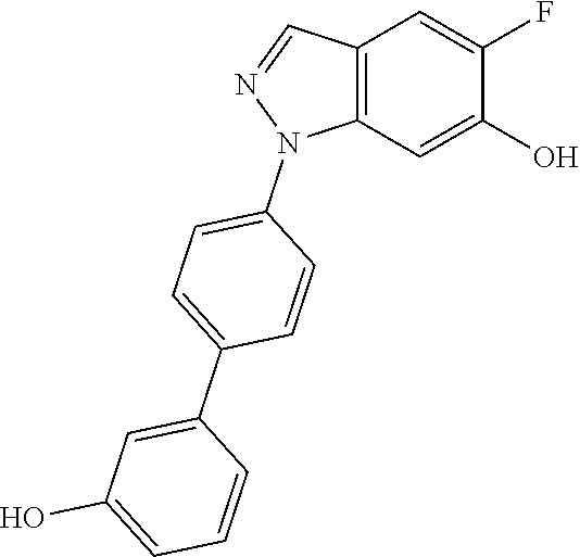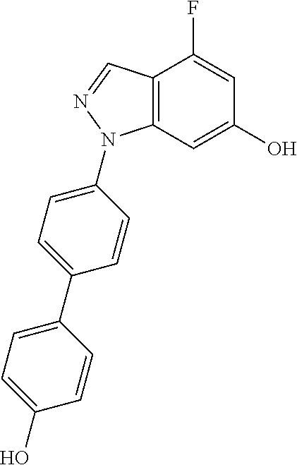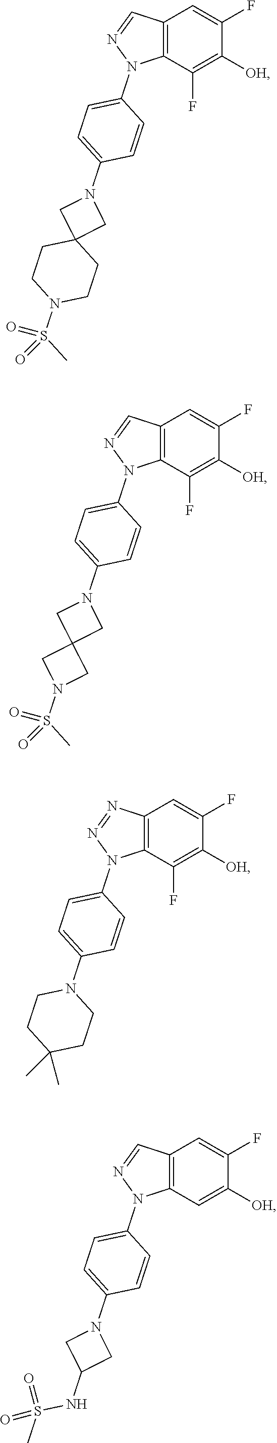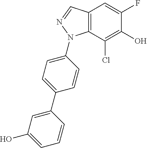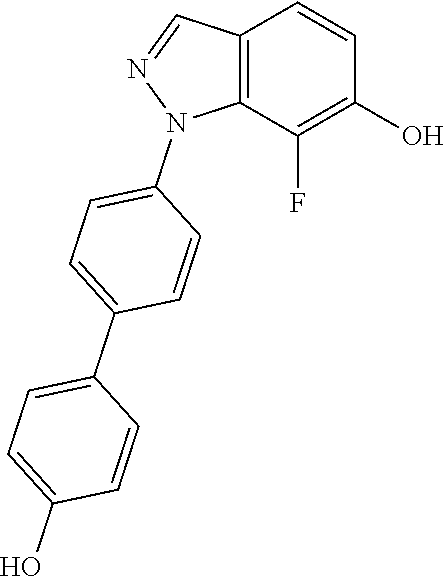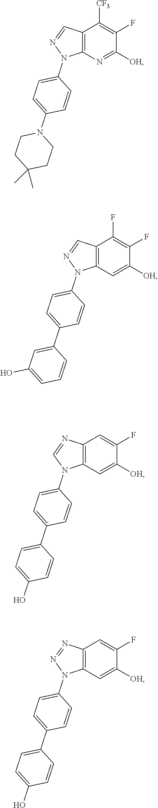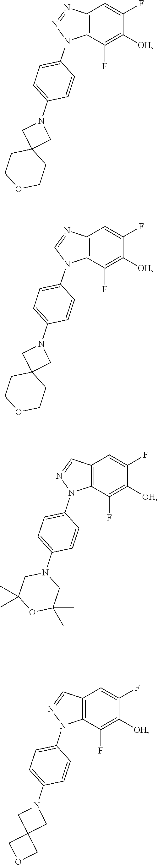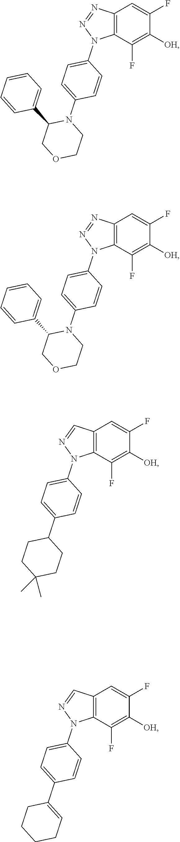 1 1-(4′-Hydroxy-[1,1′-biphenyl]-4-yl)-1H- indazol-6-ol 2 5-Fluoro-1-(3′-hydroxy-[1,1′-biphenyl]-4- yl)-1H-indazol-6-ol 2.1 5-Fluoro-1-(4′-hydroxy-[1,1′-biphenyl]-4- yl)-1H-indazol-6-ol 2.2 1-([1,1′-Biphenyl]-4-yl)-5-fluoro-1H- indazol-6-ol 2.3 5-Fluoro-1-(4-phenoxyphenyl)-1H-indazol- 6-o1 2.4 7-Fluoro-1-(4′-hydroxy-[1,1′-biphenyl]-4- yl)-1H-indazol-6-ol 2.5 5-Chloro-1-(4′-hydroxy-[1,1′-biphenyl]-4- yl)-1H-indazol-6-ol 2.6 5-Chloro-1-(3′-hydroxy-[1,1′-biphenyl]-4- yl)-1H-indazol-6-ol 2.7 4-Fluoro-1-(4′-hydroxy-[1,1′-biphenyl]-4- yl)-1H-indazol-6-ol 2.8 4-Fluoro-1-(3′-hydroxy-[1,1′-biphenyl]-4- yl)-1H-indazol-6-ol 2.9 1-(2′-Bromo-3′-hydroxy-[1,1′-biphenyl]-4- yl)-4-fluoro-1H-indazol-6-ol 3 5-Fluoro-1-(4-(phenylamino)phenyl)-1H- indazol-6-ol 4 5-Fluoro-1-(3′-hydroxy-[1,1′-biphenyl]-4- yl)-4-(trifluoromethyl)-1H-indazol-6-ol 4.1 5-Fluoro-1-(4-(4-(methylsulfonyl)piperazin- 1-yl)phenyl)-4-(trifluoromethyl)-1H-indazol- 6-ol 4.2 5-Fluoro-1-(3′-hydroxy-[1,1′-biphenyl]-4- yl)-4-methyl-1H-indazol-6-ol 4.3 5-Fluoro-1-(3′-hydroxy-[1,1′-biphenyl]-4- yl)-7-methyl-1H-indazol-6-ol 5 4-Chloro-5-fluoro-1-(3′-hydroxy-[1,1′- biphenyl]-4-yl)-1H-indazol-6-ol 5.1 4-Chloro-5-fluoro-1-(4-(4- (methylsulfonyl)piperazin-1-yl)phenyl)-1H- indazol-6-ol 5.2 4-Chloro-1-(4-(4,4-dimethylpiperidin-1- yl)phenyl)-5-fluoro-1H-indazol-6-ol 5.3 3,5-Difluoro-1-(3′-hydroxy-[1,1′-biphenyl]- 4-yl)-1H-indazol-6-ol 5.4 3,5,7-Trifluoro-1-(3′-hydroxy-[1,1′- biphenyl]-4-yl)-1H-indazol-6-ol 6 3,5,7-Trifluoro-1-(4-(4- (methylsulfonyl)piperazin-1-yl)phenyl)-1H- indazol-6-ol 6.1 1-(2-(4,4-Dimethylpiperidin-1-yl)pyrimidin- 5-yl)-5,7-difluoro-1H-indazol-6-ol 6.2 1-(4-(4,4-Dimethylpiperidin-1-yl)phenyl)- 5,7-difluoro-1H-indol-6-ol 7 5,7-Difluoro-1-(2-(4- (methylsulfonyl)piperazin-1-yl)pyrimidin-5- yl)-1H-indazol-6-ol 7.1 1-(4-(4,4-Dimethylpiperidin-1-yl)phenyl)-5- fluoro-6-hydroxy-1H-indazole-4-carbonitrile 7.2 1-(4-(4,4-Dimethylpiperidin-1-yl)phenyl)- 5,7-difluoro-6-hydroxyindoline-2,3-dione 7.3 3-(4-(4,4-Dimethylpiperidin-1-yl)phenyl)- 4,6-difluoro-5-hydroxybenzo[d]thiazol- 2(3H)-one 7.4 1-(4-(4,4-Dimethylpiperidin-1-yl)phenyl)-5- fluoro-4-(trifluoromethyl)-1H-pyrazolo[3,4- b]pyridin-6-ol 8 4,5-Difluoro-1-(3′-hydroxy-[1,1′-biphenyl]- 4-yl)-1H-indazol-6-ol 9 5-Fluoro-1-(4′-hydroxy-[1,1′-biphenyl]-4- yl)-1H-benzo[d]imidazol-6-ol 10 5-Fluoro-1-(4′-hydroxy-[1,1′-biphenyl]-4- yl)-1H-benzo[d][1,2,3]triazol-6-ol 11 1-(4-(4,4-Dimethylpiperidin-1-yl)phenyl)- 5,7-difluoro-6-hydroxy-1H- benzo[d]imidazol-2(3H)-one 12 3-(4-(4,4-Dimethylpiperidin-1-yl)phenyl)-1- ethyl-4,6-difluoro-5-hydroxy-1H- benzo[d]imidazol-2(3H)-one 13 1-(4′-Chloro-[1,1′-biphenyl]-4-yl)-5,7- difluoro-1H-indazol-6-ol 13.1 5,7-Difluoro-1-(4′-hydroxy-[1,1′-biphenyl]- 4-yl)-1H-indazol-6-ol 13.2 5-Fluoro-1-(2′-hydroxy-[1,1′-biphenyl]-4- yl)-1H-indazol-6-ol 13.3 5-Fluoro-1-(2′-fluoro-[1,1′-biphenyl]-4-yl)- 1H-indazol-6-ol 13.4 5-Fluoro-1-(3′-fluoro-[1,1′-biphenyl]-4-yl)- 1H-indazol-6-ol 13.5 5-Fluoro-1-(4′-fluoro-[1,1′-biphenyl]-4-yl)- 1H-indazol-6-ol 13.6 1-(2′-Chloro-[1,1′-biphenyl]-4-yl)-5-fluoro- 1H-indazol-6-ol 13.7 1-(3′-Chloro-[1,1′-biphenyl]-4-yl)-5-fluoro- 1H-indazol-6-ol 13.8 1-(4′-Chloro-[1,1′-biphenyl]-4-yl)-5-fluoro- 1H-indazol-6-ol 13.9 5-Fluoro-1-(2′-methyl-[1,1′-biphenyl]-4-yl)- 1H-indazol-6-ol 13.10 5-Fluoro-1-(3′-methyl-[1,1′-biphenyl]-4-yl)- 1H-indazol-6-ol 13.11 5-Fluoro-1-(4′-methyl-[1,1′-biphenyl]-4-yl)- 1H-indazol-6-ol 13.12 5,7-Difluoro-1-(3′-hydroxy-[1,1′-biphenyl]- 4-yl)-1H-indazol-6-ol 13.13 5-Fluoro-1-(4-(pyridin-2-yl)phenyl)-1H- indazol-6-ol 13.14 5-Fluoro-1-(4-(pyridin-3-yl)phenyl)-1H- indazol-6-ol 13.15 5-Fluoro-1-(4-(pyridin-4-yl)phenyl)-1H- indazol-6-ol 13.16 4′-(5-Fluoro-6-hydroxy-1H-indazol-1-yl)- [1,1′-biphenyl]-2-carbonitrile 13.17 4′-(5-Fluoro-6-hydroxy-1H-indazol-1-yl)- [1,1′-biphenyl]-3-carbonitrile 13.18 4′-(5-Fluoro-6-hydroxy-1H-indazol-1-yl)- [1,1′-biphenyl]-4-carbonitrile 13.19 1-(4′-Chloro-3′-hydroxy-[1,1′-biphenyl]-4- yl)-5,7-difluoro-1H-indazol-6-ol 13.20 5-Fluoro-1-(3′-methoxy-[1,1′-biphenyl]-4- yl)-1H-indazol-6-ol 13.21 5-Fluoro-1-(4′-methoxy-[1,1′-biphenyl]-4- yl)-1H-indazol-6-ol 13.22 5-Fluoro-1-(3′-(hydroxymethyl)-[1,1′- biphenyl]-4-yl)-1H-indazol-6-ol 13.23 5-Fluoro-1-(4′-(hydroxymethyl)-[1,1′- biphenyl]-4-yl)-1H-indazol-6-ol 13.24 5-Fluoro-1-(2′-(methylsulfonyl)-[1,1′- biphenyl]-4-yl)-1H-indazol-6-ol 13.25 5-Fluoro-1-(3′-(methylsulfonyl)-[1,1′- biphenyl]-4-yl)-1H-indazol-6-ol 13.26 5-Fluoro-1-(4′-(methylsulfonyl)-[1,1′- biphenyl]-4-yl)-1H-indazol-6-ol 13.27 1-(3′-Amino-[1,1′-biphenyl]-4-yl)-5-fluoro- 1H-indazol-6-ol 13.28 1-(4′-Amino-[1,1′-biphenyl]-4-yl)-5-fluoro- 1H-indazol-6-ol 13.29 4′-(5-Fluoro-6-hydroxy-1H-indazol-1-yl)- [1,1′-biphenyl]-3-carboxylic acid 13.30 4′-(5-Fluoro-6-hydroxy-1H-indazol-1-yl)- [1,1′-biphenyl]-4-carboxylic acid 13.31 N-(4′-(5-Fluoro-6-hydroxy-1H-indazol-1-yl)- [1,1′-biphenyl]-3-yl)acetamide 13.32 N-(4′-(5-Fluoro-6-hydroxy-1H-indazol-1-yl)- [1,1′-biphenyl]-4-yl)acetamide 13.33 N-(4′-(5-Fluoro-6-hydroxy-1H-indazol-1-yl)- [1,1′-biphenyl]-3-yl)methanesulfonamide 13.34 N-(4′-(5-Fluoro-6-hydroxy-1H-indazol-1-yl)- [1,1′-biphenyl]-4-yl)methanesulfonamide 13.35 4′-(5-Fluoro-6-hydroxy-1H-indazol-1-yl)- [1,1′-biphenyl]-3-carboxamide 13.36 4′-(5-Fluoro-6-hydroxy-1H-indazol-1-yl)- [1,1′-biphenyl]-4-carboxamide 13.37 4′-(5-Fluoro-6-hydroxy-1H-indazol-1-yl)- [1,1′-biphenyl]-3-sulfonamide 13.38 4′-(5-Fluoro-6-hydroxy-1H-indazol-1-yl)- [1,1′-biphenyl]-4-sulfonamide 13.39 4′-(5,7-Difluoro-6-hydroxy-1H-indazol-1- yl)-[1,1′-biphenyl]-4-carbonitrile 13.40 5,7-Difluoro-1-(4′-(methylsulfonyl)-[1,1′- biphenyl]-4-yl)-1H-indazol-6-ol 14 5-(4-(5,7-Difluoro-6-hydroxy-1H-indazol-1- yl)phenyl)picolinonitrile 14.1 1-(4-(1H-Pyrazol-4-yl)phenyl)-5,7-difluoro- 1H-indazol-6-ol 14.2 1-(4-(1H-Pyrazol-3-yl)phenyl)-5,7-di