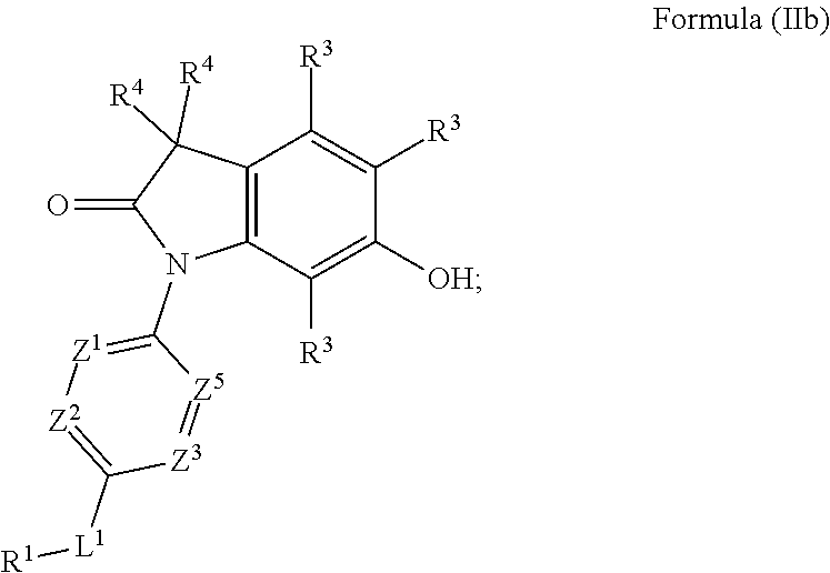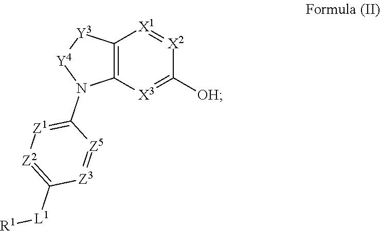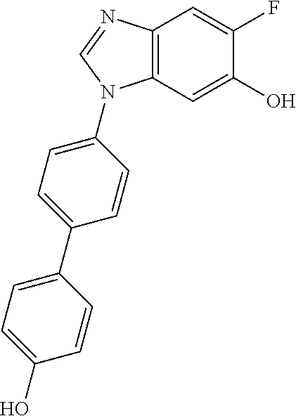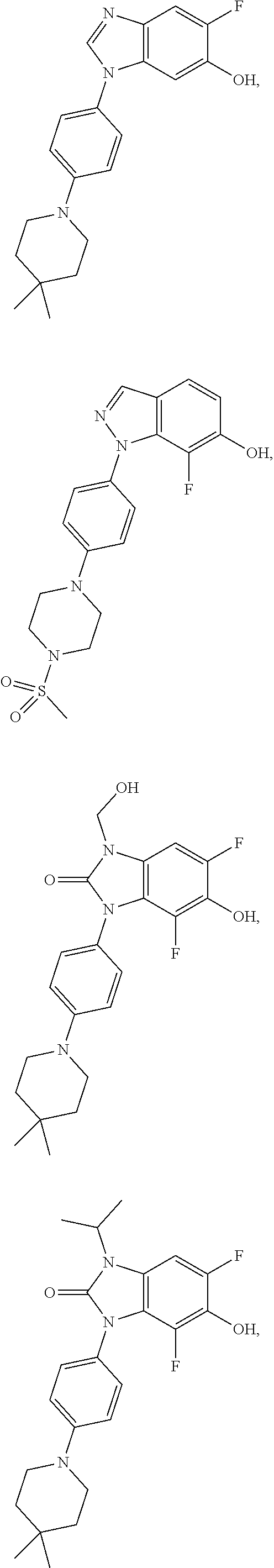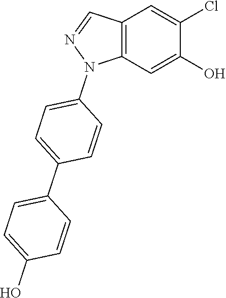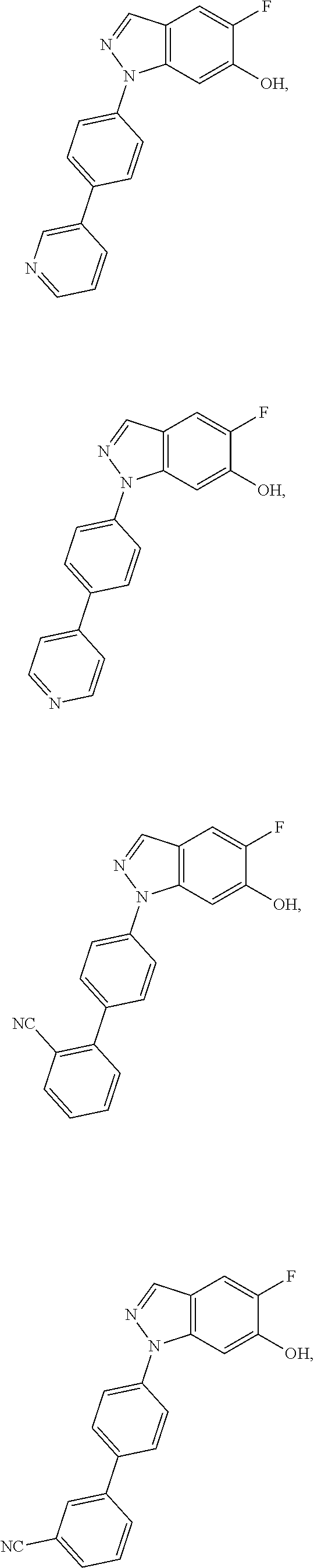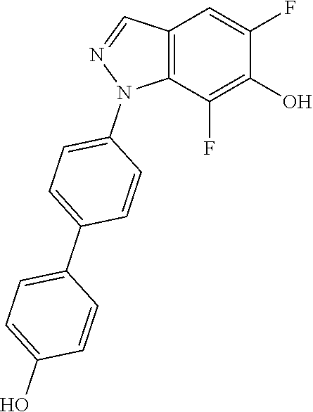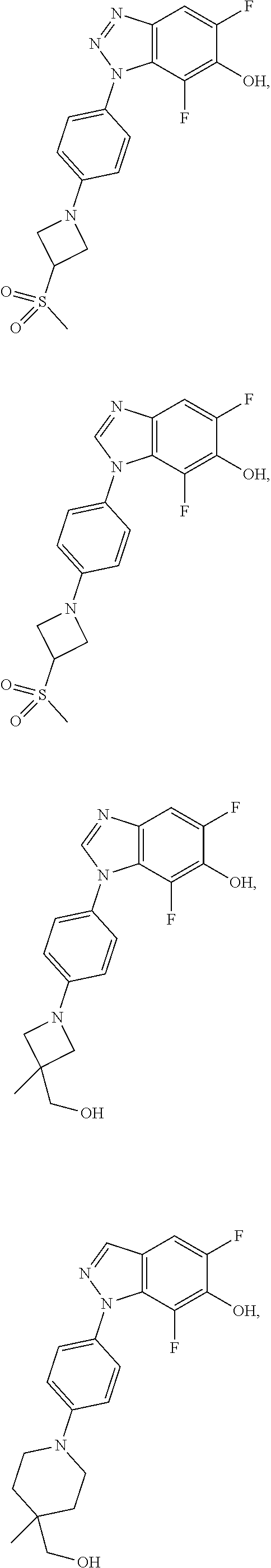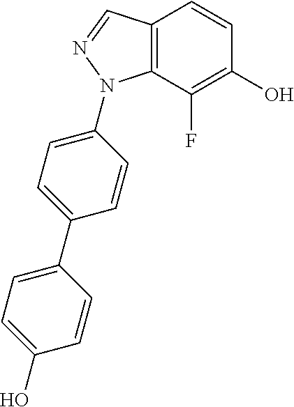1 1-(4′-Hydroxy-[1,1′-biphenyl]-4-yl)-1H- indazol-6-ol 2 5-Fluoro-1-(3′-hydroxy-[1,1′-biphenyl]-4- yl)-1H-indazol-6-ol 2.1 5-Fluoro-1-(4′-hydroxy-[1,1′-biphenyl]-4- yl)-1H-indazol-6-ol 2.2 1-([1,1′-Biphenyl]-4-yl)-5-fluoro-1H- indazol-6-ol 2.3 5-Fluoro-1-(4-phenoxyphenyl)-1H-indazol- 6-o1 2.4 7-Fluoro-1-(4′-hydroxy-[1,1′-biphenyl]-4- yl)-1H-indazol-6-ol 2.5 5-Chloro-1-(4′-hydroxy-[1,1′-biphenyl]-4- yl)-1H-indazol-6-ol 2.6 5-Chloro-1-(3′-hydroxy-[1,1′-biphenyl]-4- yl)-1H-indazol-6-ol 2.7 4-Fluoro-1-(4′-hydroxy-[1,1′-biphenyl]-4- yl)-1H-indazol-6-ol 2.8 4-Fluoro-1-(3′-hydroxy-[1,1′-biphenyl]-4- yl)-1H-indazol-6-ol 2.9 1-(2′-Bromo-3′-hydroxy-[1,1′-biphenyl]-4- yl)-4-fluoro-1H-indazol-6-ol 3 5-Fluoro-1-(4-(phenylamino)phenyl)-1H- indazol-6-ol 4 5-Fluoro-1-(3′-hydroxy-[1,1′-biphenyl]-4- yl)-4-(trifluoromethyl)-1H-indazol-6-ol 4.1 5-Fluoro-1-(4-(4-(methylsulfonyl)piperazin- 1-yl)phenyl)-4-(trifluoromethyl)-1H-indazol- 6-ol 4.2 5-Fluoro-1-(3′-hydroxy-[1,1′-biphenyl]-4- yl)-4-methyl-1H-indazol-6-ol 4.3 5-Fluoro-1-(3′-hydroxy-[1,1′-biphenyl]-4- yl)-7-methyl-1H-indazol-6-ol 5 4-Chloro-5-fluoro-1-(3′-hydroxy-[1,1′- biphenyl]-4-yl)-1H-indazol-6-ol 5.1 4-Chloro-5-fluoro-1-(4-(4- (methylsulfonyl)piperazin-1-yl)phenyl)-1H- indazol-6-ol 5.2 4-Chloro-1-(4-(4,4-dimethylpiperidin-1- yl)phenyl)-5-fluoro-1H-indazol-6-ol 5.3 3,5-Difluoro-1-(3′-hydroxy-[1,1′-biphenyl]- 4-yl)-1H-indazol-6-ol 5.4 3,5,7-Trifluoro-1-(3′-hydroxy-[1,1′- biphenyl]-4-yl)-1H-indazol-6-ol 6 3,5,7-Trifluoro-1-(4-(4- (methylsulfonyl)piperazin-1-yl)phenyl)-1H- indazol-6-ol 6.1 1-(2-(4,4-Dimethylpiperidin-1-yl)pyrimidin- 5-yl)-5,7-difluoro-1H-indazol-6-ol 6.2 1-(4-(4,4-Dimethylpiperidin-1-yl)phenyl)- 5,7-difluoro-1H-indol-6-ol 7 5,7-Difluoro-1-(2-(4- (methylsulfonyl)piperazin-1-yl)pyrimidin-5- yl)-1H-indazol-6-ol 7.1 1-(4-(4,4-Dimethylpiperidin-1-yl)phenyl)-5- fluoro-6-hydroxy-1H-indazole-4-carbonitrile 7.2 1-(4-(4,4-Dimethylpiperidin-1-yl)phenyl)- 5,7-difluoro-6-hydroxyindoline-2,3-dione 7.3 3-(4-(4,4-Dimethylpiperidin-1-yl)phenyl)- 4,6-difluoro-5-hydroxybenzo[d]thiazol- 2(3H)-one 7.4 1-(4-(4,4-Dimethylpiperidin-1-yl)phenyl)-5- fluoro-4-(trifluoromethyl)-1H-pyrazolo[3,4- b]pyridin-6-ol 8 4,5-Difluoro-1-(3′-hydroxy-[1,1′-biphenyl]- 4-yl)-1H-indazol-6-ol 9 5-Fluoro-1-(4′-hydroxy-[1,1′-biphenyl]-4- yl)-1H-benzo[d]imidazol-6-ol 10 5-Fluoro-1-(4′-hydroxy-[1,1′-biphenyl]-4- yl)-1H-benzo[d][1,2,3]triazol-6-ol 11 1-(4-(4,4-Dimethylpiperidin-1-yl)phenyl)- 5,7-difluoro-6-hydroxy-1H- benzo[d]imidazol-2(3H)-one 12 3-(4-(4,4-Dimethylpiperidin-1-yl)phenyl)-1- ethyl-4,6-difluoro-5-hydroxy-1H- benzo[d]imidazol-2(3H)-one 13 1-(4′-Chloro-[1,1′-biphenyl]-4-yl)-5,7- difluoro-1H-indazol-6-ol 13.1 5,7-Difluoro-1-(4′-hydroxy-[1,1′-biphenyl]- 4-yl)-1H-indazol-6-ol 13.2 5-Fluoro-1-(2′-hydroxy-[1,1′-biphenyl]-4- yl)-1H-indazol-6-ol 13.3 5-Fluoro-1-(2′-fluoro-[1,1′-biphenyl]-4-yl)- 1H-indazol-6-ol 13.4 5-Fluoro-1-(3′-fluoro-[1,1′-biphenyl]-4-yl)- 1H-indazol-6-ol 13.5 5-Fluoro-1-(4′-fluoro-[1,1′-biphenyl]-4-yl)- 1H-indazol-6-ol 13.6 1-(2′-Chloro-[1,1′-biphenyl]-4-yl)-5-fluoro- 1H-indazol-6-ol 13.7 1-(3′-Chloro-[1,1′-biphenyl]-4-yl)-5-fluoro- 1H-indazol-6-ol 13.8 1-(4′-Chloro-[1,1′-biphenyl]-4-yl)-5-fluoro- 1H-indazol-6-ol 13.9 5-Fluoro-1-(2′-methyl-[1,1′-biphenyl]-4-yl)- 1H-indazol-6-ol 13.10 5-Fluoro-1-(3′-methyl-[1,1′-biphenyl]-4-yl)- 1H-indazol-6-ol 13.11 5-Fluoro-1-(4′-methyl-[1,1′-biphenyl]-4-yl)- 1H-indazol-6-ol 13.12 5,7-Difluoro-1-(3′-hydroxy-[1,1′-biphenyl]- 4-yl)-1H-indazol-6-ol 13.13 5-Fluoro-1-(4-(pyridin-2-yl)phenyl)-1H- indazol-6-ol 13.14 5-Fluoro-1-(4-(pyridin-3-yl)phenyl)-1H- indazol-6-ol 13.15 5-Fluoro-1-(4-(pyridin-4-yl)phenyl)-1H- indazol-6-ol 13.16 4′-(5-Fluoro-6-hydroxy-1H-indazol-1-yl)- [1,1′-biphenyl]-2-carbonitrile 13.17 4′-(5-Fluoro-6-hydroxy-1H-indazol-1-yl)- [1,1′-biphenyl]-3-carbonitrile 13.18 4′-(5-Fluoro-6-hydroxy-1H-indazol-1-yl)- [1,1′-biphenyl]-4-carbonitrile 13.19 1-(4′-Chloro-3′-hydroxy-[1,1′-biphenyl]-4- yl)-5,7-difluoro-1H-indazol-6-ol 13.20 5-Fluoro-1-(3′-methoxy-[1,1′-biphenyl]-4- yl)-1H-indazol-6-ol 13.21 5-Fluoro-1-(4′-methoxy-[1,1′-biphenyl]-4- yl)-1H-indazol-6-ol 13.22 5-Fluoro-1-(3′-(hydroxymethyl)-[1,1′- biphenyl]-4-yl)-1H-indazol-6-ol 13.23 5-Fluoro-1-(4′-(hydroxymethyl)-[1,1′- biphenyl]-4-yl)-1H-indazol-6-ol 13.24 5-Fluoro-1-(2′-(methylsulfonyl)-[1,1′- biphenyl]-4-yl)-1H-indazol-6-ol 13.25 5-Fluoro-1-(3′-(methylsulfonyl)-[1,1′- biphenyl]-4-yl)-1H-indazol-6-ol 13.26 5-Fluoro-1-(4′-(methylsulfonyl)-[1,1′- biphenyl]-4-yl)-1H-indazol-6-ol 13.27 1-(3′-Amino-[1,1′-biphenyl]-4-yl)-5-fluoro- 1H-indazol-6-ol 13.28 1-(4′-Amino-[1,1′-biphenyl]-4-yl)-5-fluoro- 1H-indazol-6-ol 13.29 4′-(5-Fluoro-6-hydroxy-1H-indazol-1-yl)- [1,1′-biphenyl]-3-carboxylic acid 13.30 4′-(5-Fluoro-6-hydroxy-1H-indazol-1-yl)- [1,1′-biphenyl]-4-carboxylic acid 13.31 N-(4′-(5-Fluoro-6-hydroxy-1H-indazol-1-yl)- [1,1′-biphenyl]-3-yl)acetamide 13.32 N-(4′-(5-Fluoro-6-hydroxy-1H-indazol-1-yl)- [1,1′-biphenyl]-4-yl)acetamide 13.33 N-(4′-(5-Fluoro-6-hydroxy-1H-indazol-1-yl)- [1,1′-biphenyl]-3-yl)methanesulfonamide 13.34 N-(4′-(5-Fluoro-6-hydroxy-1H-indazol-1-yl)- [1,1′-biphenyl]-4-yl)methanesulfonamide 13.35 4′-(5-Fluoro-6-hydroxy-1H-indazol-1-yl)- [1,1′-biphenyl]-3-carboxamide 13.36 4′-(5-Fluoro-6-hydroxy-1H-indazol-1-yl)- [1,1′-biphenyl]-4-carboxamide 13.37 4′-(5-Fluoro-6-hydroxy-1H-indazol-1-yl)- [1,1′-biphenyl]-3-sulfonamide 13.38 4′-(5-Fluoro-6-hydroxy-1H-indazol-1-yl)- [1,1′-biphenyl]-4-sulfonamide 13.39 4′-(5,7-Difluoro-6-hydroxy-1H-indazol-1- yl)-[1,1′-biphenyl]-4-carbonitrile 13.40 5,7-Difluoro-1-(4′-(methylsulfonyl)-[1,1′- biphenyl]-4-yl)-1H-indazol-6-ol 14 5-(4-(5,7-Difluoro-6-hydroxy-1H-indazol-1- yl)phenyl)picolinonitrile 14.1 1-(4-(1H-Pyrazol-4-yl)phenyl)-5,7-difluoro- 1H-indazol-6-ol 14.2 1-(4-(1H-Pyrazol-3-yl)phenyl)-5,7-di