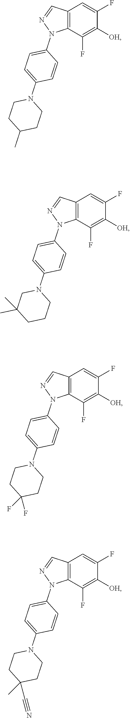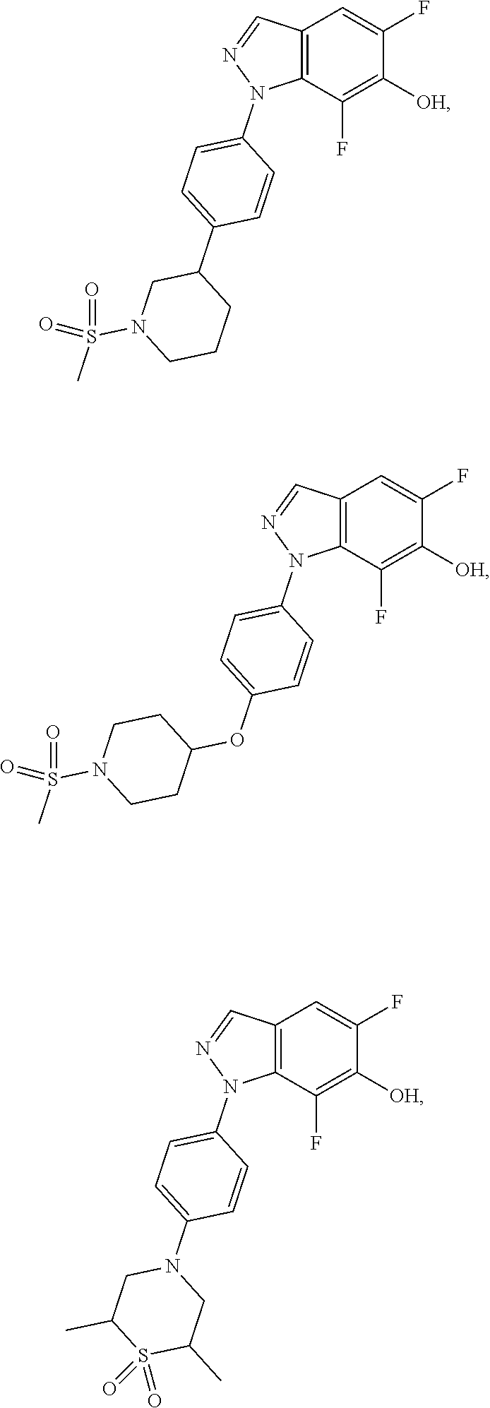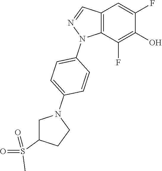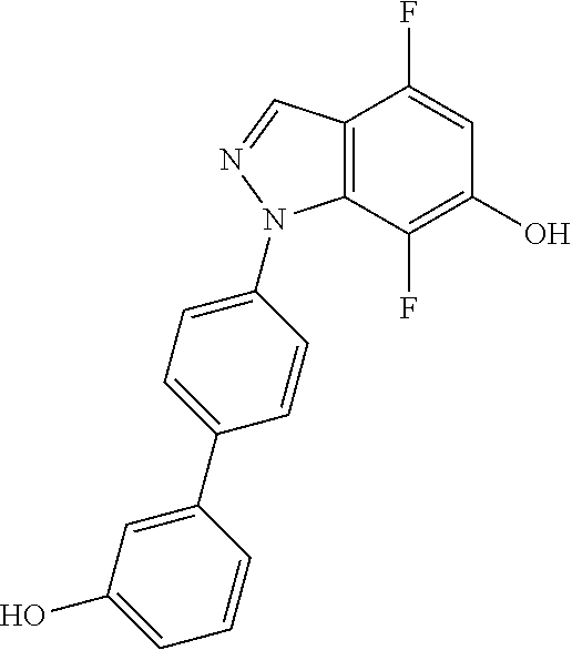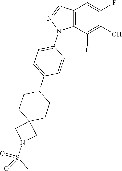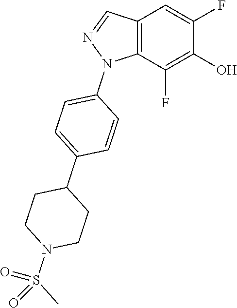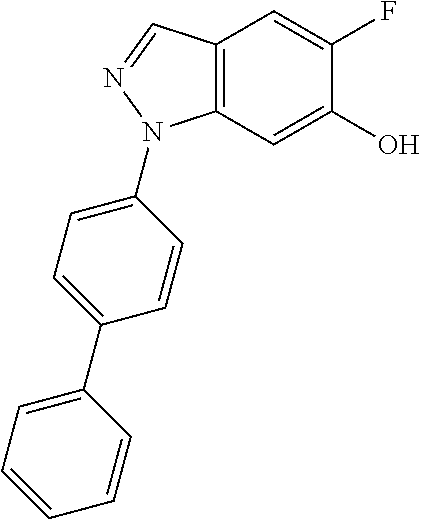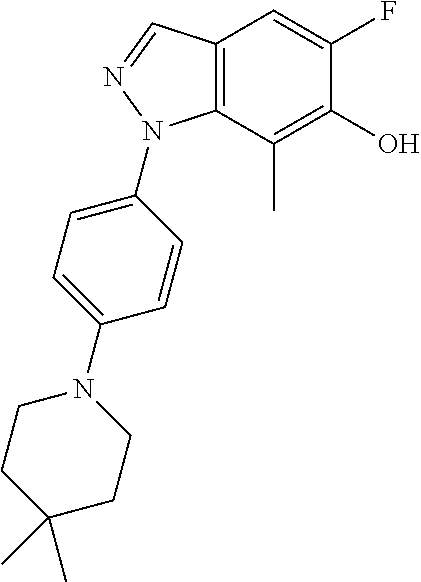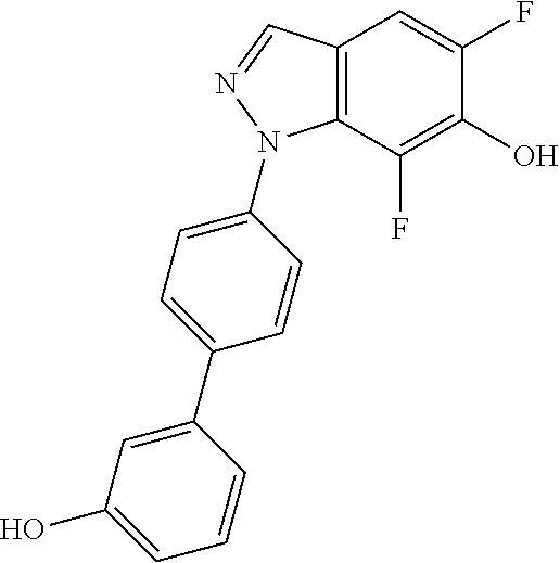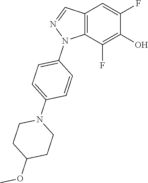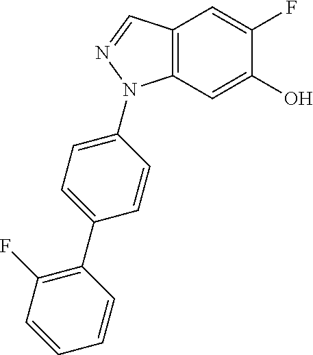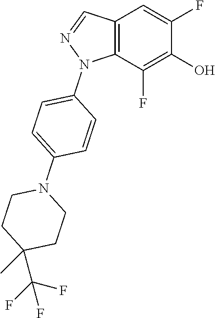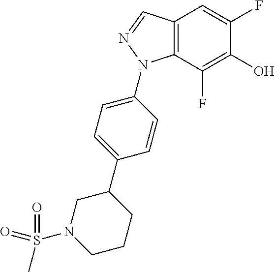 27.11 5,7-Difluoro-1-(2′,3′,4′,5′- tetrahydro-[1,1′-biphenyl]-4-yl)- 1H-indazol-6-ol 326.8 27.21 1-(4′,4′-Dimethyl-2′,3′,4′,5′- tetrahydro-[1,1′-biphenyl]-4-yl)- 5,7-difluoro-1H-indazol-6-ol 355.0 27.31 1-(4-(3,6-Dihydro-2H-pyran-4- yl)phenyl)-5,7-difluoro-1H- indazol-6-ol 328.9 27.41 5,7-Difluoro-1-(4-(1- (methylsulfonyl)-1,2,3,6- tetrahydropyridin-4-yl)phenyl)- 1H-indazol-6-ol 405.9 27.5 1-(4-Cyclohexylphenyl)-5,7- difluoro-1H-indazol-6-ol 328.9 27.6 5,7-Difluoro-1-(4-(tetrahydro-2H- pyran-4-yl)phenyl)-1H-indazol-6-ol 330.9 27.7 5,7-Difluoro-1-(4-(1- (methylsulfonyl)piperidin-4- yl)phenyl)-1H-indazol-6-ol 407.9 27.8 5,7-Difluoro-1-(4-(1- isopropylpiperidin-4-yl)phenyl)- 1H-indazol-6-ol 372.1 27.9 5,7-Difluoro-1-(4-(1- (methylsulfonyl)piperidin-4- yl)phenyl)-1H- benzo[d][1,2,3]triazol-6-ol 409.0 27.10 5,7-Difluoro-1-(4-(1- methylpiperidin-4-yl)phenyl)-1H- indazol-6-ol 344.0 Alternate conditions: Step 1: 0.5-28 h. Step 2: 17-93 h; THF as cosolvent. 1Step 1 only. Compound 28