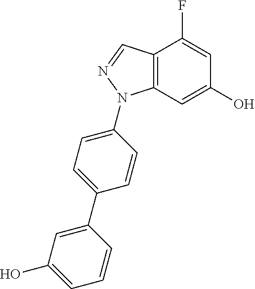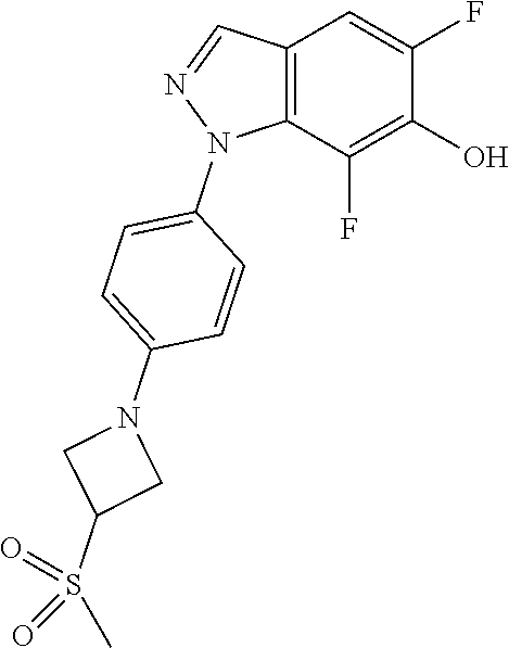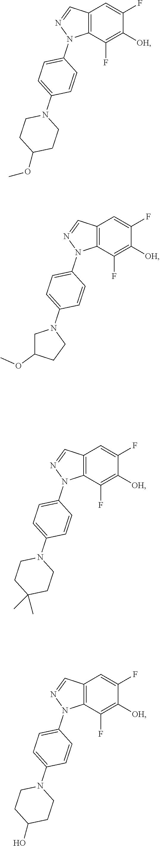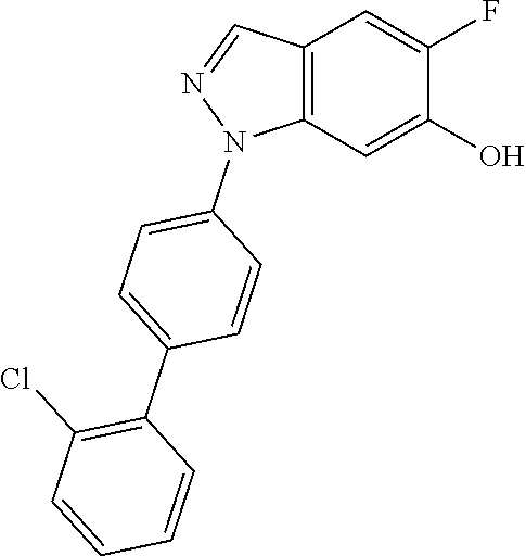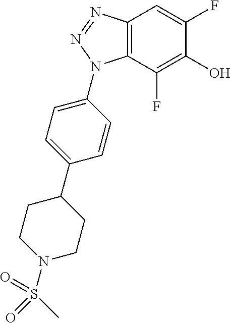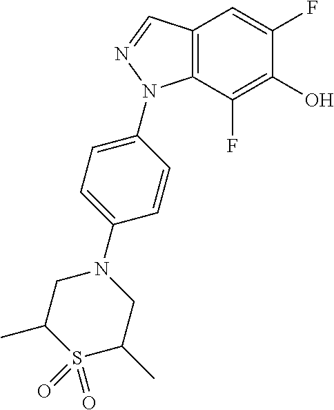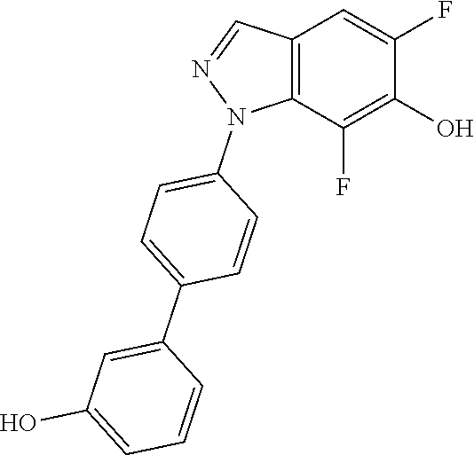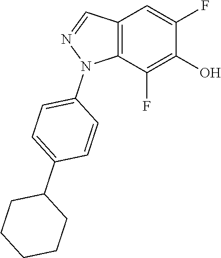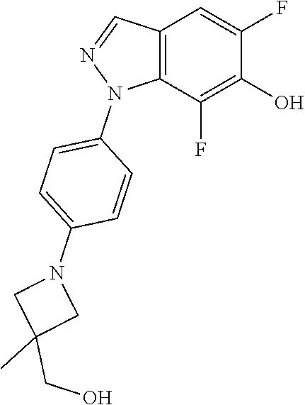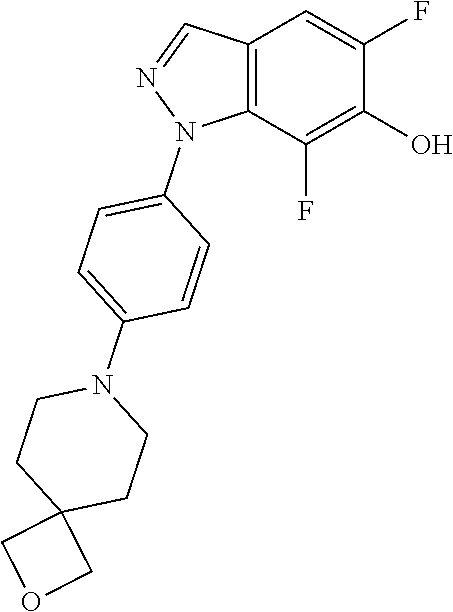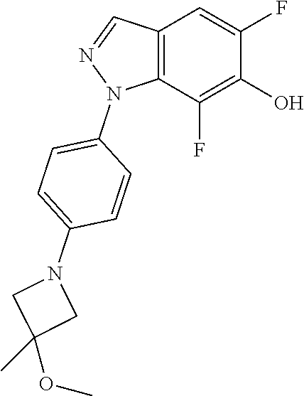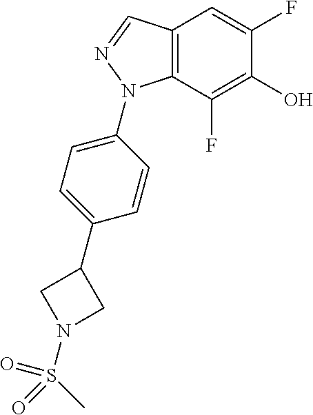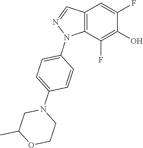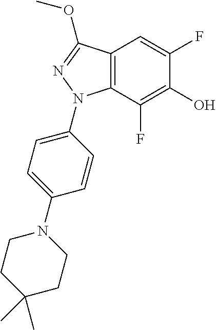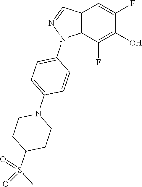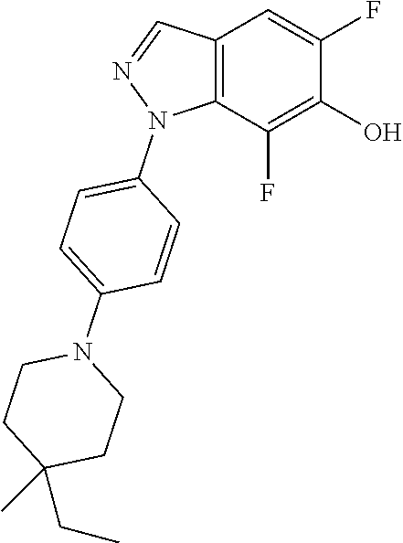 27.11 5,7-Difluoro-1-(2′,3′,4′,5′- tetrahydro-[1,1′-biphenyl]-4-yl)- 1H-indazol-6-ol 326.8 27.21 1-(4′,4′-Dimethyl-2′,3′,4′,5′- tetrahydro-[1,1′-biphenyl]-4-yl)- 5,7-difluoro-1H-indazol-6-ol 355.0 27.31 1-(4-(3,6-Dihydro-2H-pyran-4- yl)phenyl)-5,7-difluoro-1H- indazol-6-ol 328.9 27.41 5,7-Difluoro-1-(4-(1- (methylsulfonyl)-1,2,3,6- tetrahydropyridin-4-yl)phenyl)- 1H-indazol-6-ol 405.9 27.5 1-(4-Cyclohexylphenyl)-5,7- difluoro-1H-indazol-6-ol 328.9 27.6 5,7-Difluoro-1-(4-(tetrahydro-2H- pyran-4-yl)phenyl)-1H-indazol-6-ol 330.9 27.7 5,7-Difluoro-1-(4-(1- (methylsulfonyl)piperidin-4- yl)phenyl)-1H-indazol-6-ol 407.9 27.8 5,7-Difluoro-1-(4-(1- isopropylpiperidin-4-yl)phenyl)- 1H-indazol-6-ol 372.1 27.9 5,7-Difluoro-1-(4-(1- (methylsulfonyl)piperidin-4- yl)phenyl)-1H- benzo[d][1,2,3]triazol-6-ol 409.0 27.10 5,7-Difluoro-1-(4-(1- methylpiperidin-4-yl)phenyl)-1H- indazol-6-ol 344.0 Alternate conditions: Step 1: 0.5-28 h. Step 2: 17-93 h; THF as cosolvent. 1Step 1 only. Compound 28