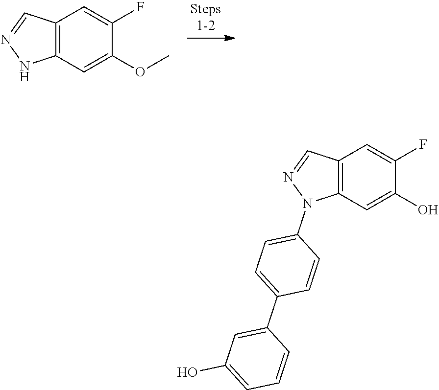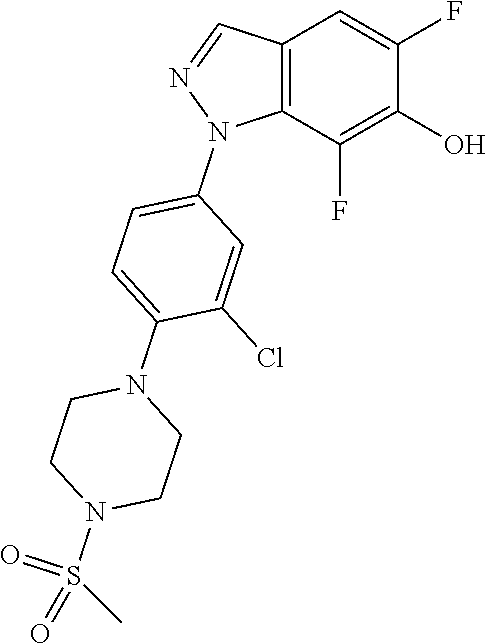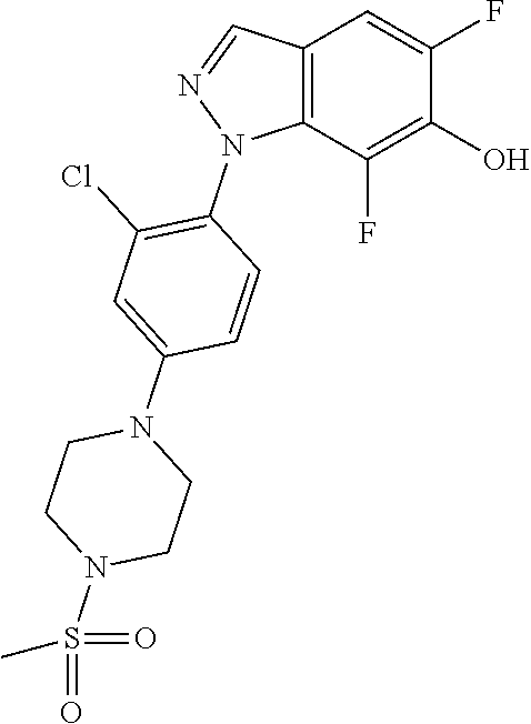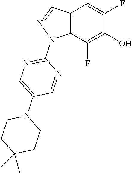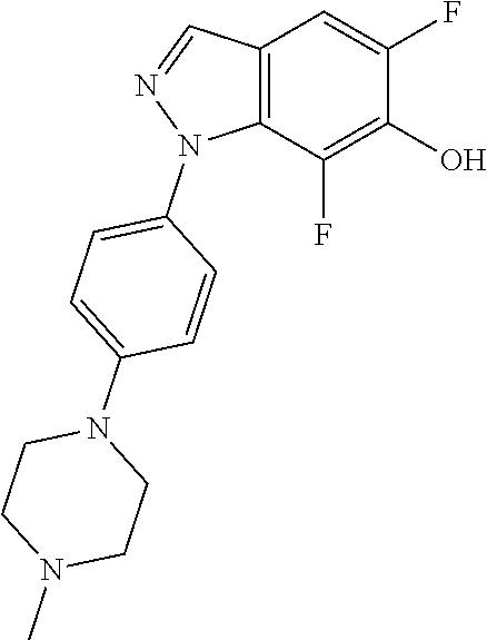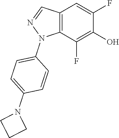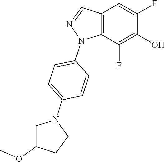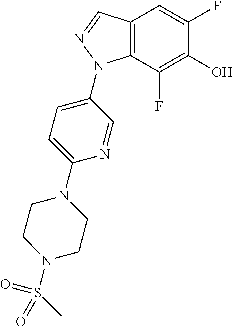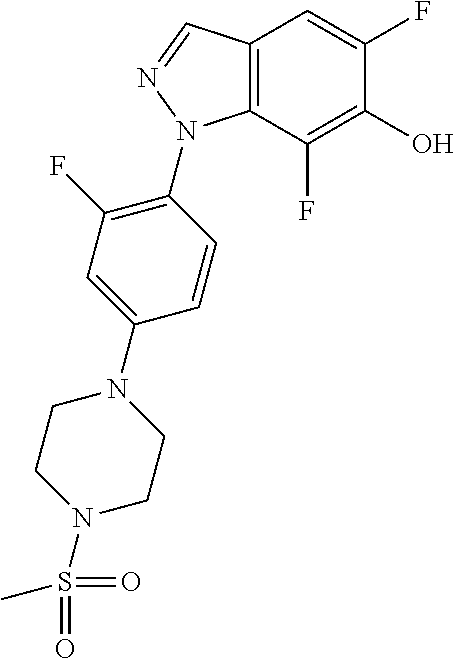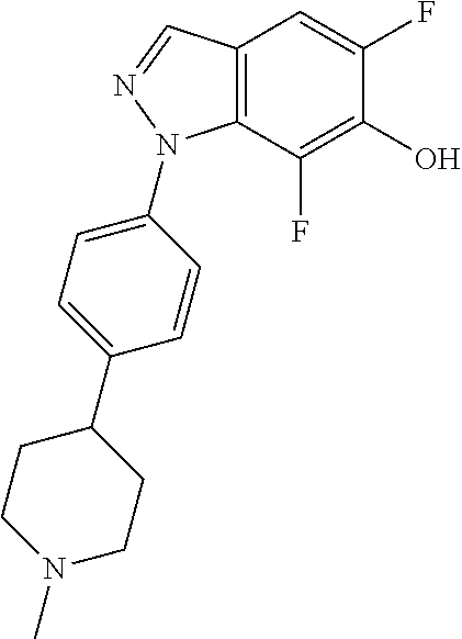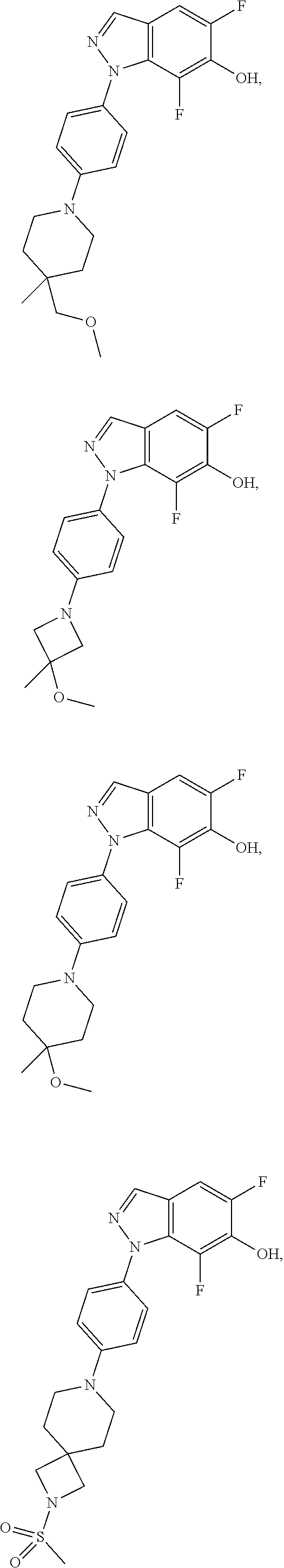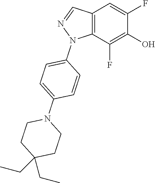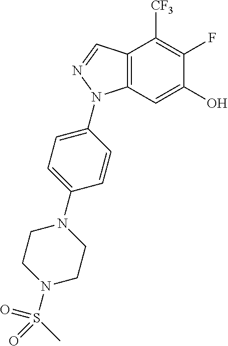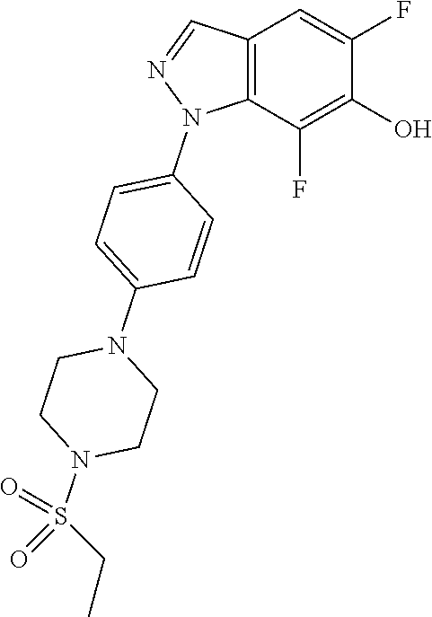 27.11 5,7-Difluoro-1-(2′,3′,4′,5′- tetrahydro-[1,1′-biphenyl]-4-yl)- 1H-indazol-6-ol 326.8 27.21 1-(4′,4′-Dimethyl-2′,3′,4′,5′- tetrahydro-[1,1′-biphenyl]-4-yl)- 5,7-difluoro-1H-indazol-6-ol 355.0 27.31 1-(4-(3,6-Dihydro-2H-pyran-4- yl)phenyl)-5,7-difluoro-1H- indazol-6-ol 328.9 27.41 5,7-Difluoro-1-(4-(1- (methylsulfonyl)-1,2,3,6- tetrahydropyridin-4-yl)phenyl)- 1H-indazol-6-ol 405.9 27.5 1-(4-Cyclohexylphenyl)-5,7- difluoro-1H-indazol-6-ol 328.9 27.6 5,7-Difluoro-1-(4-(tetrahydro-2H- pyran-4-yl)phenyl)-1H-indazol-6-ol 330.9 27.7 5,7-Difluoro-1-(4-(1- (methylsulfonyl)piperidin-4- yl)phenyl)-1H-indazol-6-ol 407.9 27.8 5,7-Difluoro-1-(4-(1- isopropylpiperidin-4-yl)phenyl)- 1H-indazol-6-ol 372.1 27.9 5,7-Difluoro-1-(4-(1- (methylsulfonyl)piperidin-4- yl)phenyl)-1H- benzo[d][1,2,3]triazol-6-ol 409.0 27.10 5,7-Difluoro-1-(4-(1- methylpiperidin-4-yl)phenyl)-1H- indazol-6-ol 344.0 Alternate conditions: Step 1: 0.5-28 h. Step 2: 17-93 h; THF as cosolvent. 1Step 1 only. Compound 28
