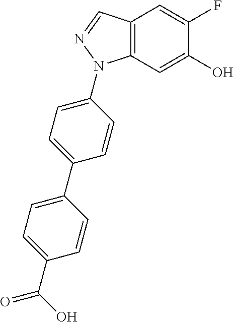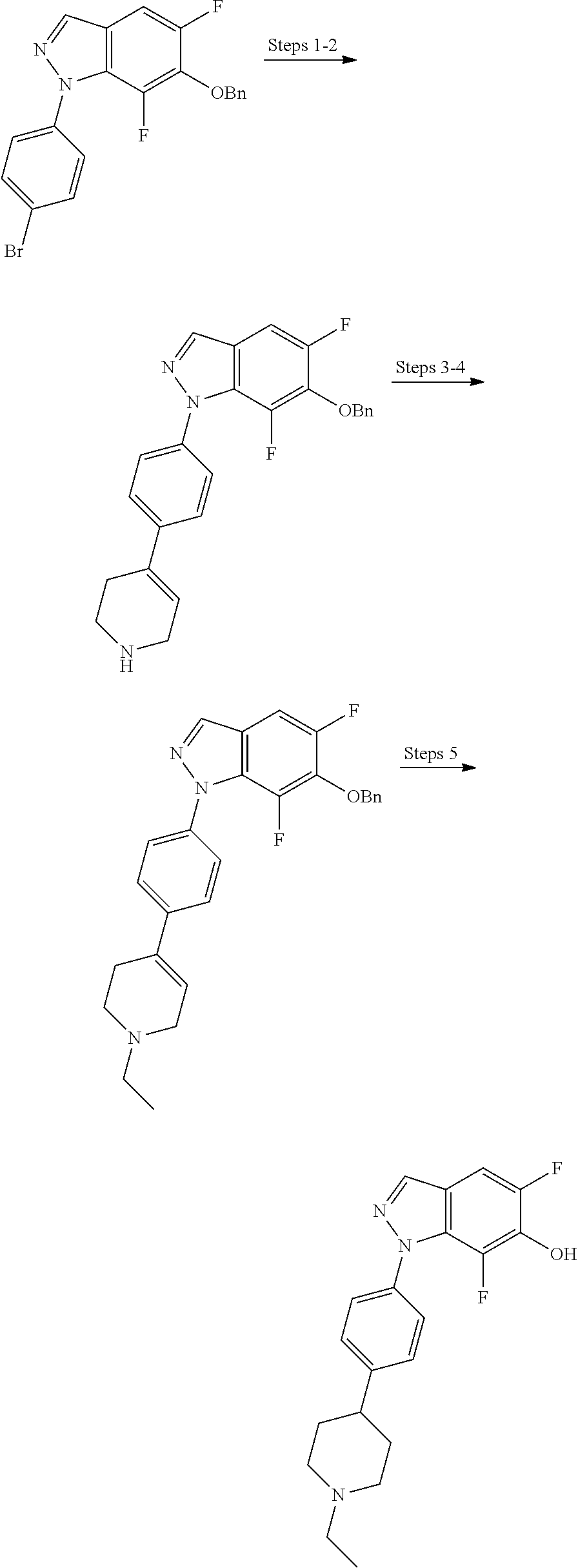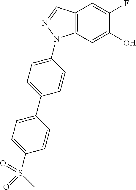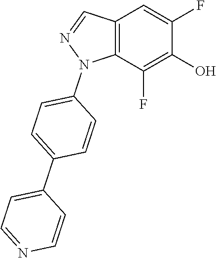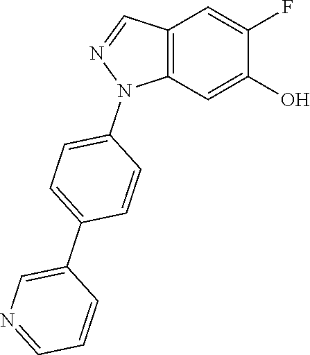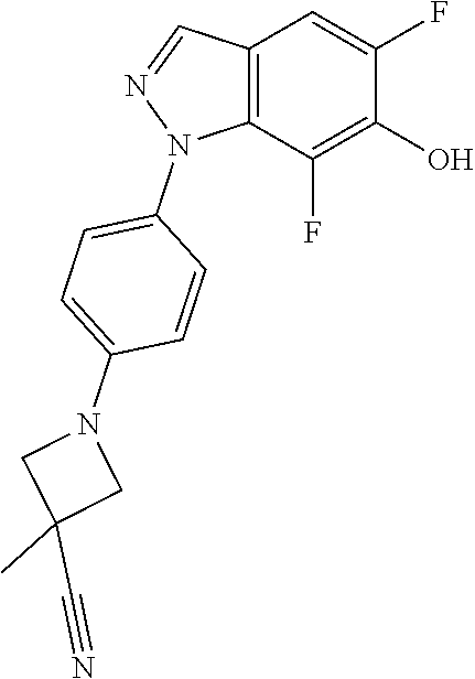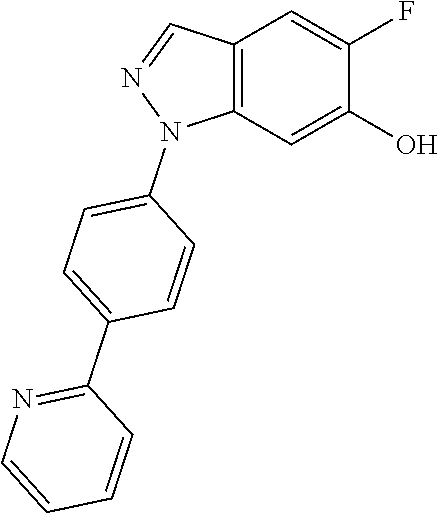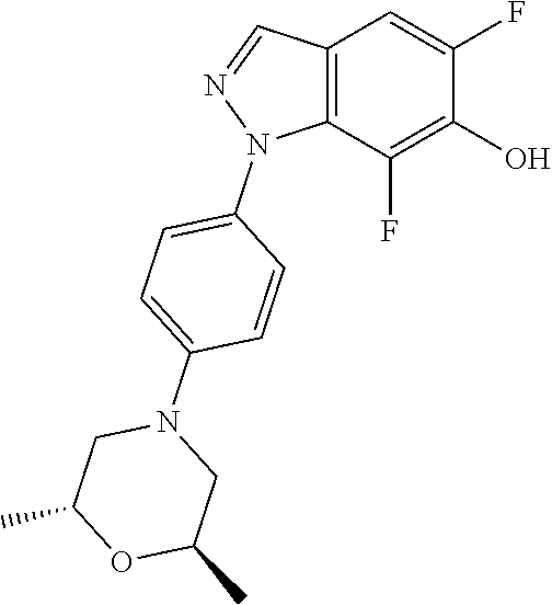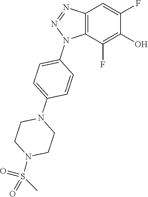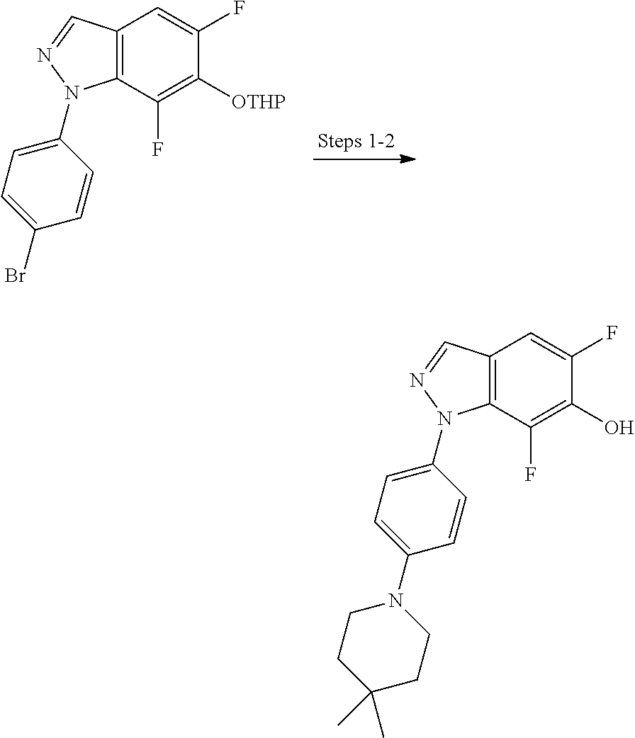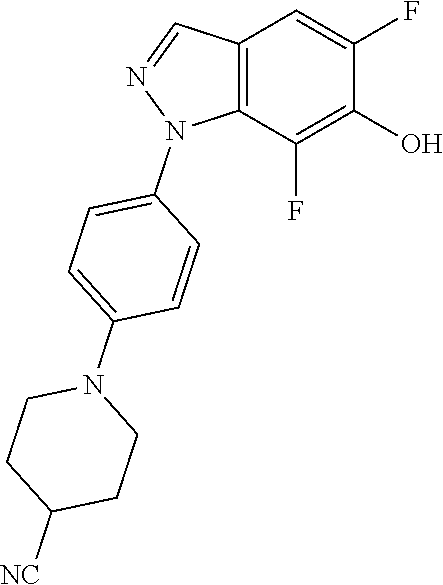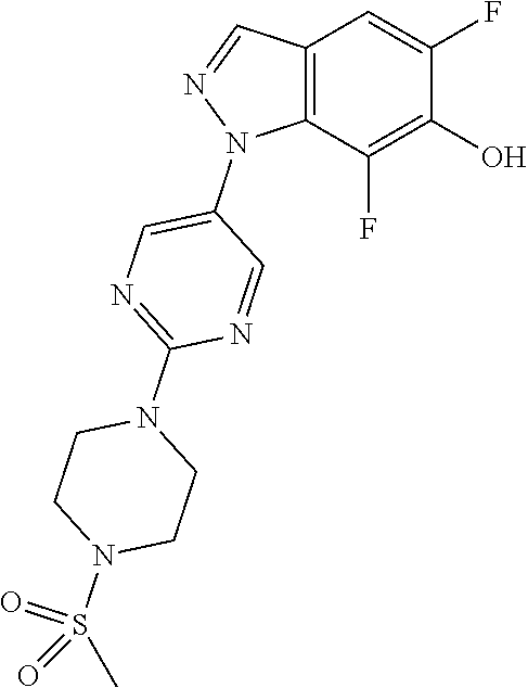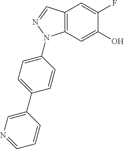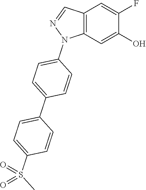 27.11 5,7-Difluoro-1-(2′,3′,4′,5′- tetrahydro-[1,1′-biphenyl]-4-yl)- 1H-indazol-6-ol 326.8 27.21 1-(4′,4′-Dimethyl-2′,3′,4′,5′- tetrahydro-[1,1′-biphenyl]-4-yl)- 5,7-difluoro-1H-indazol-6-ol 355.0 27.31 1-(4-(3,6-Dihydro-2H-pyran-4- yl)phenyl)-5,7-difluoro-1H- indazol-6-ol 328.9 27.41 5,7-Difluoro-1-(4-(1- (methylsulfonyl)-1,2,3,6- tetrahydropyridin-4-yl)phenyl)- 1H-indazol-6-ol 405.9 27.5 1-(4-Cyclohexylphenyl)-5,7- difluoro-1H-indazol-6-ol 328.9 27.6 5,7-Difluoro-1-(4-(tetrahydro-2H- pyran-4-yl)phenyl)-1H-indazol-6-ol 330.9 27.7 5,7-Difluoro-1-(4-(1- (methylsulfonyl)piperidin-4- yl)phenyl)-1H-indazol-6-ol 407.9 27.8 5,7-Difluoro-1-(4-(1- isopropylpiperidin-4-yl)phenyl)- 1H-indazol-6-ol 372.1 27.9 5,7-Difluoro-1-(4-(1- (methylsulfonyl)piperidin-4- yl)phenyl)-1H- benzo[d][1,2,3]triazol-6-ol 409.0 27.10 5,7-Difluoro-1-(4-(1- methylpiperidin-4-yl)phenyl)-1H- indazol-6-ol 344.0 Alternate conditions: Step 1: 0.5-28 h. Step 2: 17-93 h; THF as cosolvent. 1Step 1 only. Compound 28