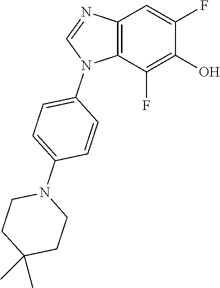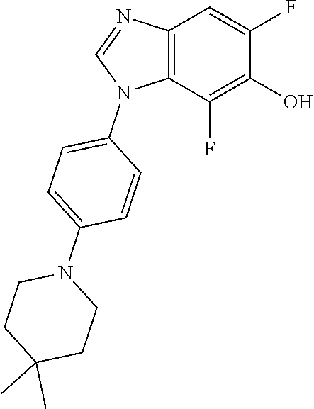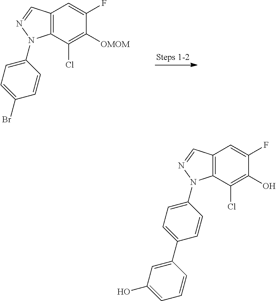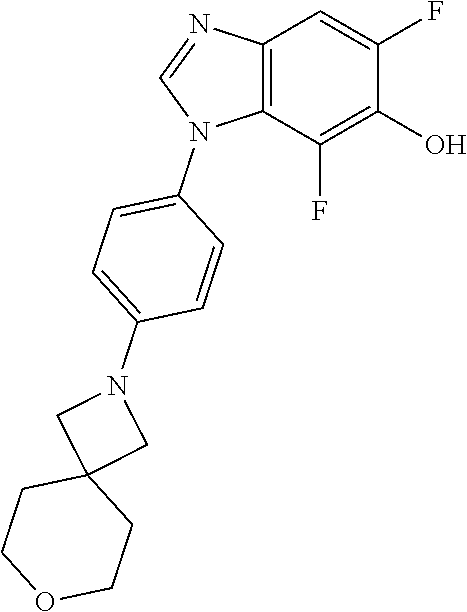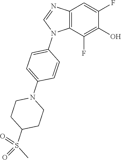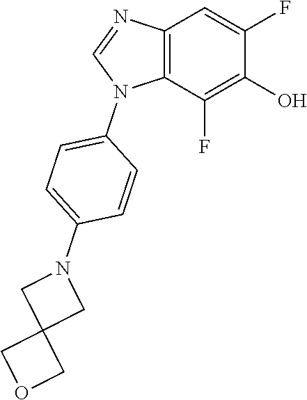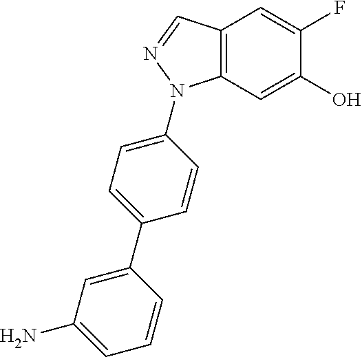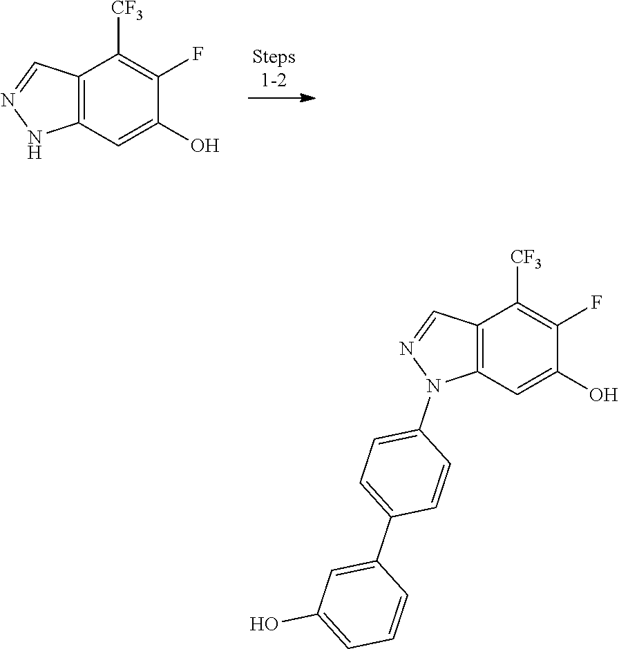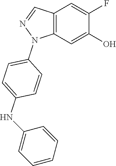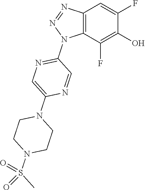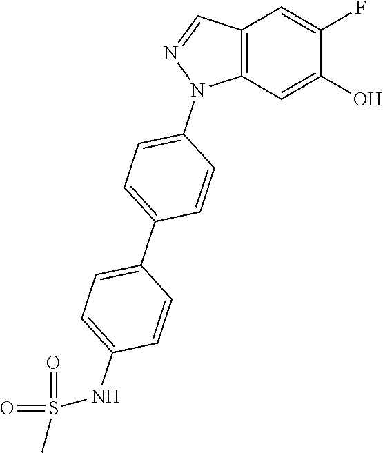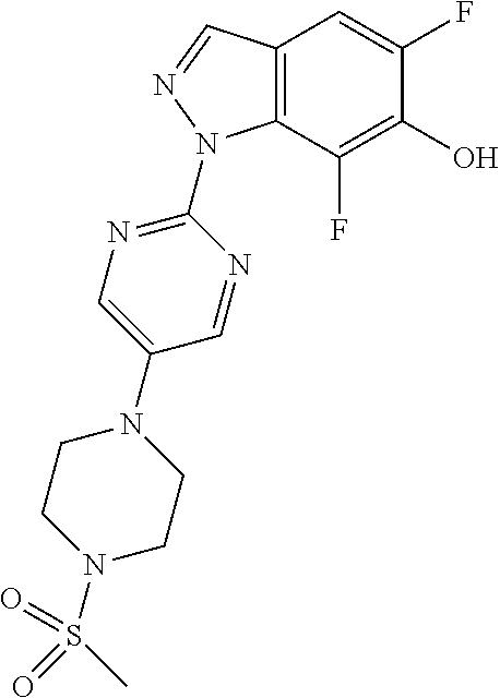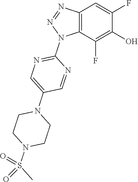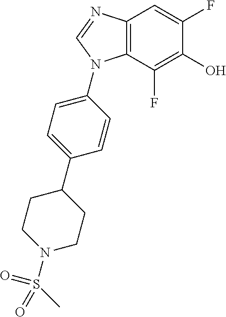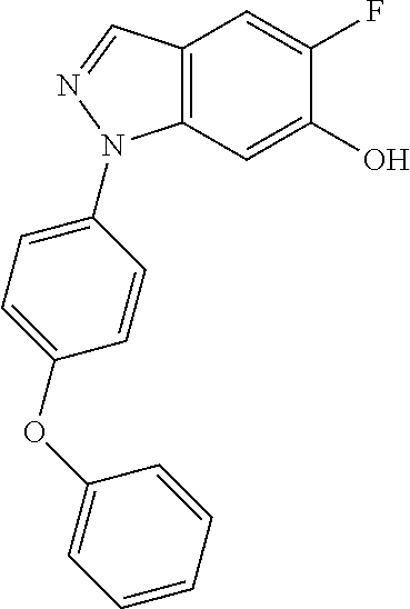 27.11 5,7-Difluoro-1-(2′,3′,4′,5′- tetrahydro-[1,1′-biphenyl]-4-yl)- 1H-indazol-6-ol 326.8 27.21 1-(4′,4′-Dimethyl-2′,3′,4′,5′- tetrahydro-[1,1′-biphenyl]-4-yl)- 5,7-difluoro-1H-indazol-6-ol 355.0 27.31 1-(4-(3,6-Dihydro-2H-pyran-4- yl)phenyl)-5,7-difluoro-1H- indazol-6-ol 328.9 27.41 5,7-Difluoro-1-(4-(1- (methylsulfonyl)-1,2,3,6- tetrahydropyridin-4-yl)phenyl)- 1H-indazol-6-ol 405.9 27.5 1-(4-Cyclohexylphenyl)-5,7- difluoro-1H-indazol-6-ol 328.9 27.6 5,7-Difluoro-1-(4-(tetrahydro-2H- pyran-4-yl)phenyl)-1H-indazol-6-ol 330.9 27.7 5,7-Difluoro-1-(4-(1- (methylsulfonyl)piperidin-4- yl)phenyl)-1H-indazol-6-ol 407.9 27.8 5,7-Difluoro-1-(4-(1- isopropylpiperidin-4-yl)phenyl)- 1H-indazol-6-ol 372.1 27.9 5,7-Difluoro-1-(4-(1- (methylsulfonyl)piperidin-4- yl)phenyl)-1H- benzo[d][1,2,3]triazol-6-ol 409.0 27.10 5,7-Difluoro-1-(4-(1- methylpiperidin-4-yl)phenyl)-1H- indazol-6-ol 344.0 Alternate conditions: Step 1: 0.5-28 h. Step 2: 17-93 h; THF as cosolvent. 1Step 1 only. Compound 28