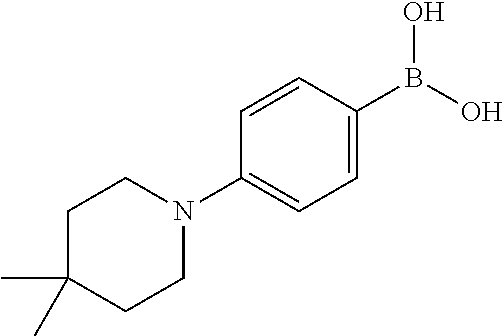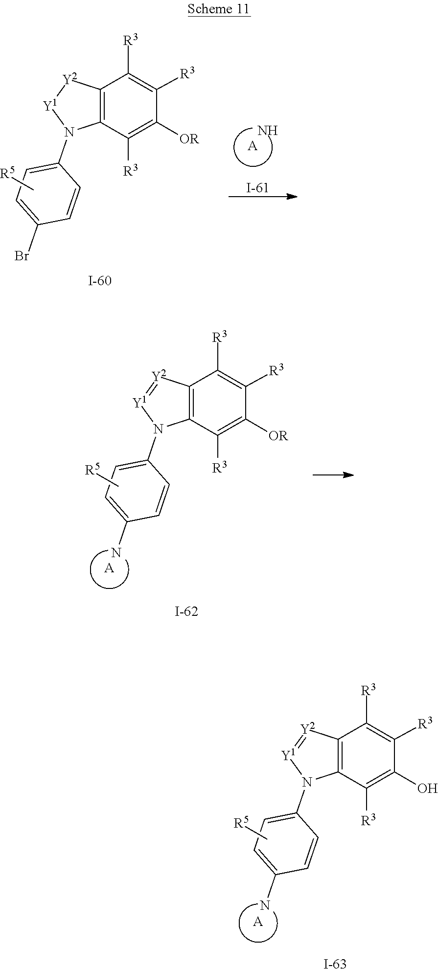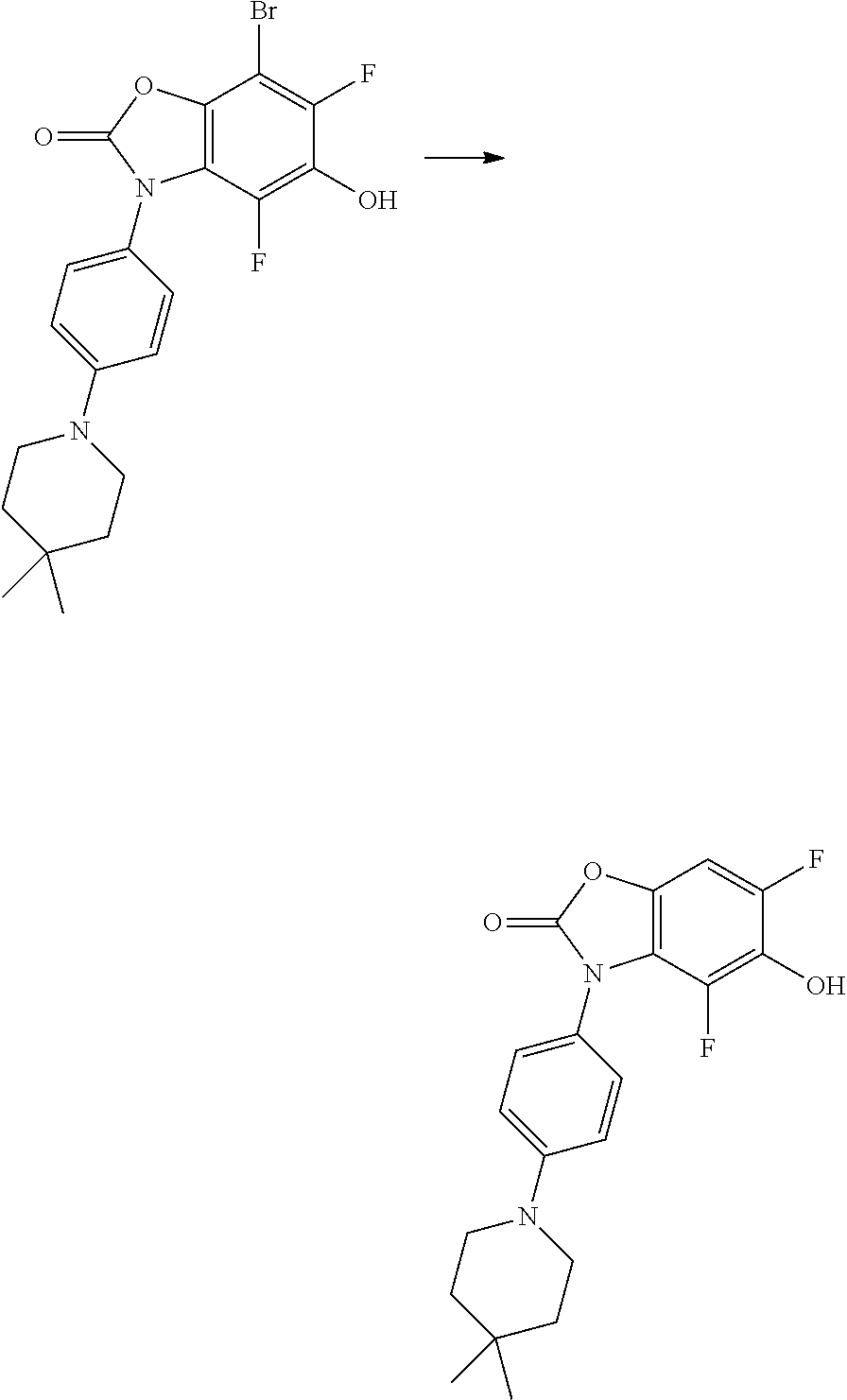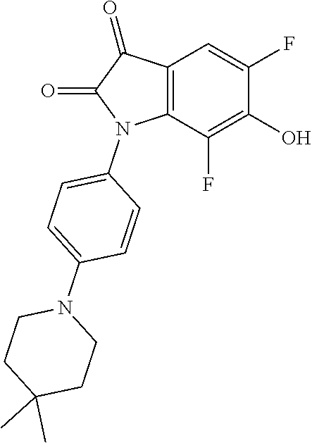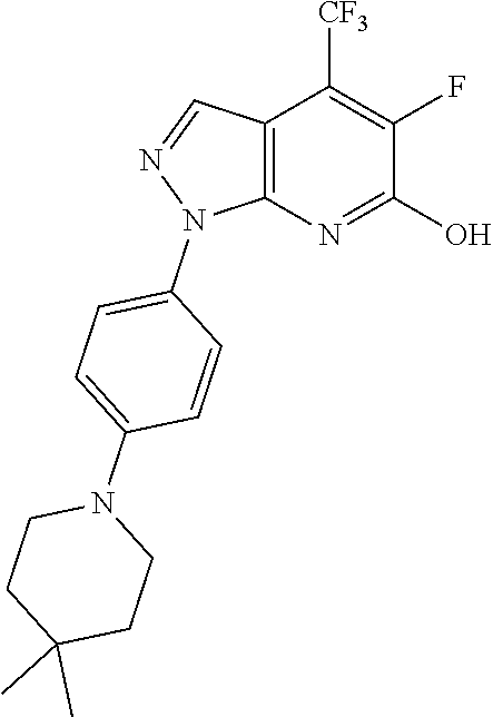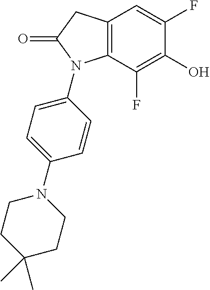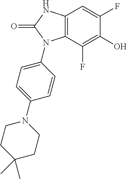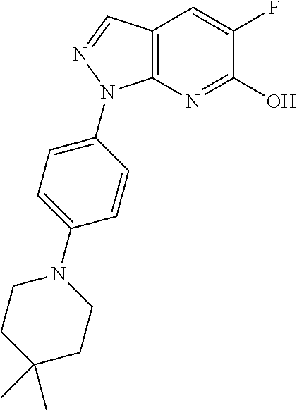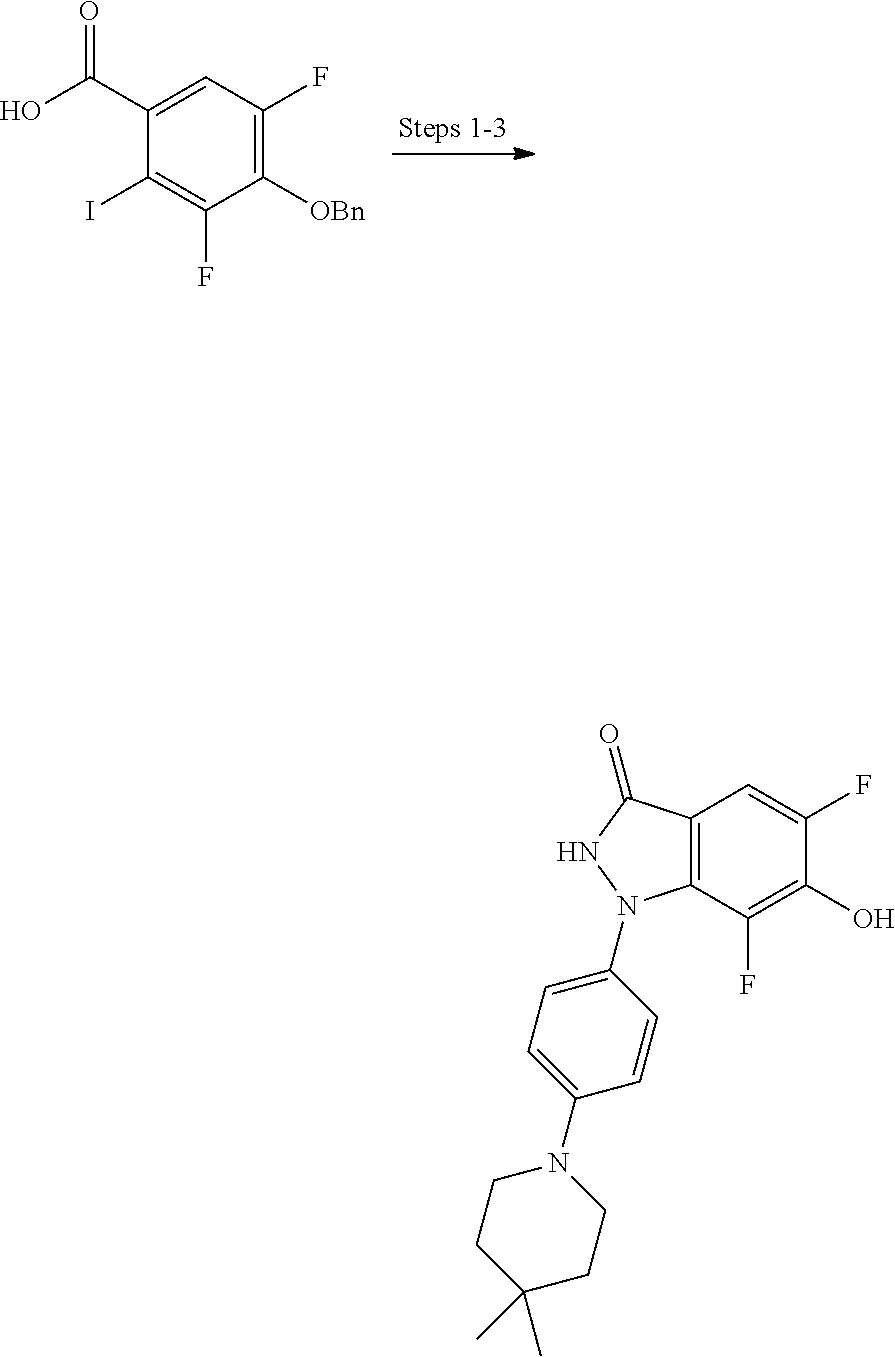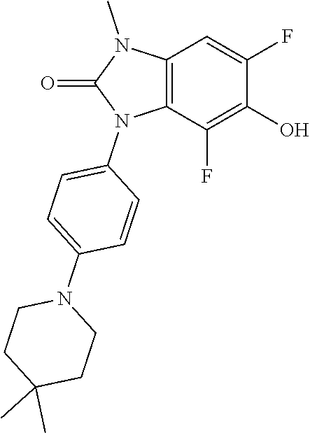 27.11 5,7-Difluoro-1-(2′,3′,4′,5′- tetrahydro-[1,1′-biphenyl]-4-yl)- 1H-indazol-6-ol 326.8 27.21 1-(4′,4′-Dimethyl-2′,3′,4′,5′- tetrahydro-[1,1′-biphenyl]-4-yl)- 5,7-difluoro-1H-indazol-6-ol 355.0 27.31 1-(4-(3,6-Dihydro-2H-pyran-4- yl)phenyl)-5,7-difluoro-1H- indazol-6-ol 328.9 27.41 5,7-Difluoro-1-(4-(1- (methylsulfonyl)-1,2,3,6- tetrahydropyridin-4-yl)phenyl)- 1H-indazol-6-ol 405.9 27.5 1-(4-Cyclohexylphenyl)-5,7- difluoro-1H-indazol-6-ol 328.9 27.6 5,7-Difluoro-1-(4-(tetrahydro-2H- pyran-4-yl)phenyl)-1H-indazol-6-ol 330.9 27.7 5,7-Difluoro-1-(4-(1- (methylsulfonyl)piperidin-4- yl)phenyl)-1H-indazol-6-ol 407.9 27.8 5,7-Difluoro-1-(4-(1- isopropylpiperidin-4-yl)phenyl)- 1H-indazol-6-ol 372.1 27.9 5,7-Difluoro-1-(4-(1- (methylsulfonyl)piperidin-4- yl)phenyl)-1H- benzo[d][1,2,3]triazol-6-ol 409.0 27.10 5,7-Difluoro-1-(4-(1- methylpiperidin-4-yl)phenyl)-1H- indazol-6-ol 344.0 Alternate conditions: Step 1: 0.5-28 h. Step 2: 17-93 h; THF as cosolvent. 1Step 1 only. Compound 28