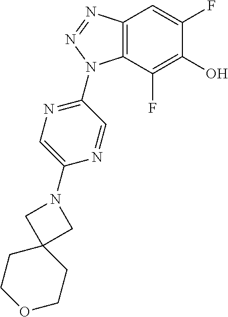 42.1 1-(2-(7-Oxa-2-azaspiro[3.5]nonan- 2-yl)pyrimidin-5-yl)-5,7-difluoro- 1H-benzo[d][1,2,3]triazol-6-ol 375.2 Example A-1: Parenteral Pharmaceutical Composition