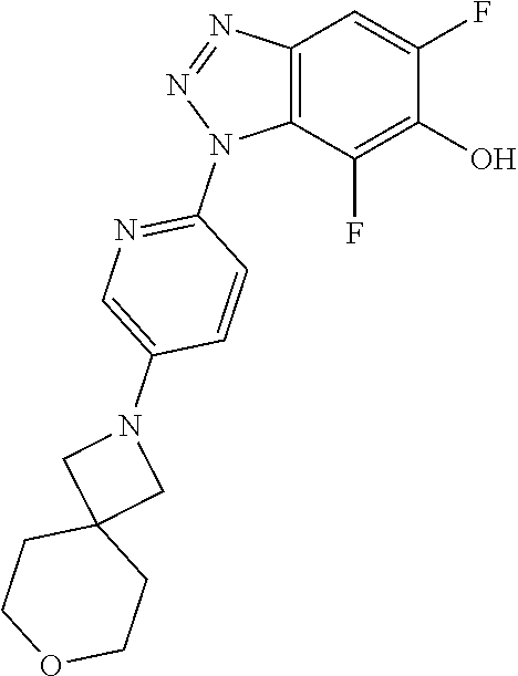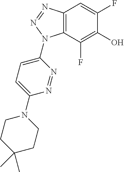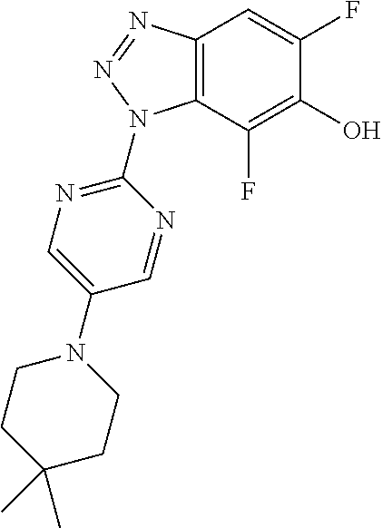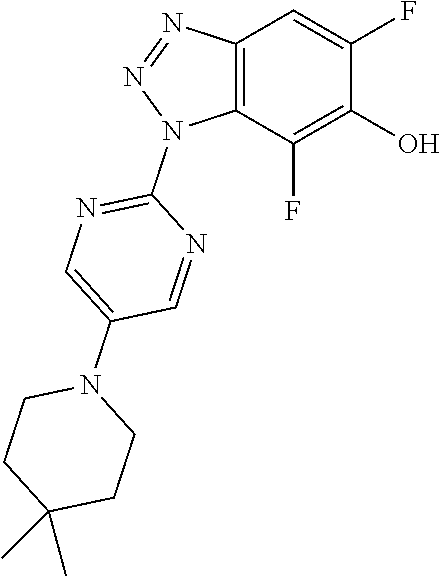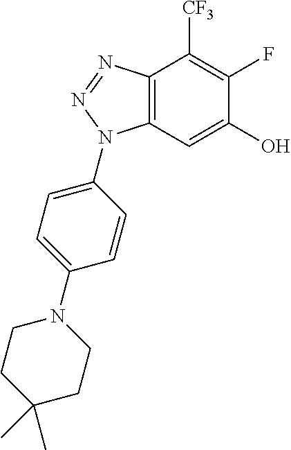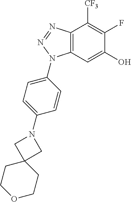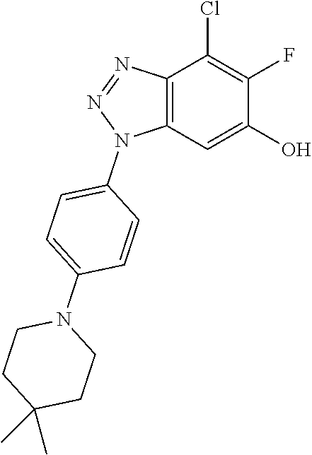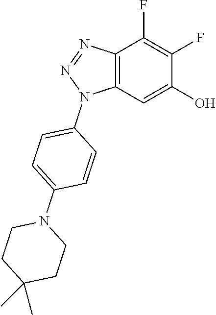 40.1 4-Chloro-1-(4-(4,4- dimethylpiperidin-1-yl)phenyl)-5- fluoro-1H-benzo[d][1,2,3]triazol- 6-ol 375.0 40.2 1-(4-(4,4-Dimethylpiperidin-1- yl)phenyl)-4,5-difluoro-1H- benzo[d][1,2,3]triazol-6-ol 359.1 40.3 1-(4-(7-oxa-2-azaspiro[3.5]nonan- 2-yl)phenyl)-4,5-difluoro-1H- benzo[d][1,2,3]triazol-6-ol 373.1 Compound 41