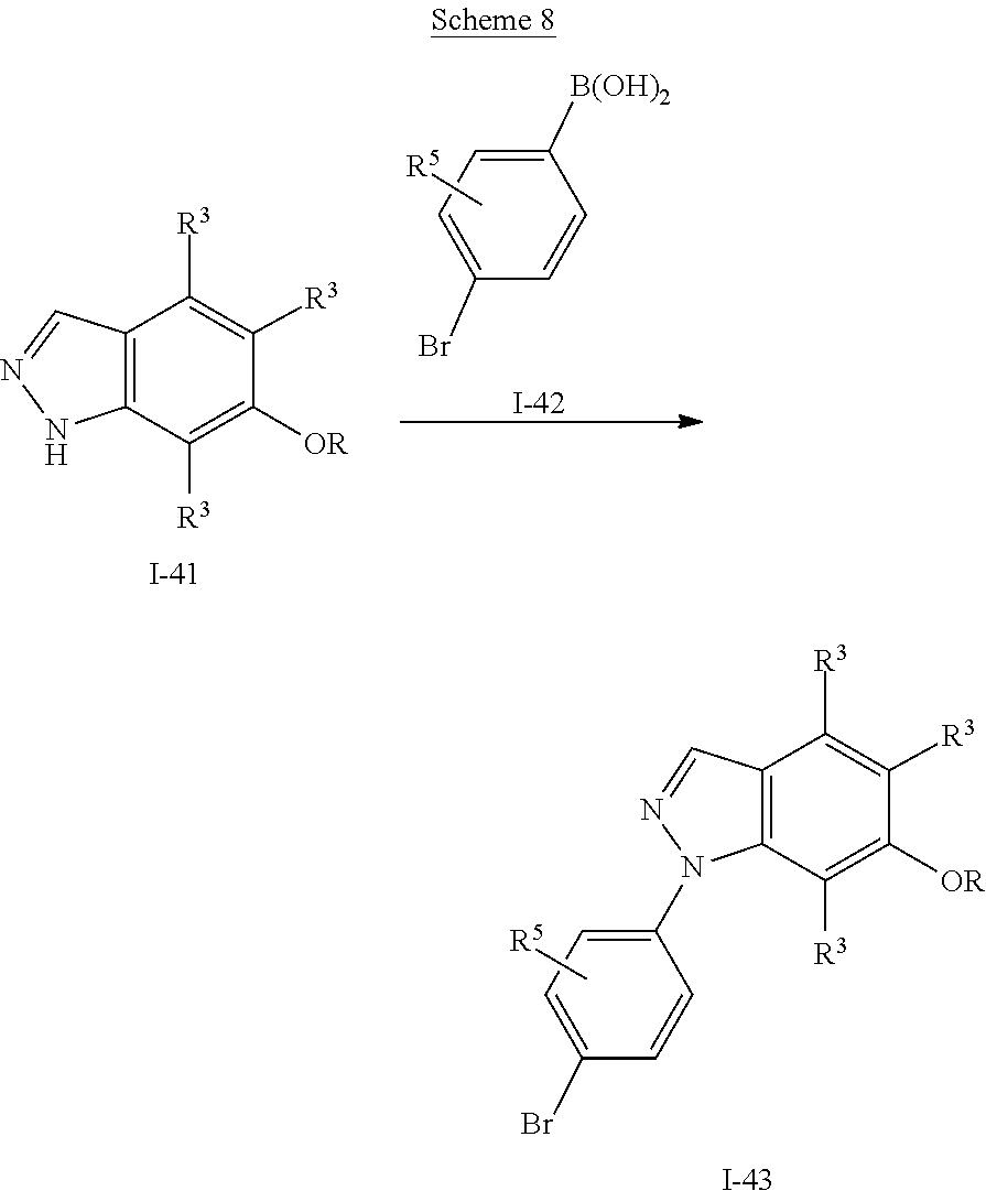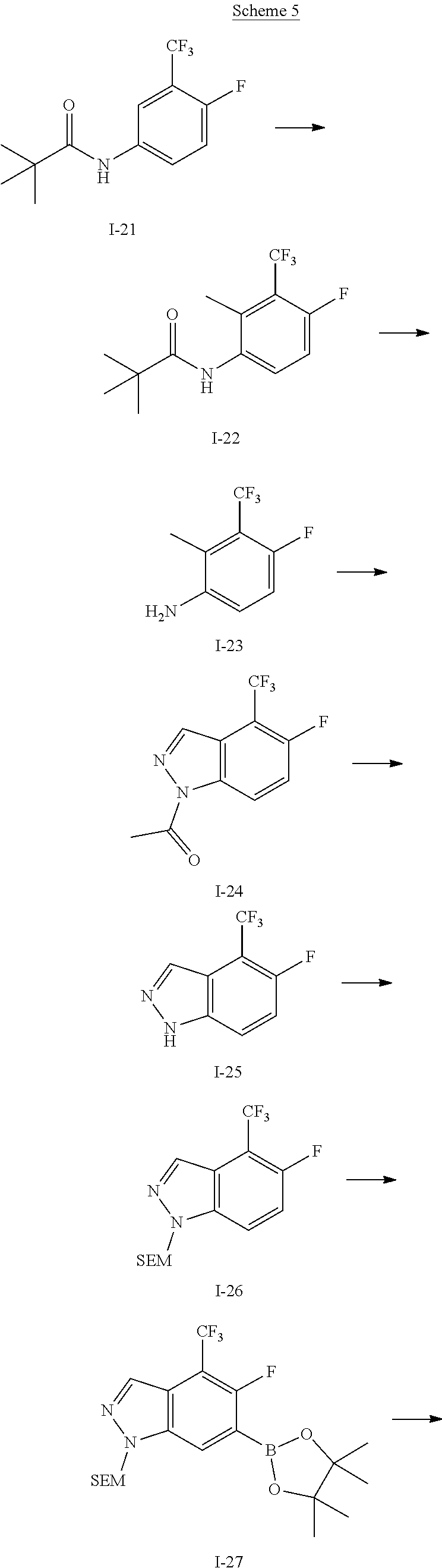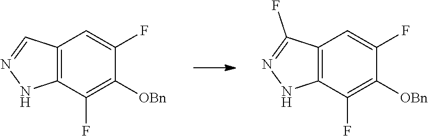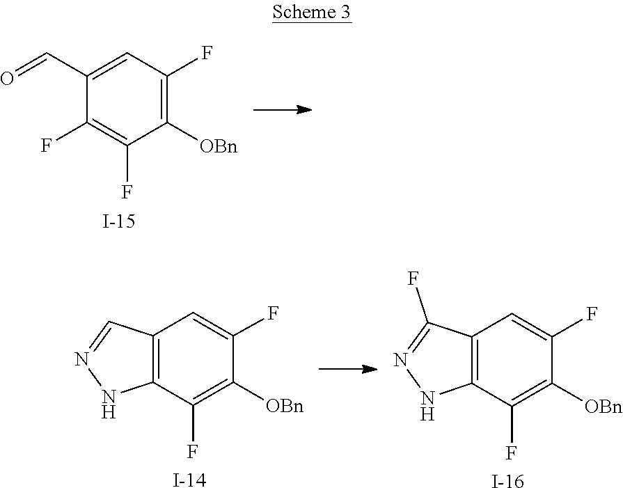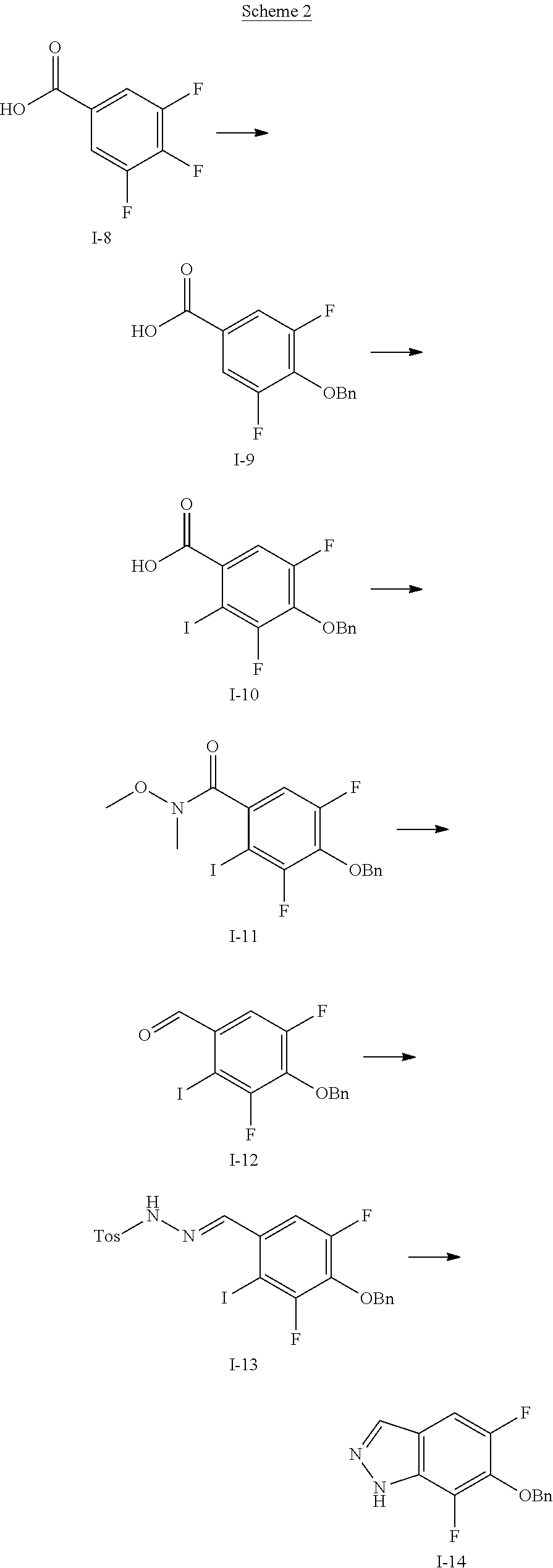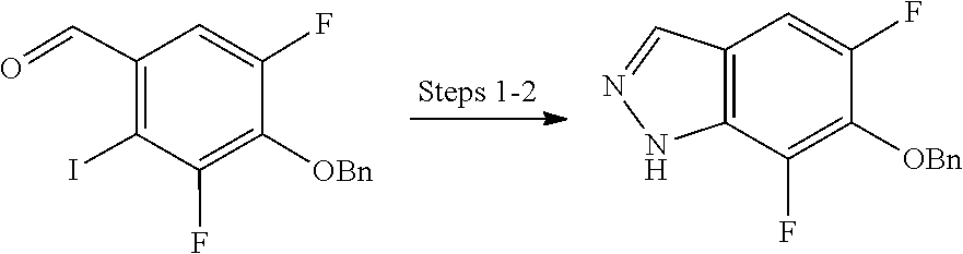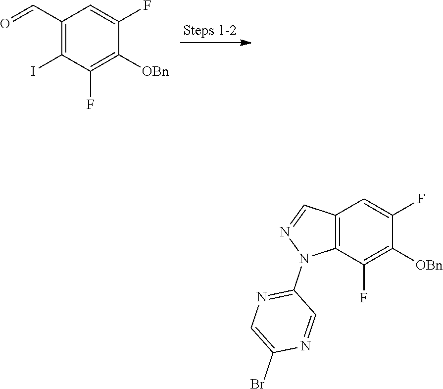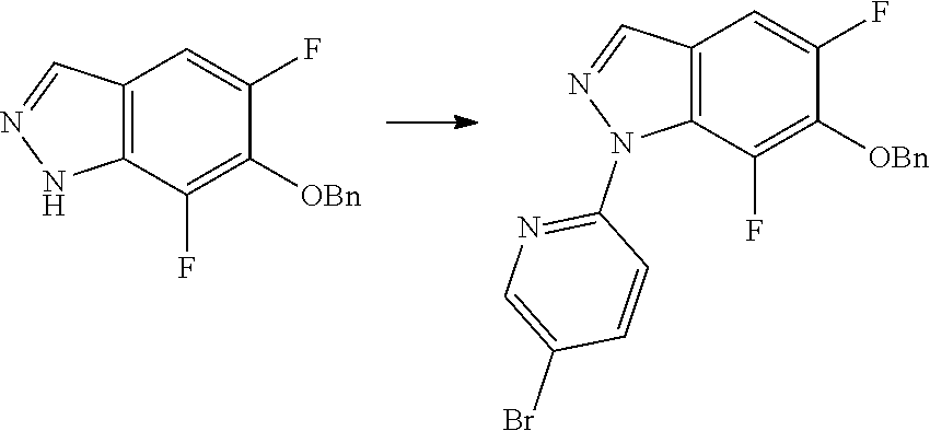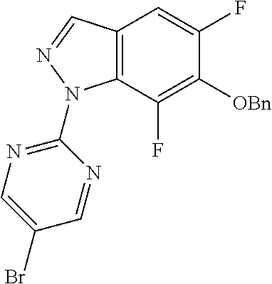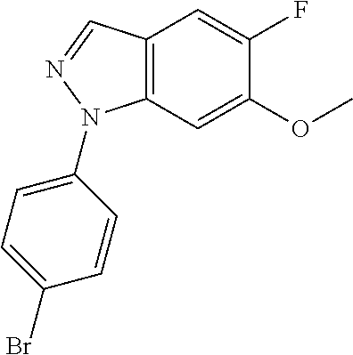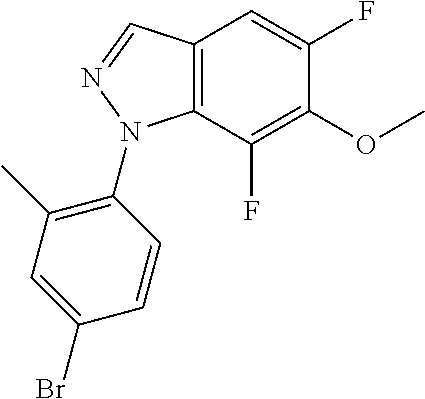 13.13 1-(4-Bromophenyl)-7-chloro-5- fluoro-6-(methoxymethoxy)-1H- indazole 385.0 13.2 1-(4-Bromophenyl)-5-fluoro-6- (methoxymethoxy)-4- (trifluoromethyl)-1H-indazole 419.0 13.34 6-(Benzyloxy)-1-(4- bromophenyl)-1H-indazole 378.9 13.41,4 6-(Benzyloxy)-1-(6-bromopyridin- 3-yl)-5,7-difluoro-1H-indazole 416.0 13.54 1-(4-Bromophenyl)-7-fluoro-6- methoxy-1H-indazole 320.8 13.64 1-(4-Bromophenyl)-5-fluoro-6- methoxy-1H-indazole 320.9 13.74 1-(4-Bromo-2-methylphenyl)-5- fluoro-6-methoxy-1H-indazole 334.9 13.84 1-(6-Bromopyridin-3-yl)-5-fluoro- 6-methoxy-1H-indazole 321.8 13.92,4 1-(5-Bromopyridin-2-yl)-5-fluoro- 6-methoxy-1H-indazole 321.8 13.10 1-(4-Bromophenyl)-5-fluoro-6- (methoxymethoxy)-7-methyl-1H- indazole 365.1 13.114 6-(Benzyloxy)-1-(4- bromophenyl)-5-fluoro-1H- indazole-7-carbonitrile 422.1 Alternate conditions: Step 1: MOM-Cl added at 0° C. Step 2: 16-64 h; in some instances, additional boronic acid, Cu(OAc)2, and pyridine were needed for full conversion; 1DCE, 80° C., ON; 2CH2Cl2, rt, 64 h then DMF, 110° C., 41 h. 3Isolated as a mixture of N1/N2 isomers. 4Step 2 only. Intermediate 14