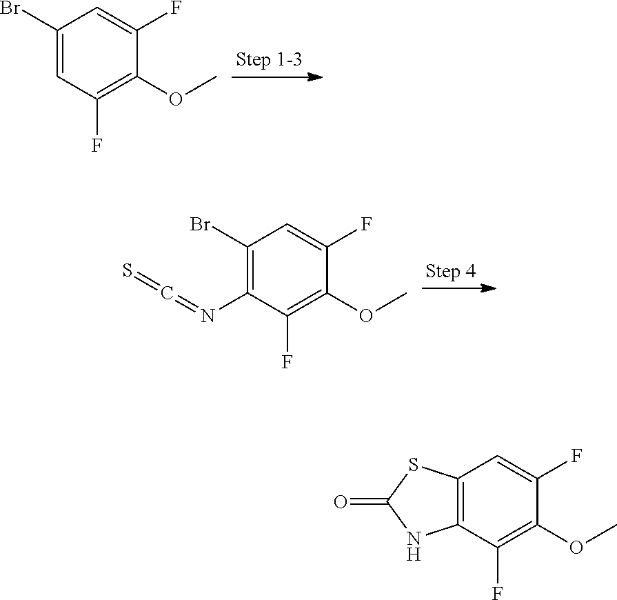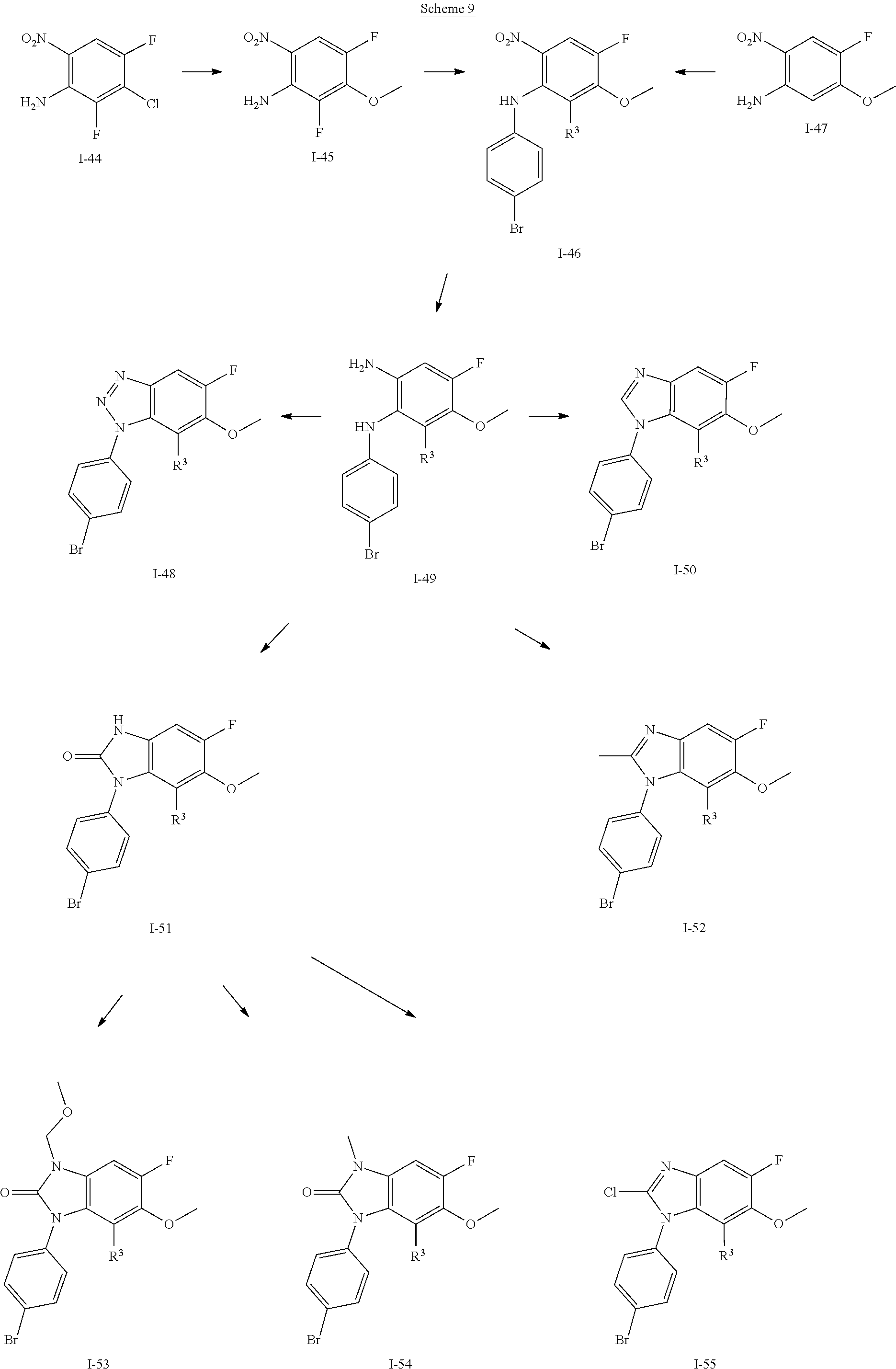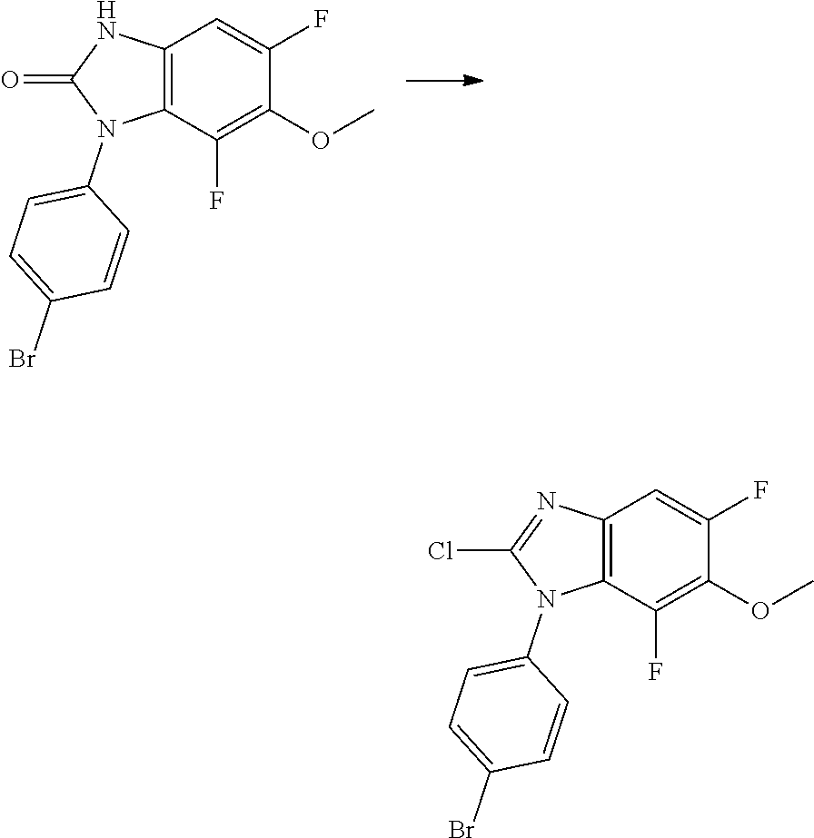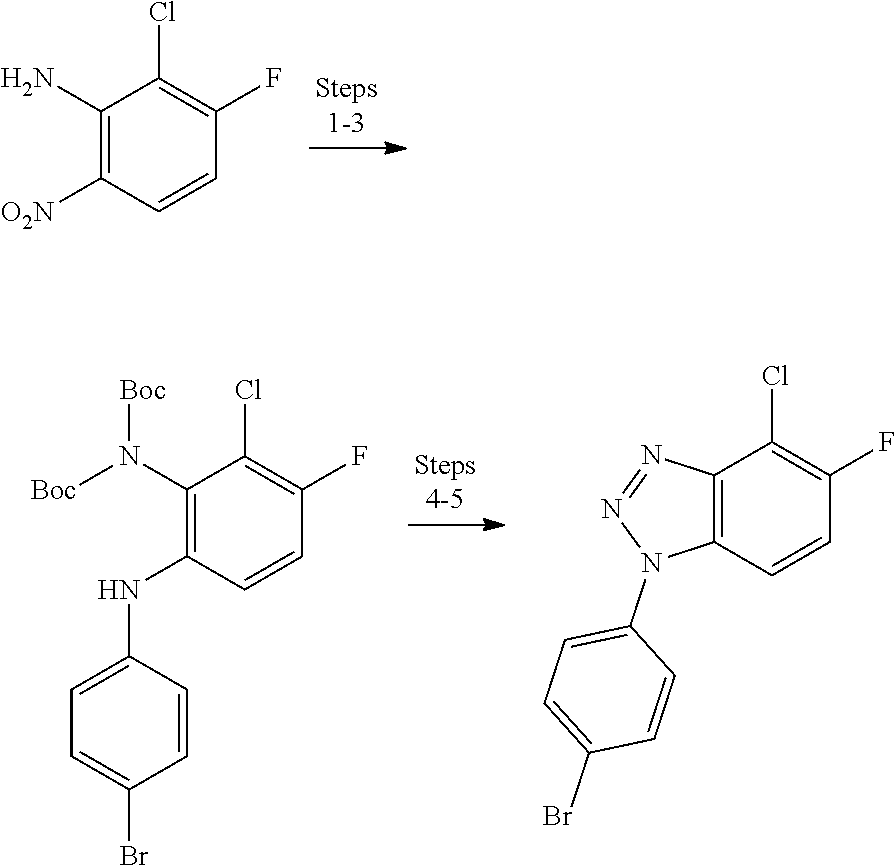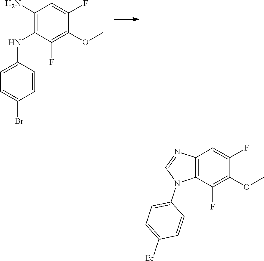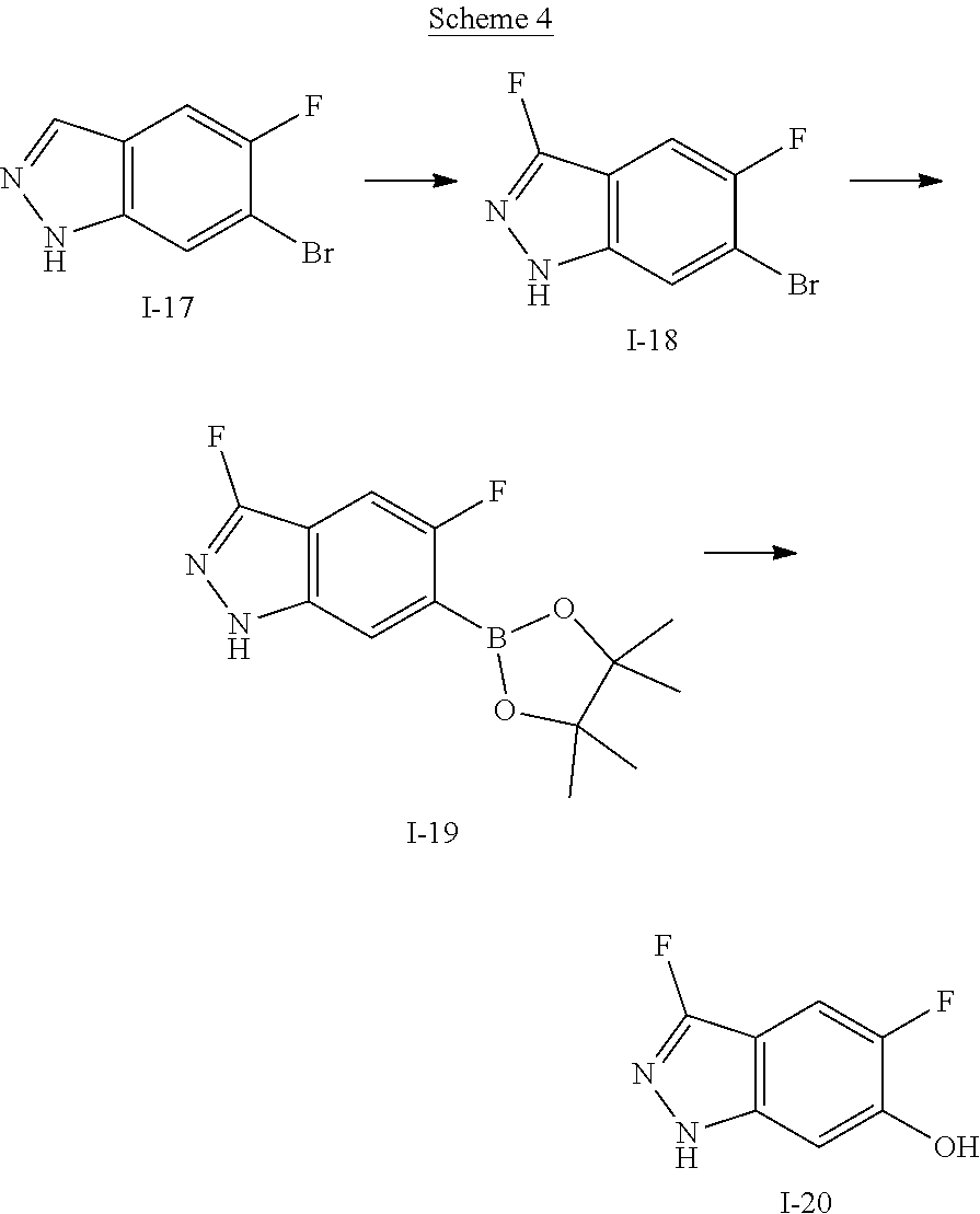 13.13 1-(4-Bromophenyl)-7-chloro-5- fluoro-6-(methoxymethoxy)-1H- indazole 385.0 13.2 1-(4-Bromophenyl)-5-fluoro-6- (methoxymethoxy)-4- (trifluoromethyl)-1H-indazole 419.0 13.34 6-(Benzyloxy)-1-(4- bromophenyl)-1H-indazole 378.9 13.41,4 6-(Benzyloxy)-1-(6-bromopyridin- 3-yl)-5,7-difluoro-1H-indazole 416.0 13.54 1-(4-Bromophenyl)-7-fluoro-6- methoxy-1H-indazole 320.8 13.64 1-(4-Bromophenyl)-5-fluoro-6- methoxy-1H-indazole 320.9 13.74 1-(4-Bromo-2-methylphenyl)-5- fluoro-6-methoxy-1H-indazole 334.9 13.84 1-(6-Bromopyridin-3-yl)-5-fluoro- 6-methoxy-1H-indazole 321.8 13.92,4 1-(5-Bromopyridin-2-yl)-5-fluoro- 6-methoxy-1H-indazole 321.8 13.10 1-(4-Bromophenyl)-5-fluoro-6- (methoxymethoxy)-7-methyl-1H- indazole 365.1 13.114 6-(Benzyloxy)-1-(4- bromophenyl)-5-fluoro-1H- indazole-7-carbonitrile 422.1 Alternate conditions: Step 1: MOM-Cl added at 0° C. Step 2: 16-64 h; in some instances, additional boronic acid, Cu(OAc)2, and pyridine were needed for full conversion; 1DCE, 80° C., ON; 2CH2Cl2, rt, 64 h then DMF, 110° C., 41 h. 3Isolated as a mixture of N1/N2 isomers. 4Step 2 only. Intermediate 14