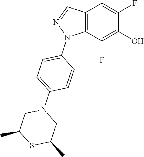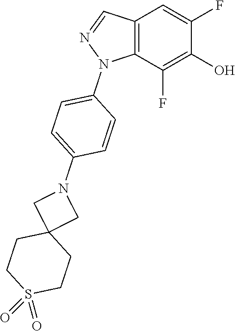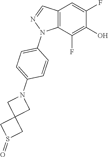 32.1 2-(4-(5,7-Difluoro-6-hydroxy-1H- indazol-1-yl)phenyl)-7-thia-2- azaspiro[3.5]nonane 7-oxide 404.1 32.2 6-(4-(5,7-Difluoro-6-hydroxy-1H- indazol-1-yl)phenyl)-2-thia-6- azaspiro[3.3]heptane 2-oxide 375.9 32.3 4-(4-(5,7-Difluoro-6-hydroxy-1H- indazol-1-yl)phenyl)-2,6- dimethylthiomorpholine 1-oxide 392.0 32.41 1-(4-(cis-2,6- Dimethylthiomorpholino)phenyl)- 5,7-difluoro-1H-indazol-6-ol 376.1 32.51 1-(4-(trans-2,6- Dimethylthiomorpholino)phenyl)- 5,7-difluoro-1H-indazol-6-ol 376.0 Alternate conditions: Step 1: 1-4 h. Step 2: for sulfoxides: 15 min-4 h; m-CPBA added at-78° C. or 0° C. 1No oxidation step; cis/trans isomers separated by reverse-phase HPLC. Compound 33