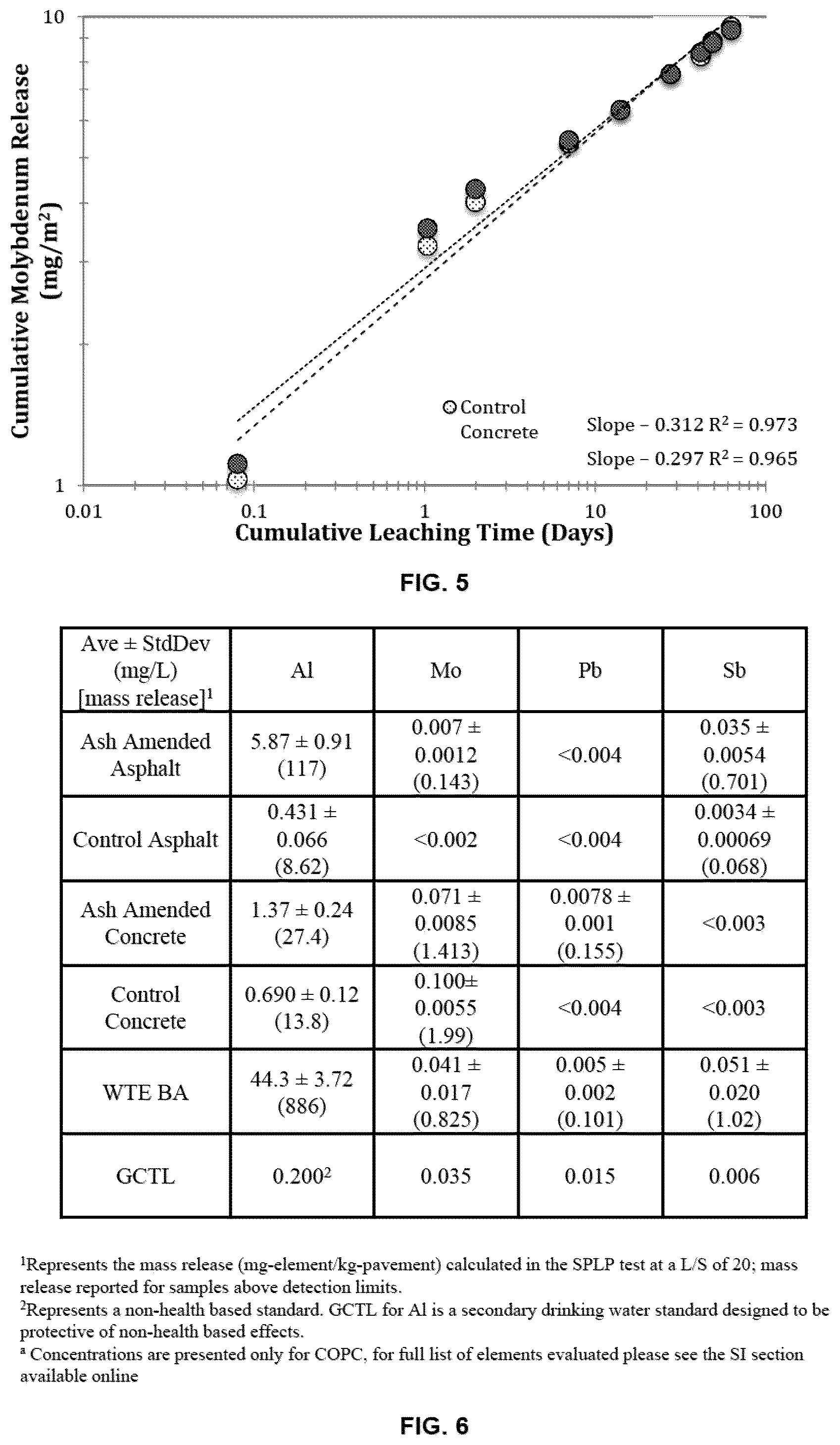 FIG. 5 illustrates log-log comparison of the cumulative release of molybdenum (Mo) from concrete pavements (mg/m2) and leaching according to method 1315.