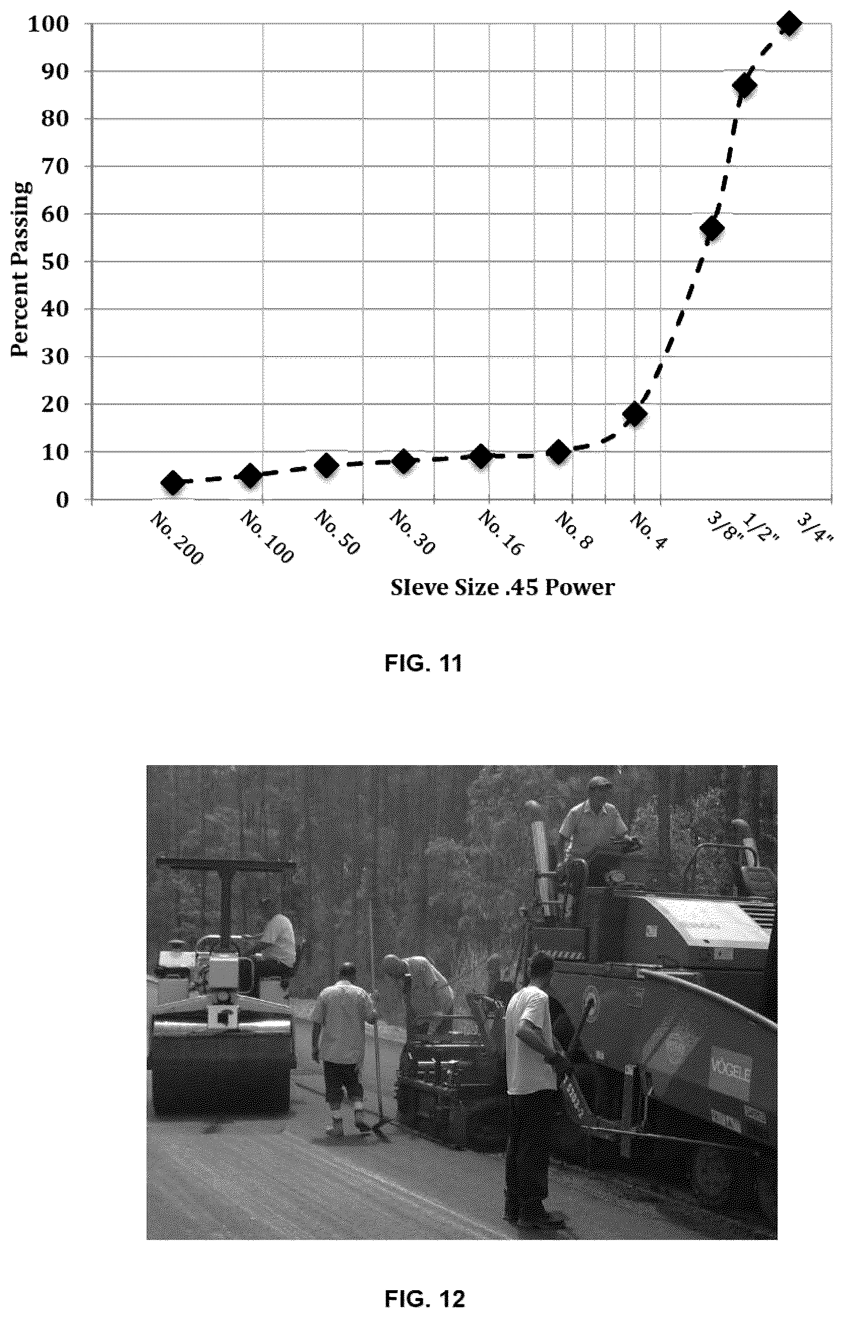 FIG. 11 shows grain size distribution of WTE bottom ash (WTE BA) used in embodiments of pavement samples.