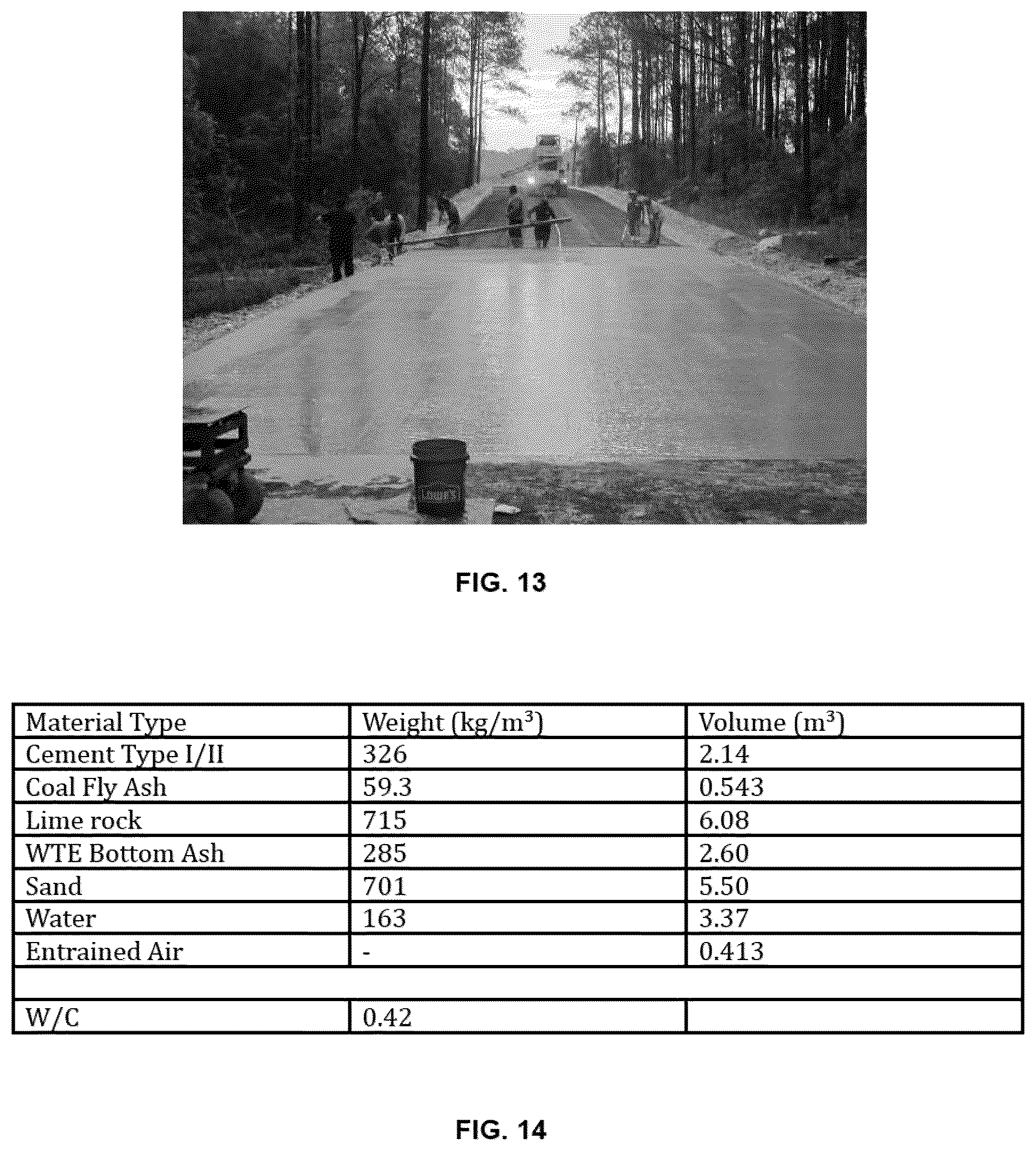 FIG. 14 depicts embodiments of mix design of ash-amended pavements.