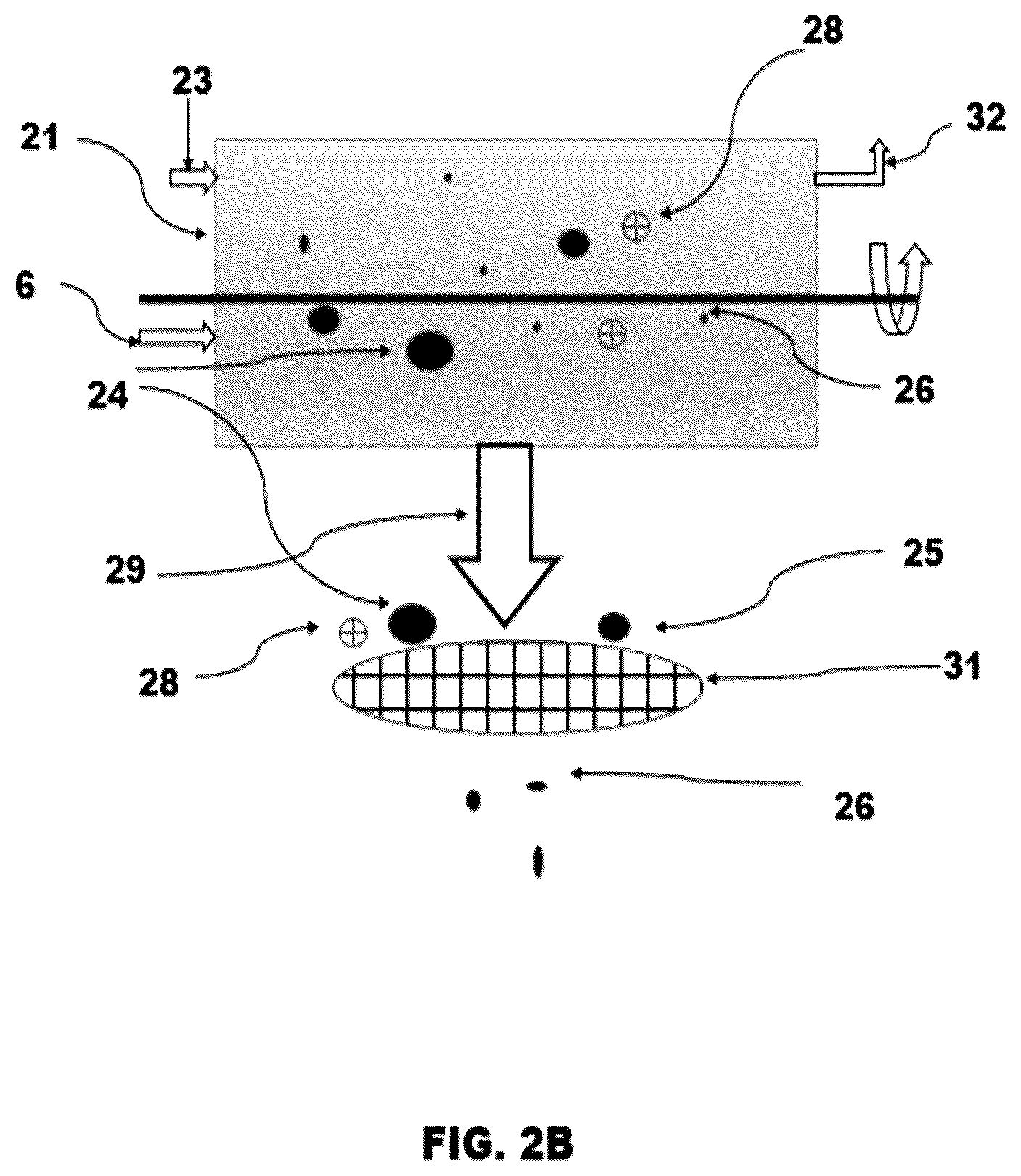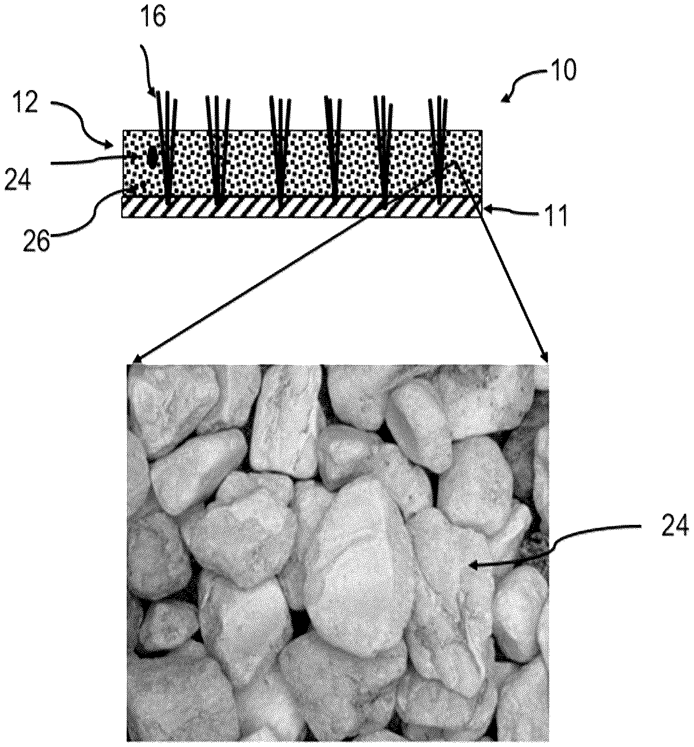 Referring to This embodiment, (with or without the component ‘b’) is advantageous because the mixture is applied on the carrier or backing 11 of the artificial turf 40 in a single step and within a short period of use it separates by itself in a stabilization layer 45 comprising primarily olive pit particles 26 and when used the microporous zeolite particles 28, and a performance layer 45 comprising primarily of the rounded and thermally treated olive pit fragments 24. The microporous zeolite particles 28 of the component b, when used, they separate also with the main bulk of it settling primarily within the stabilization layer 45. The microporous zeolite particles 28 provide a cooling effect in the infill of the artificial turf 40 and can also help the artificial turf stay drier in a rainy day because of their ability to soak water (through absorption) due to their microporous structure. The result is an artificial turf with less variable performance characteristic between warm, sunny days and cooler rainy days. Thus, the proposed infill comprising components a, b and c is advantageous because: