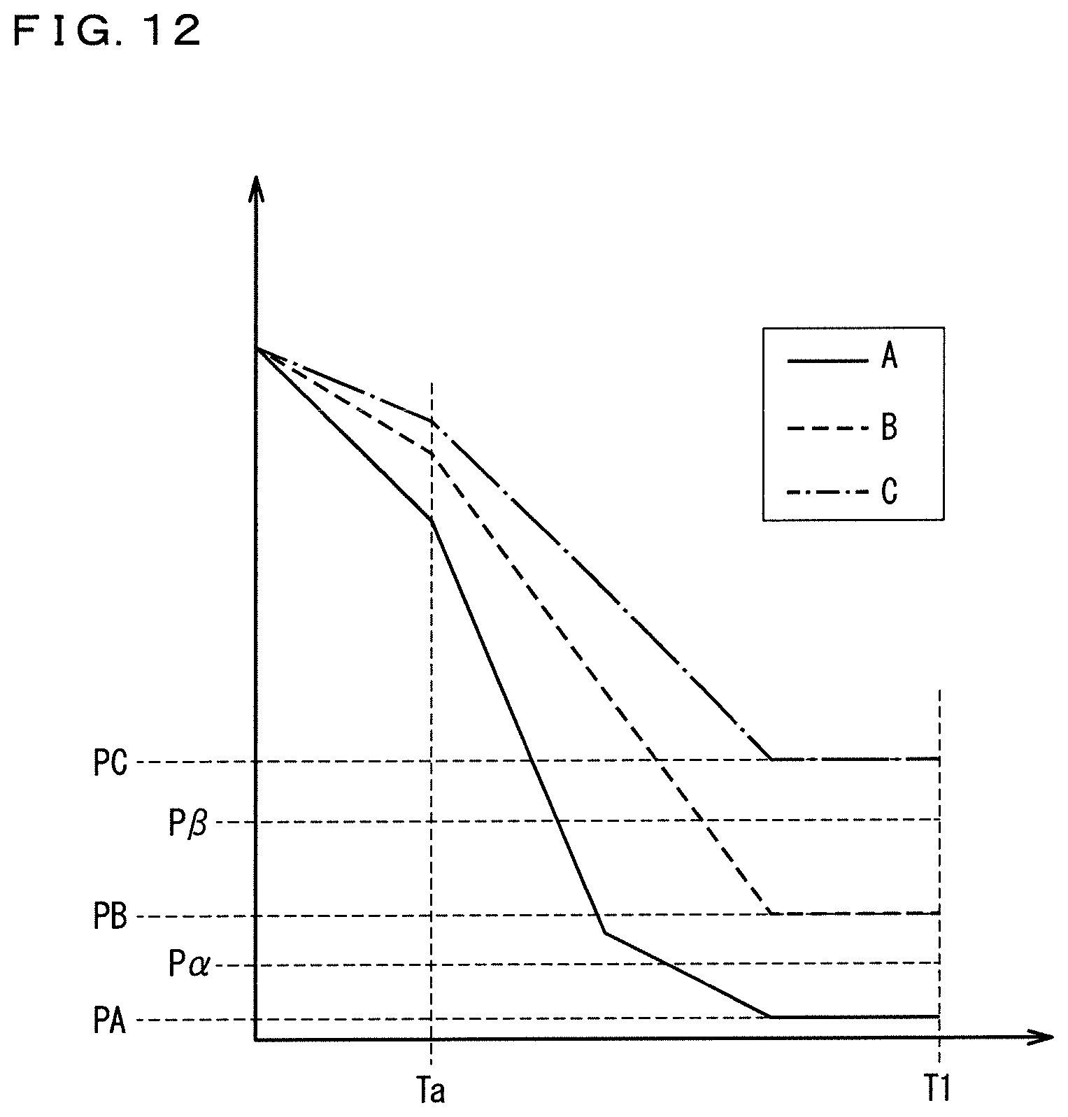 On the other hand, when the pressure after the first time period T1 is equal to or greater than the second threshold (Pβ) in determination in step S16, it is determined that “the leak is present” (step S18). For example, an alternate long and short dashed line C shown in FIG. 12 decreases only to a pressure PC in the first time period T1. The pressure PC is equal to or greater than the second threshold (Pβ). That is to say, since the pressure becomes equal to or greater than the second threshold (Pβ) in the first time period T1, it is determined that “the leak is present” in the chamber 6. In this case, the display 8 (see FIG. 9) may display an alarm message indicating that “the leak is present”, for example.