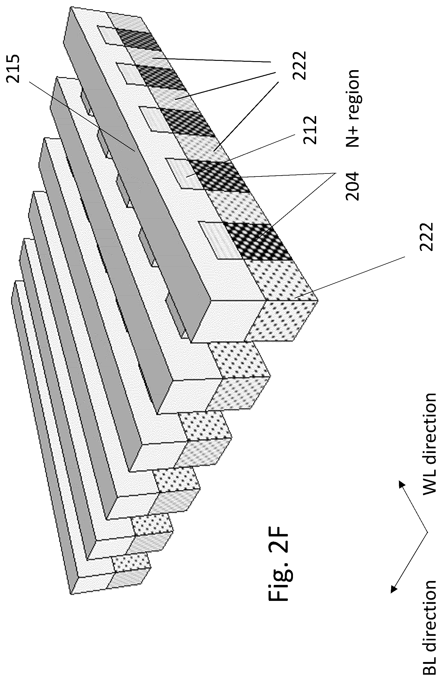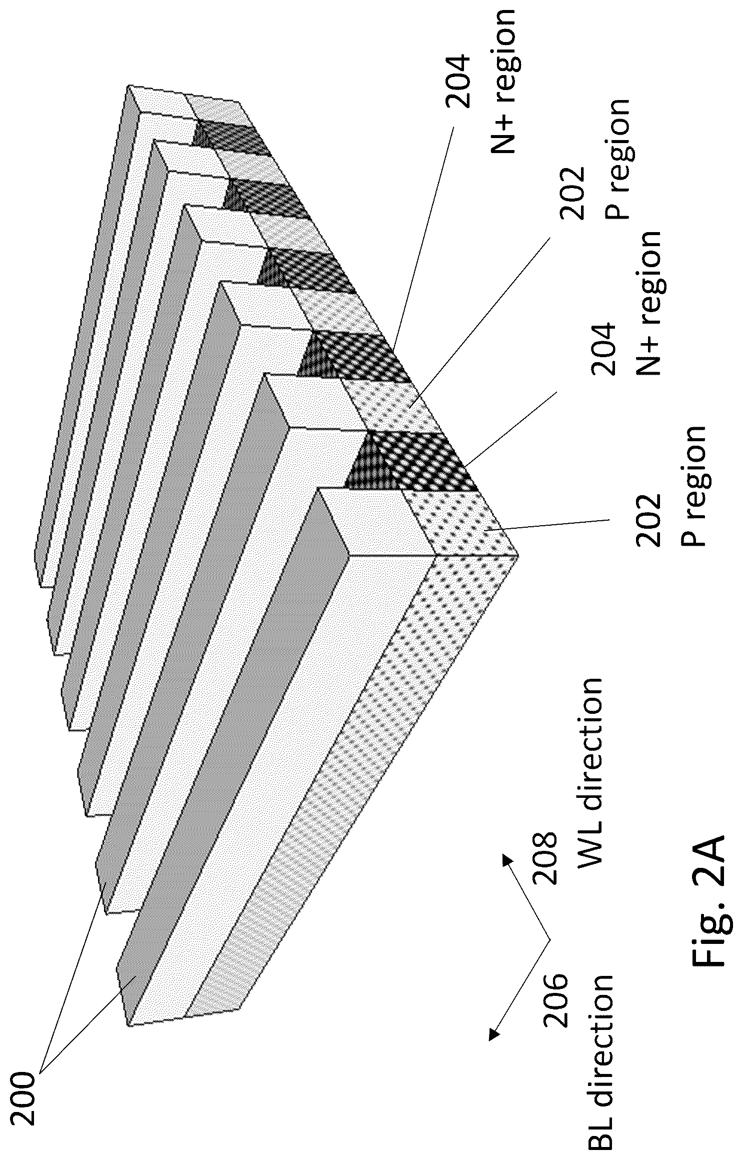[0093]FIG. 2A illustrates a structure of a small portion of an exemplary HD-NOR in a fabrication process. The base silicon may be, for example, a P-doped bulk or an SOI substrate. The base silicon may be patterned with strips of implant masking regions 200 such as silicon oxide to keep the strips under it as P regions 202 (nominally the original P concentration of the base silicon, but may be modified as known in the art via, for example, ion implantation) while the non implant-mask strips in between the strips of implant masking regions 200 may be ion-implanted to form N+ regions 204. Other doping methods, for example, gas phase or solid phase diffusion may be used. These N+ strips of N+ regions 204 may serve as the bit line(s) in one direction, BL direction 206, and also as the future bit cell's source or drain (S/D). The word-lines will be formed later going in an orthogonal direction to BL direction 206, such as WL direction 208. The bulk of the substrate is not shown to simply the drawing.