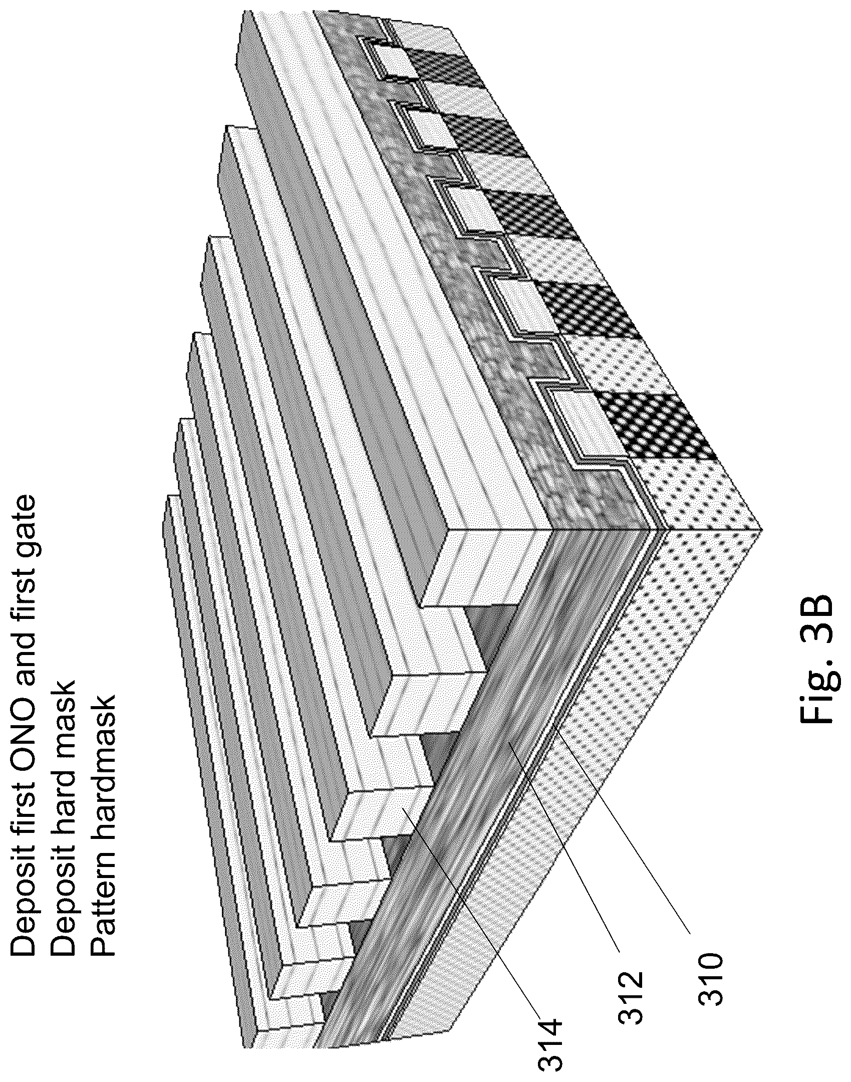 [0304]FIG. 53C illustrates the structure after the formation of Y-strips in the Y direction overlaying the grid of isolation windows 5302. These strips include first an O/N/O-Y charge trap stack 5312 covered by Y-gates 5314 and then covered by hard mask 5316 which could have been used to define the Y strips, using directional etching of the deposited layers elsewhere. It should be noted that the Y strips need to be made a bit smaller than the isolation windows 5302 leaving some window edges 5311 at their sides. This is necessary to avoid that the Y-gate 5314 field penetration and disturb to the channel made along future the X-strip 5322.