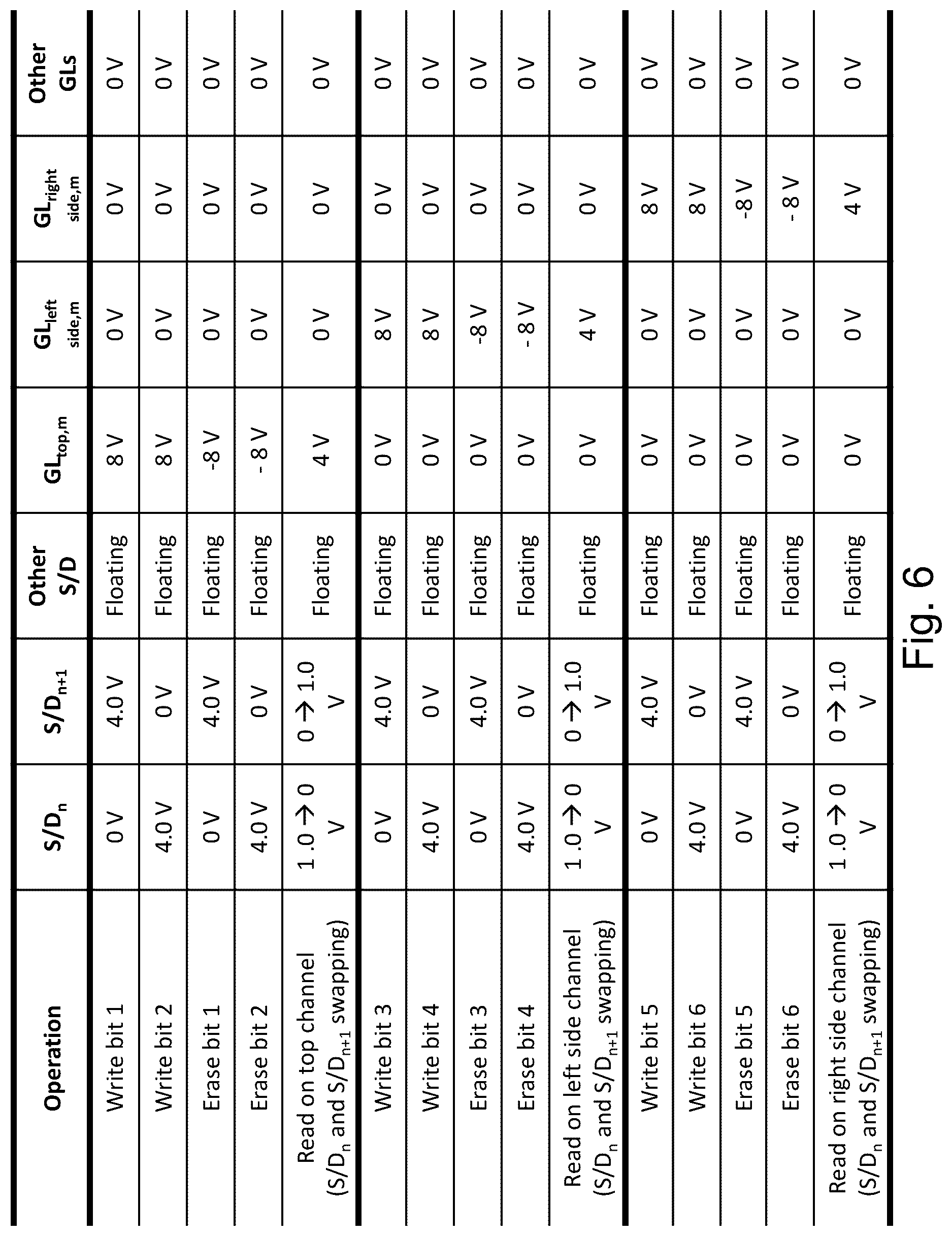 [0023]FIG. 6 is a table of exemplary write, erase or read conditions for the memory cell of FIGS. 5A and 5B;