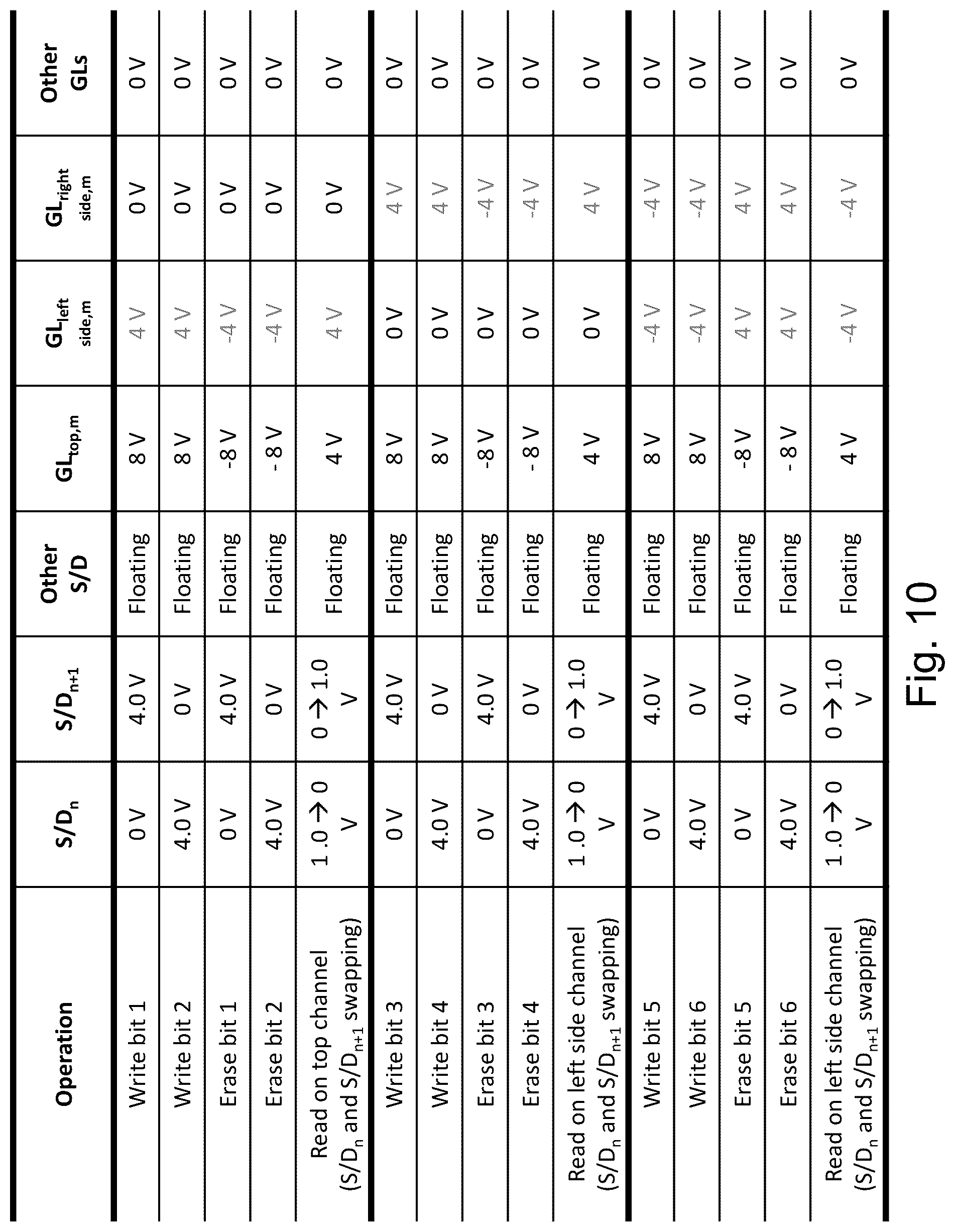 [0027]FIG. 10 is a table of exemplary write, erase or read conditions for the memory cell of FIG. 9;
