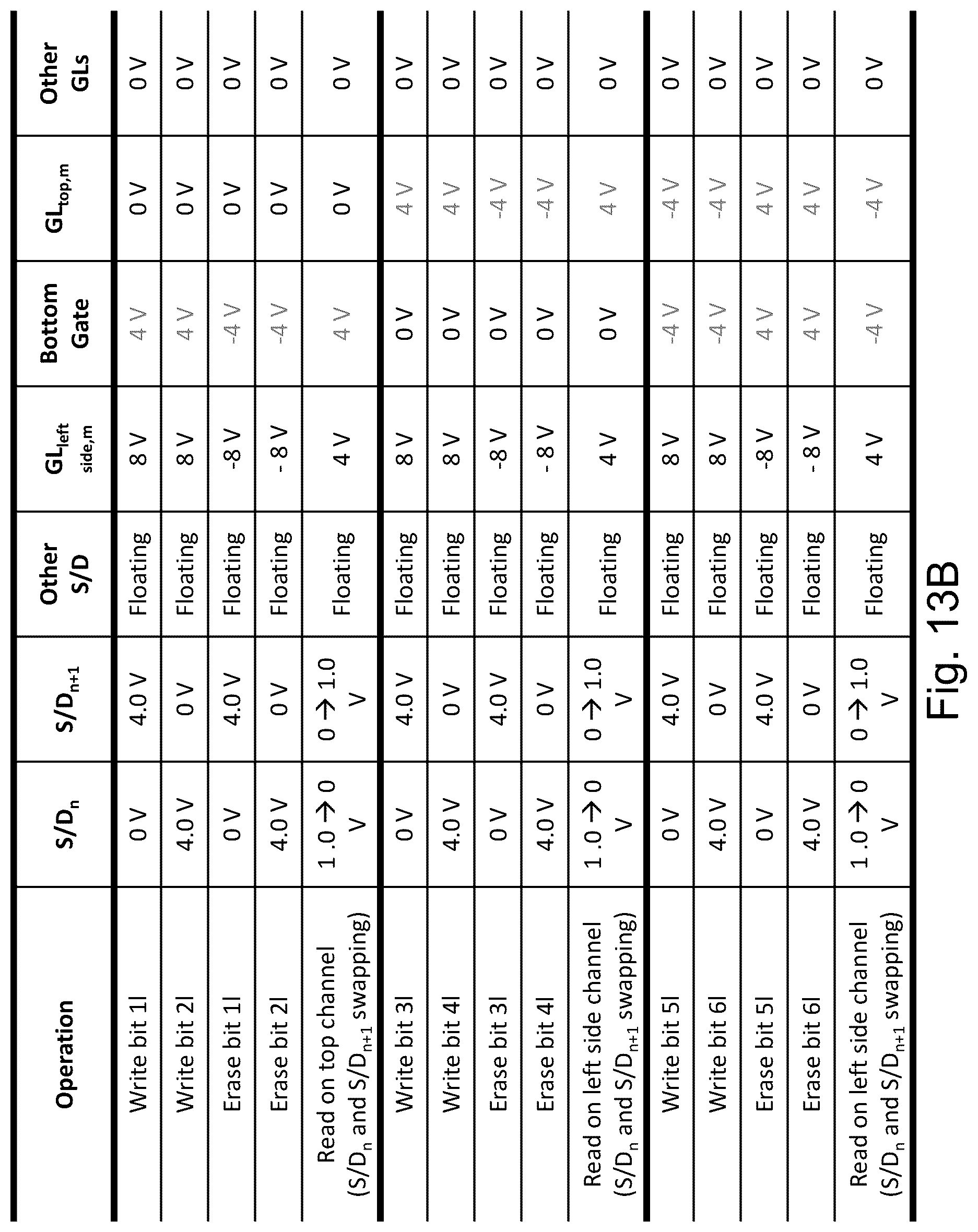 [0030]FIGS. 13A and 13B are tables of exemplary write, erase or read conditions for the memory cell of FIG. 12;