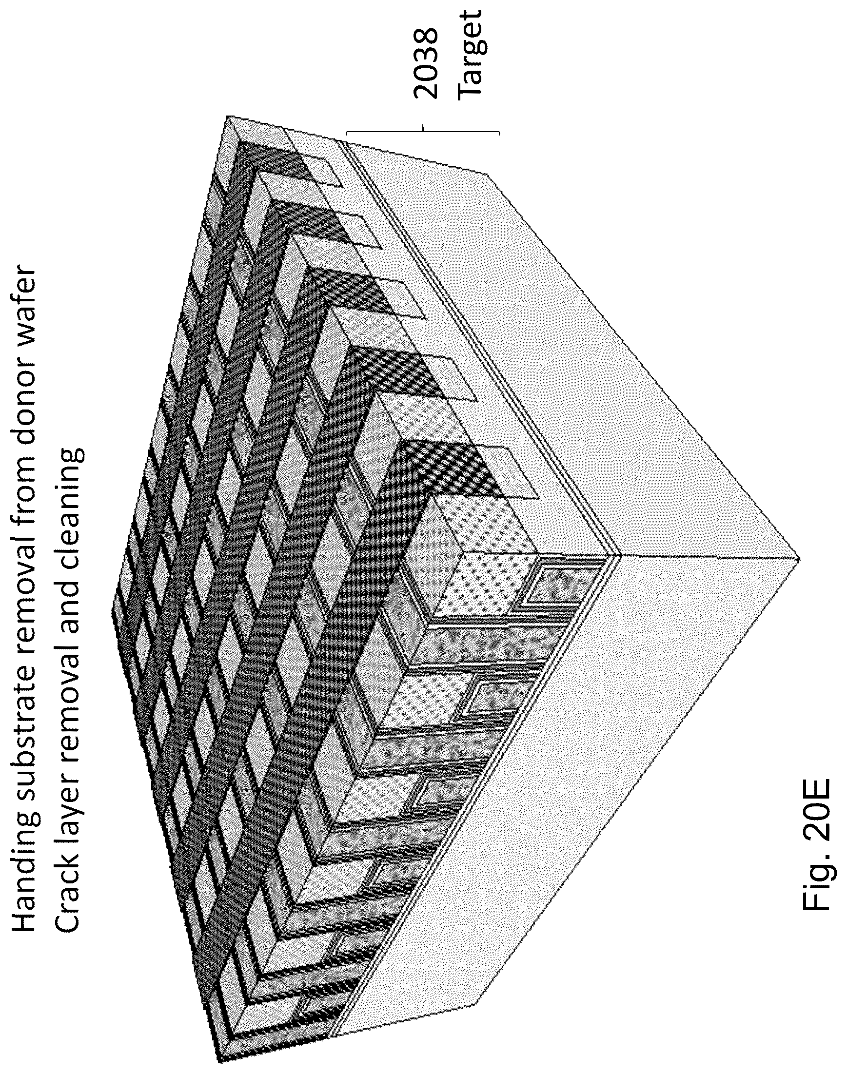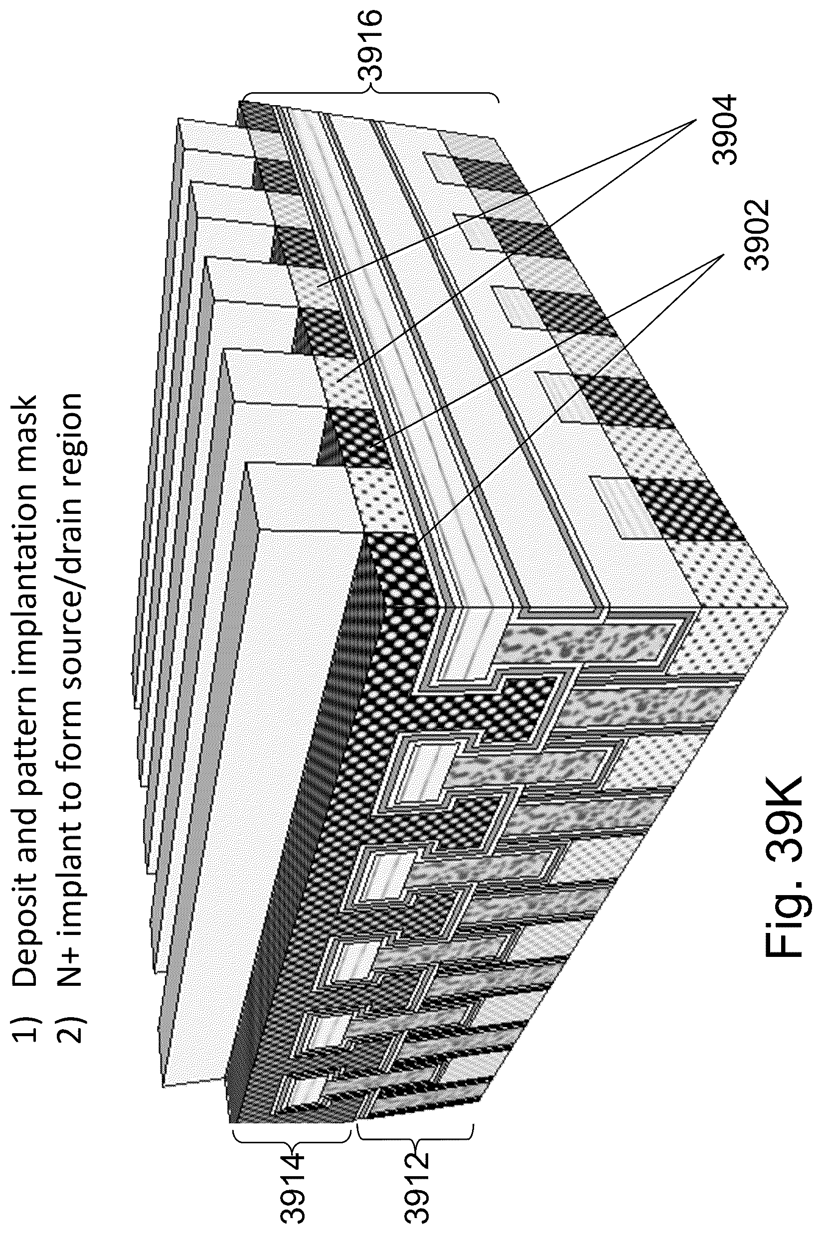 [0250]In alternative variation the structure in FIG. 39K could be processed to keep the N+ 3902 as S/D lines while removing the P− 3904 other than in the channels, resulting with double layer NOR structure which could be used as advance substrate and allow still high temperature (˜500-900° C.) for building on top of it additional circuits. Accordingly the double layered NOR 3916 could be built on silicon 2020 as illustrated in FIG. 20A over a cut porous structure 2032 as an extension of FIG. 20B. It could include a memory as NV memory fabric 3914 and a universal fabric 3912 which be used for NV memory, high speed DRAM, logic fabric and/or programmable logic fabric as was described herein.