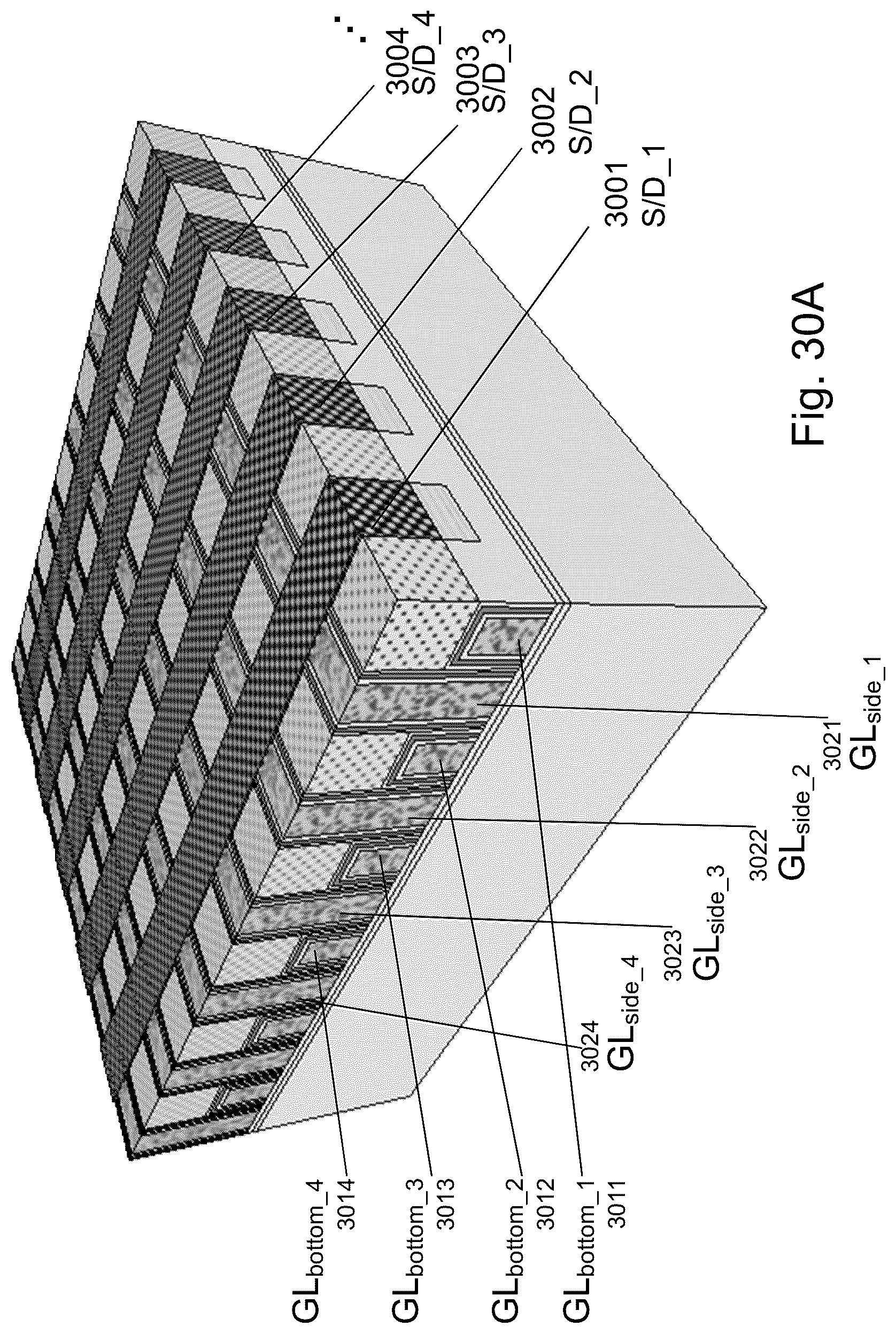 [0300]The units 5104 and/or 5204 could be designed to provide the proper signals as was described herein for the word-line, bit-line operations of the NOR memory including such that were described in respect to FIG. 25 to FIG. 29B. Those signal could be routed to the acting S/D line and acting gate-lines using architectures as presented in respect to FIG. 51A to FIG. 52B.
