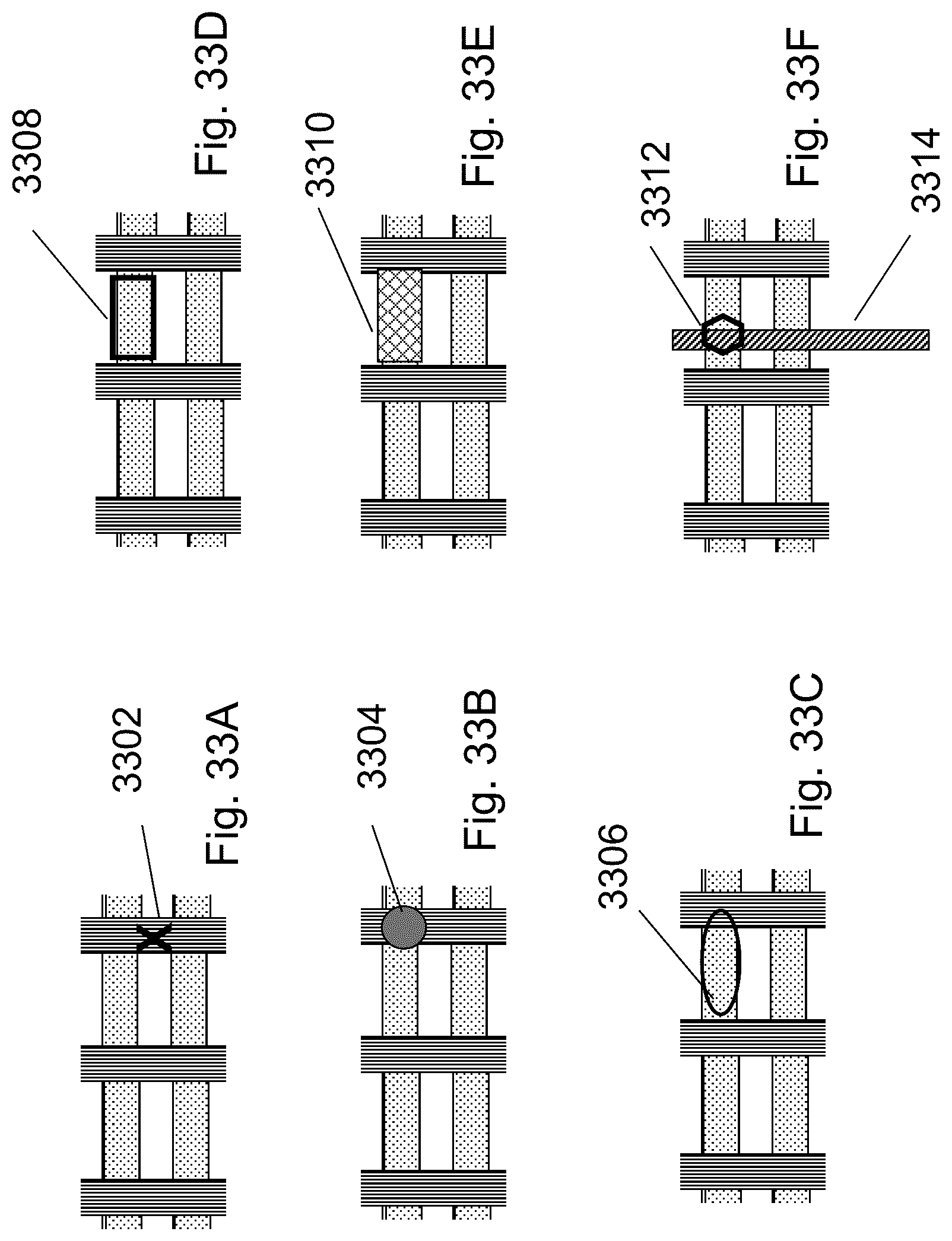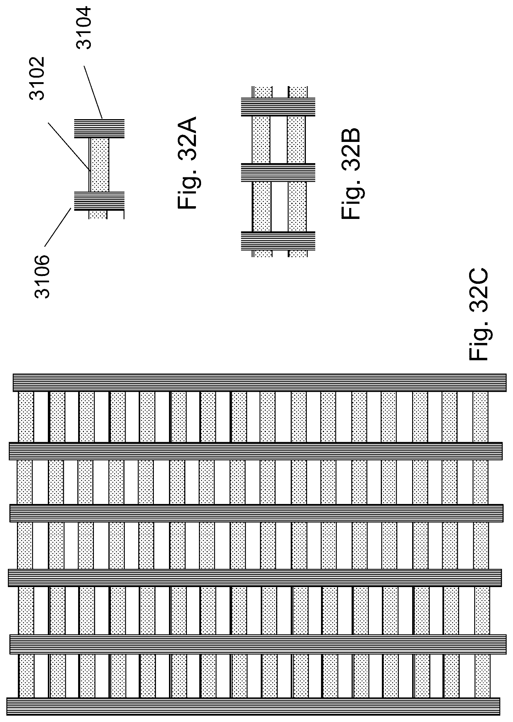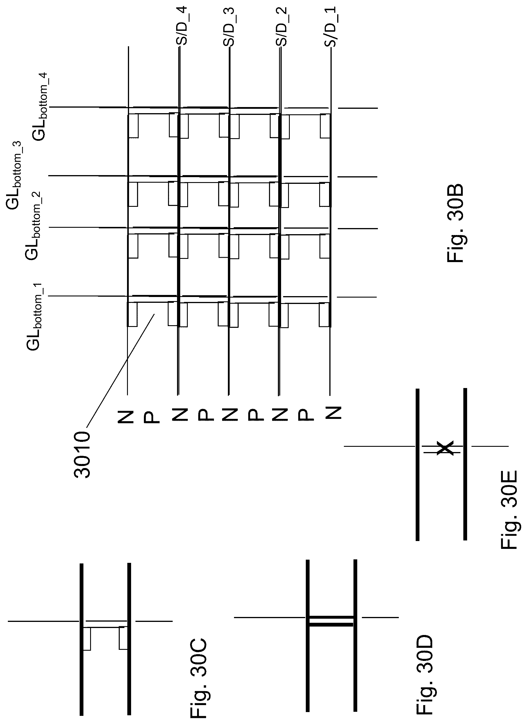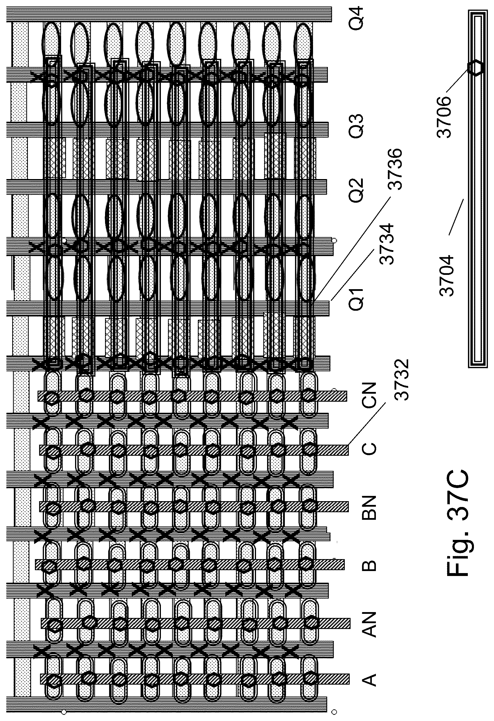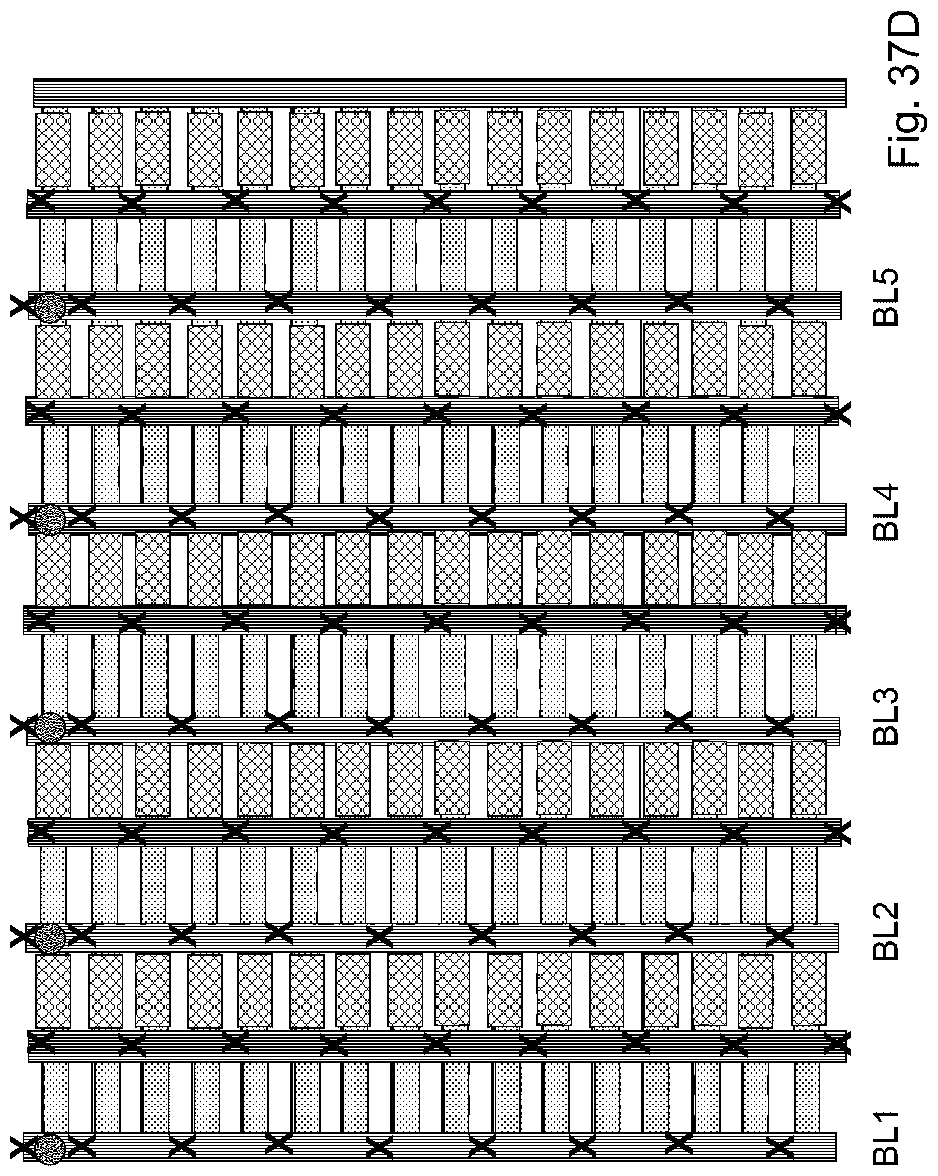 [0309]Accordingly the programming option presented herein in respect to drawings: FIG. 32A-FIG. 37E could be applied to the—Checker board Fabric—with one change, instead of FIG. 33A being cut by etch it could be implemented electrically by programming the corresponding Y-transistor to be always off.